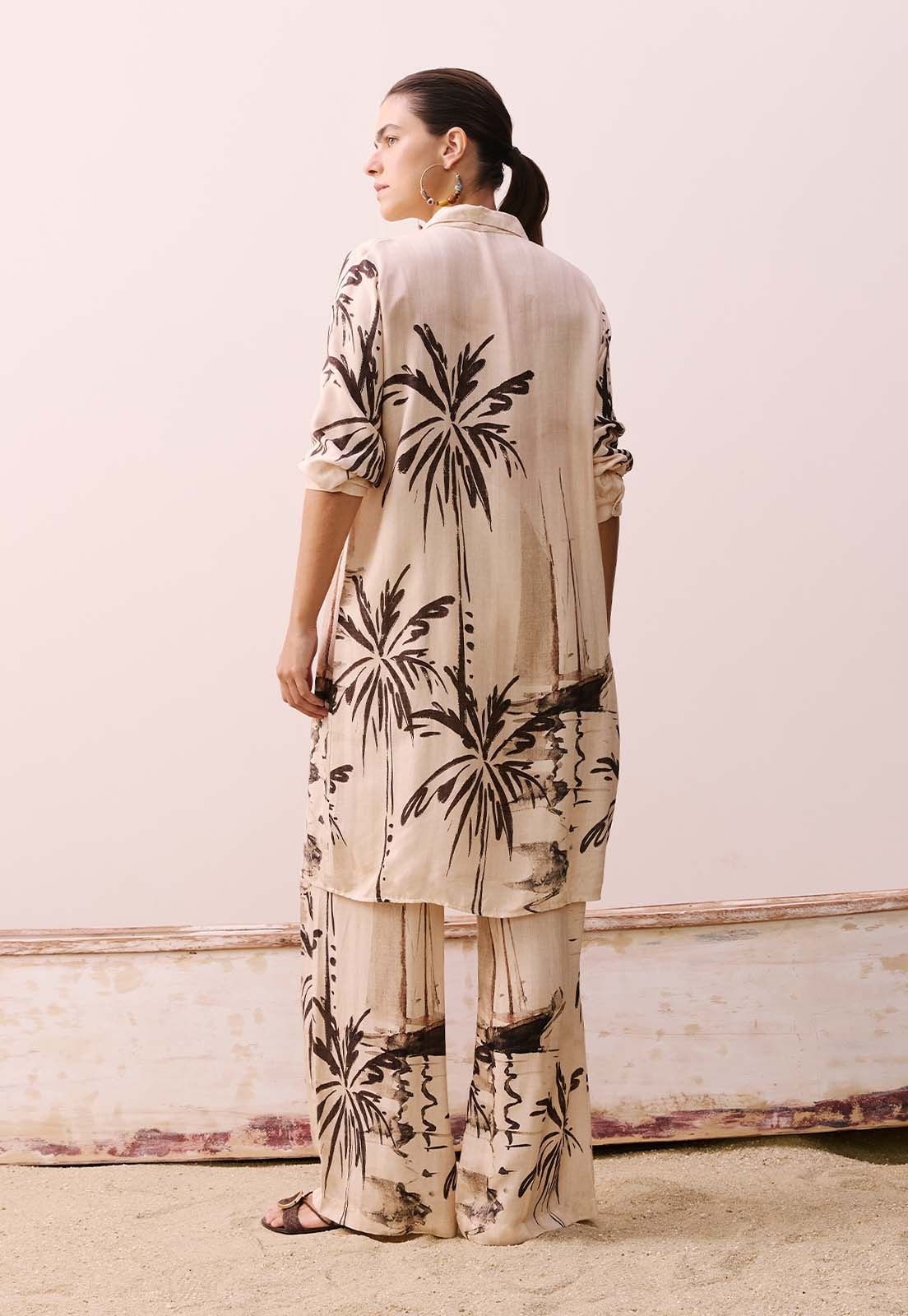 A Chemise Alongada Estampada Navegar da CaCay é a escolha perfeita para quem busca leveza, sofisticação e versatilidade em uma única peça. Com modelagem reta e caimento fluido, ela valoriza diferentes silhuetas e proporciona conforto absoluto graças à composição de 97% viscose e 3% linho. Seu design tropical é marcado por uma estampa de palmeiras distribuída de forma elegante, criando um visual harmônico e atemporal. Os botões frontais e a parte traseira levemente mais longa adicionam movimento e estilo à peça, ideal para ocasiões que vão do casual chic ao resort wear.