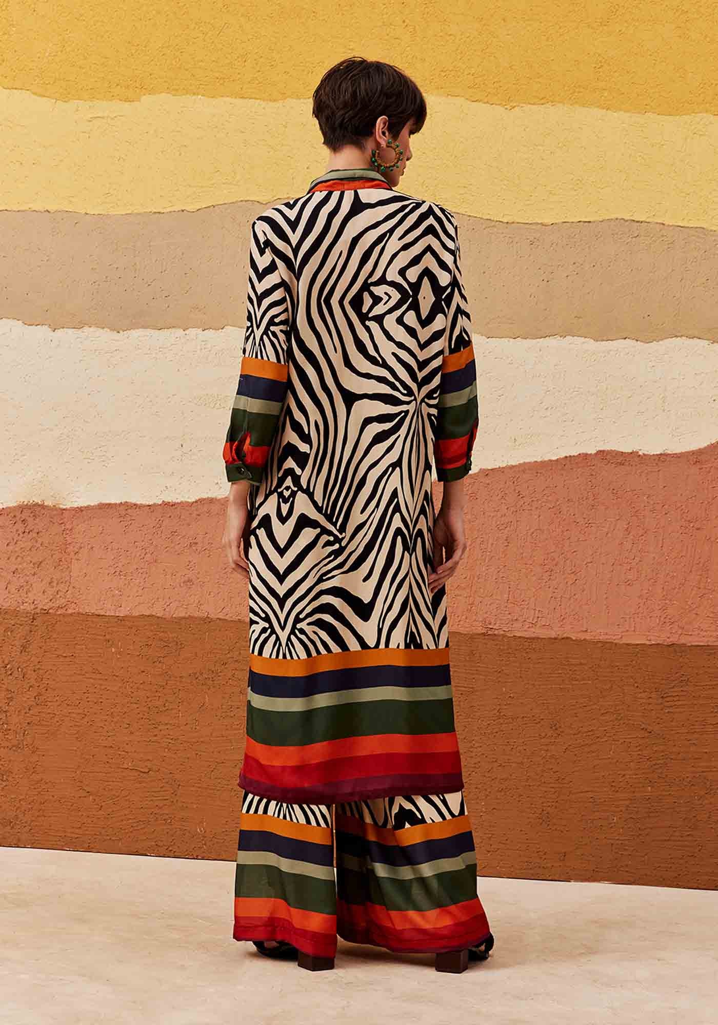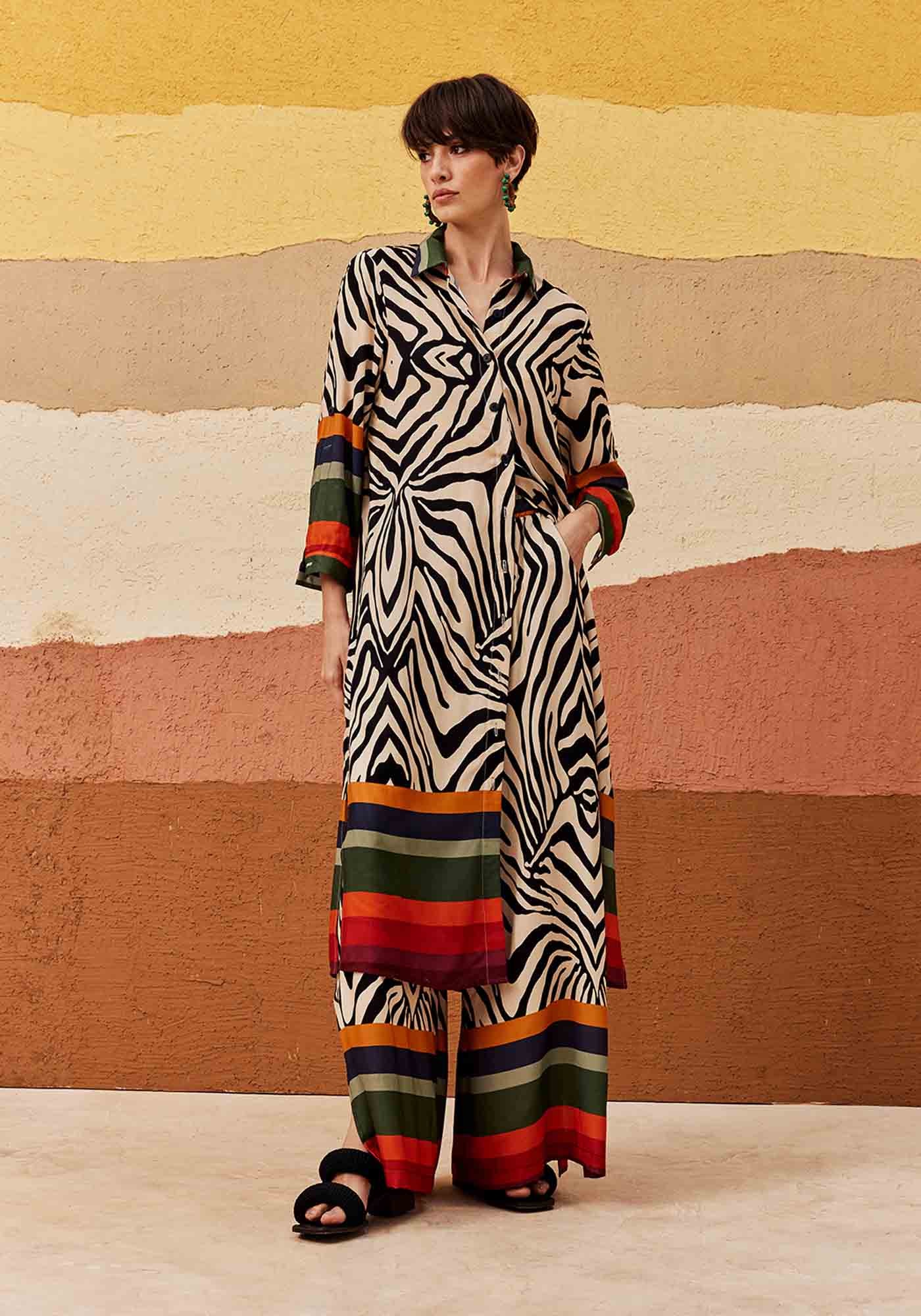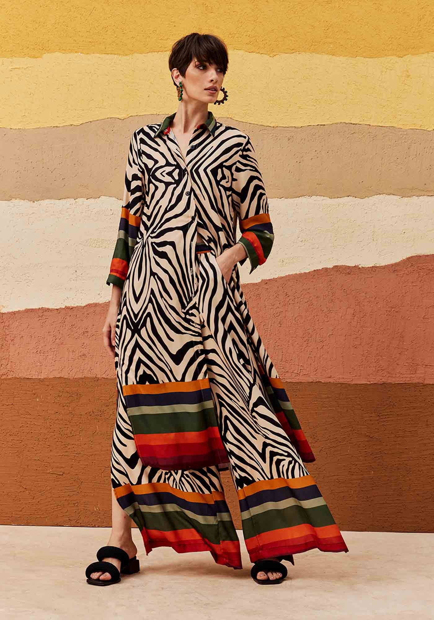 Confeccionadoem tecido 100% viscose, o chemise virou uma coringa no guarda-roupa. O modelo podeser usado de diferentes formas: como sobreposição em um look, como peça únicaou parte de cima combinada com outra peça. O chemise possui abotoamento frontale manga longa, além das fendas laterais, que dão movimento e fluidez. A estampaZebra Color combina o padrão clássico P&B do animal print com o barrado coloridoe moderno.