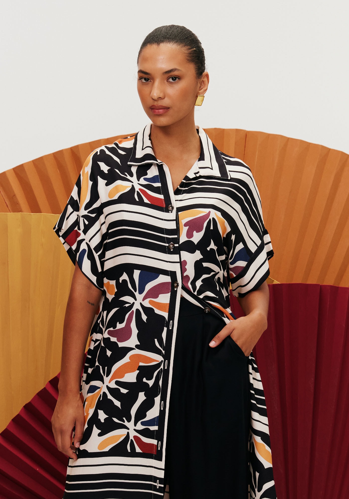 AChemise é uma peça que chegou para ficar. Versátil, pode ser pode ser usadacomo parte de cima ou vestido. Confeccionada em tecido 100% viscose, o modelo possui comprimento longo com golinha eabotoamento frontal.A estampa Mambo é moderna e mistura elementos florais com linhasverticais e horizontais em P&B.