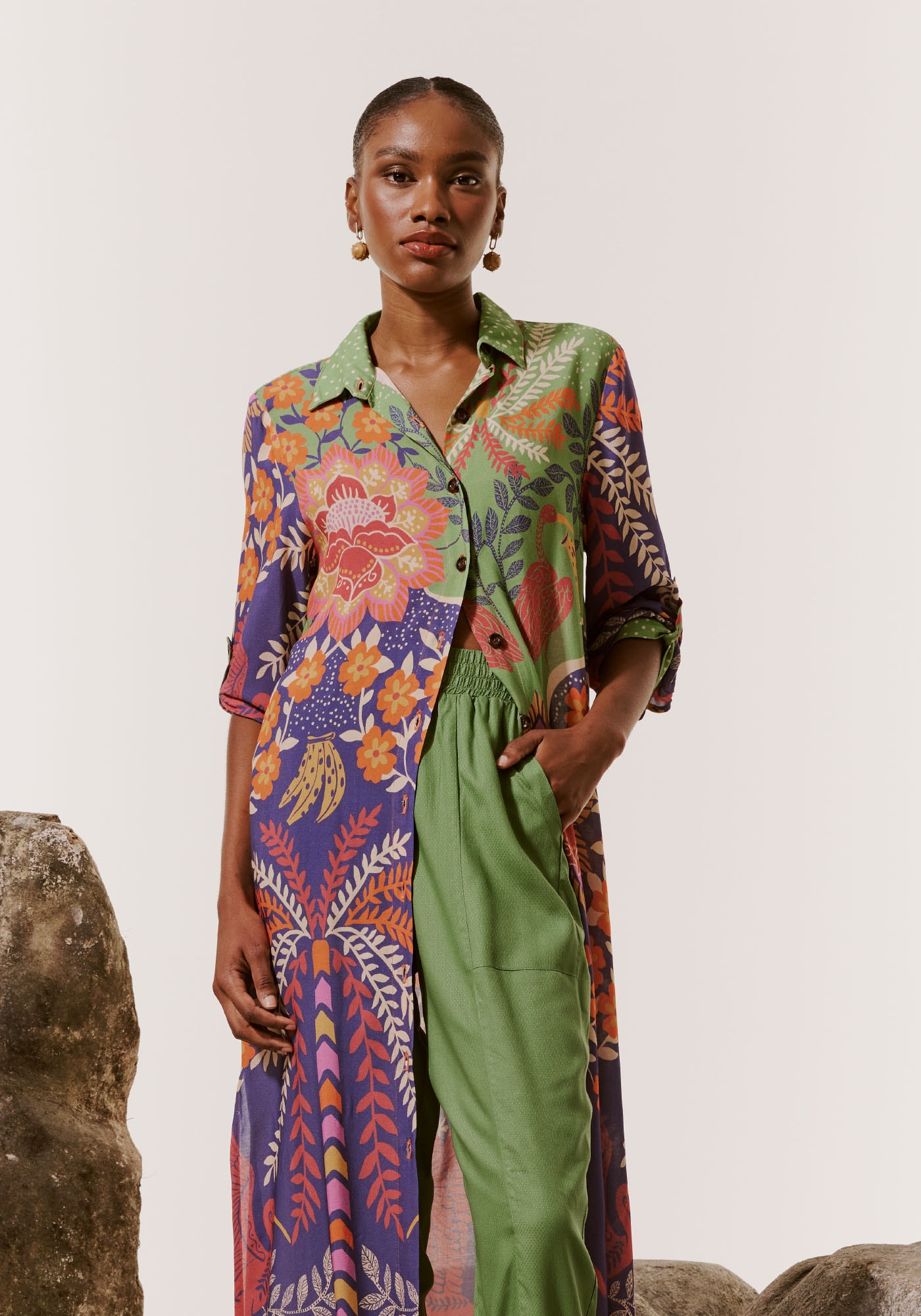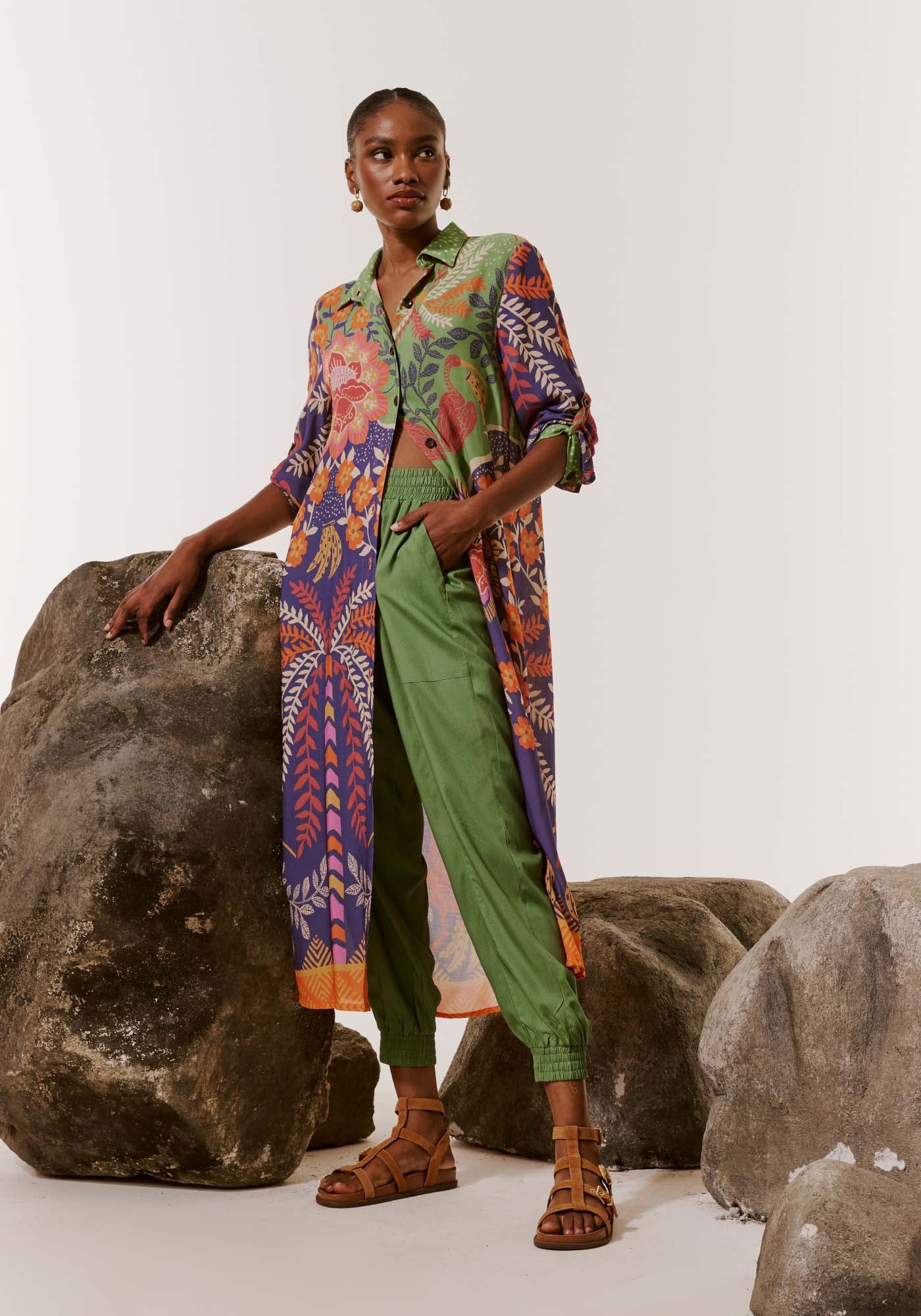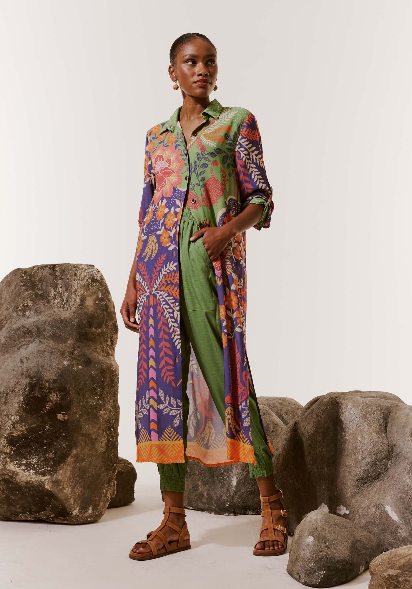 A Chemise é um modelo que chegou para ficar! Versátil eestilosa, pode ser usada como uma peça única ou para compor um look. Aestampa Copaíba é vibrante e alegre e possui uma mistura de elementos como opoá, a fauna e a flora.