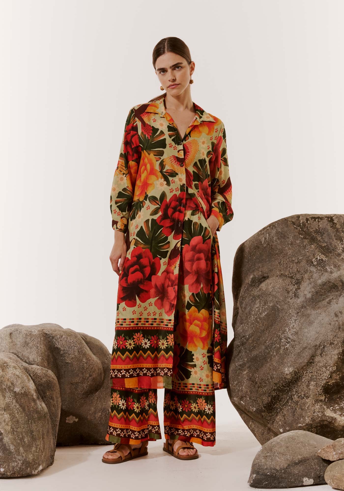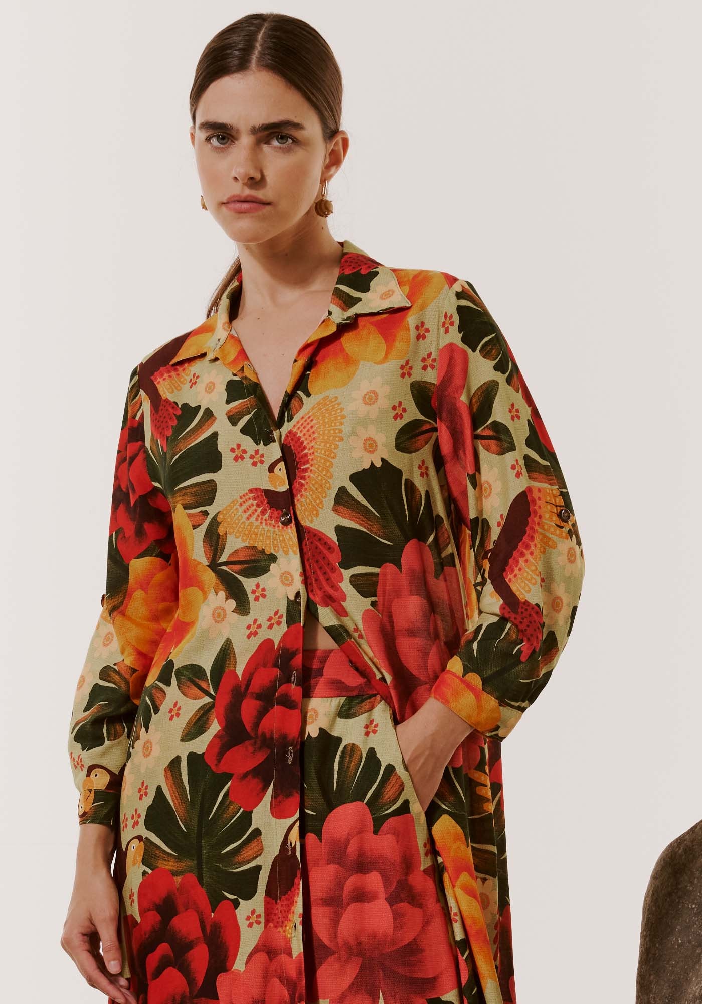 A Chemise é uma peça que vem ganhando cada vez mais destaque.Versátil, pode ser usado como vestido ou junto com outra peça formando umconjuntinho. A estampa Aroeira é alegre e vibrante.