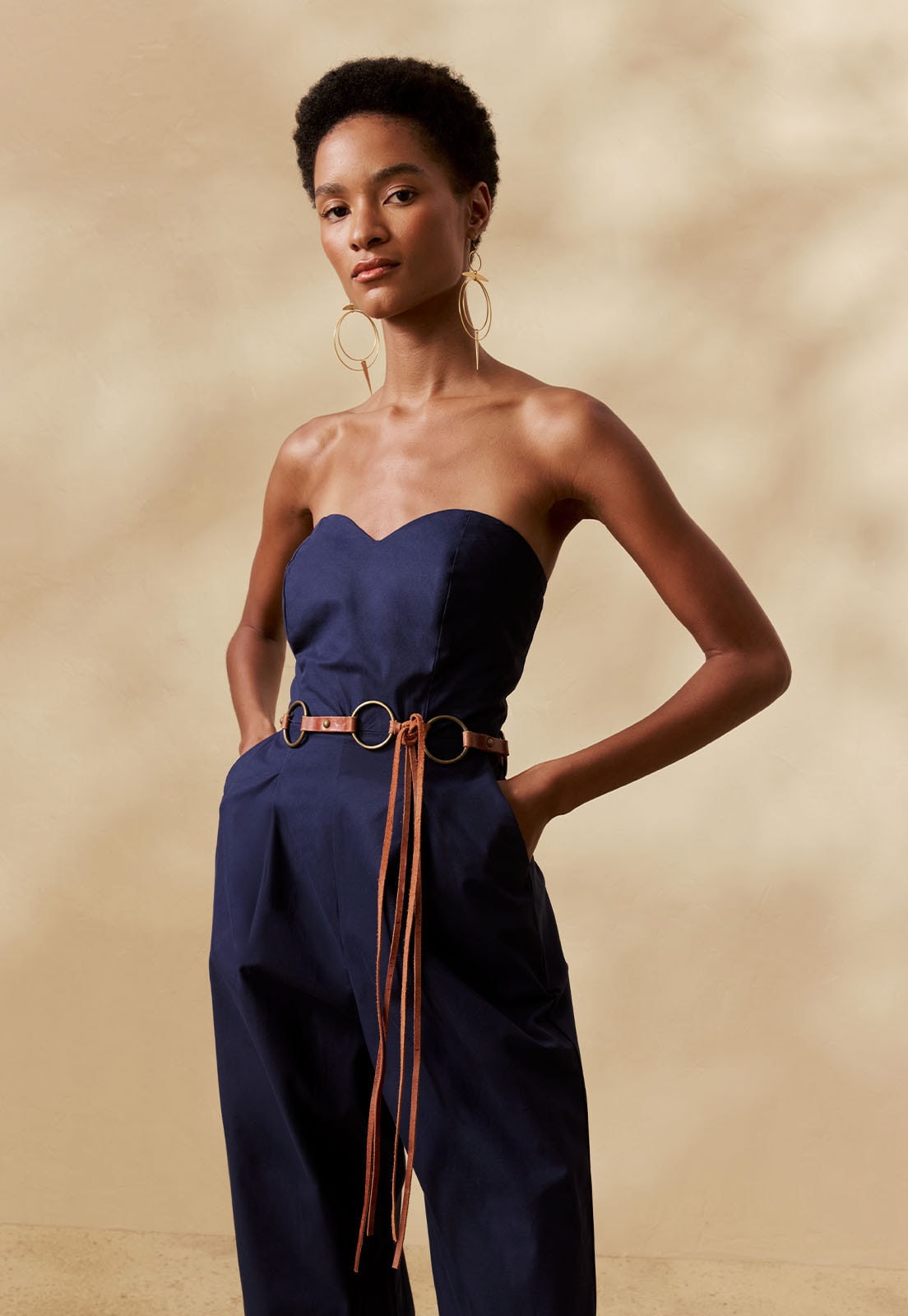 O Cinto Argolas Amarração Couro da CaCay tem modelagem ajustável e marcante, pensado para definir a silhueta com elegância e praticidade. O caimento acontece principalmente na cintura, com possibilidade de uso mais alto ou levemente deslocado para o quadril, graças à amarração que permite regulagem personalizada.