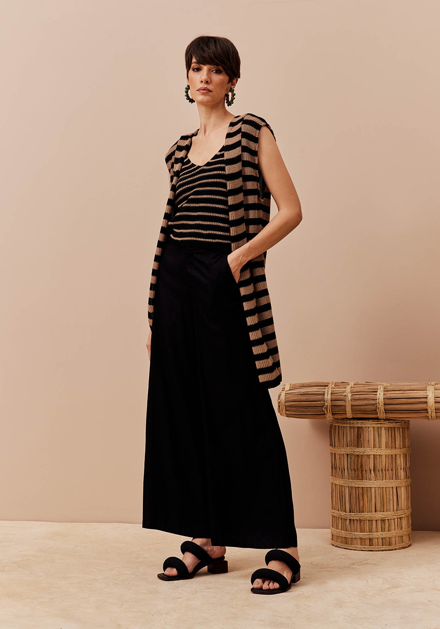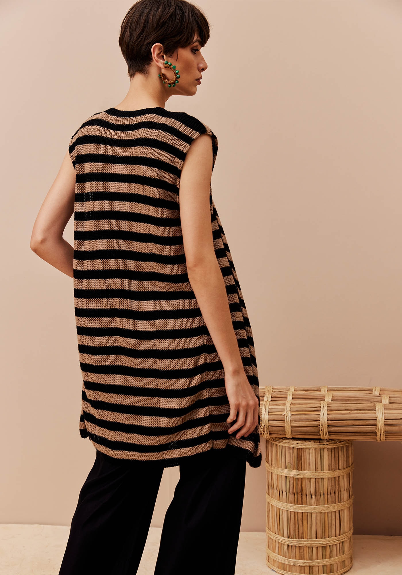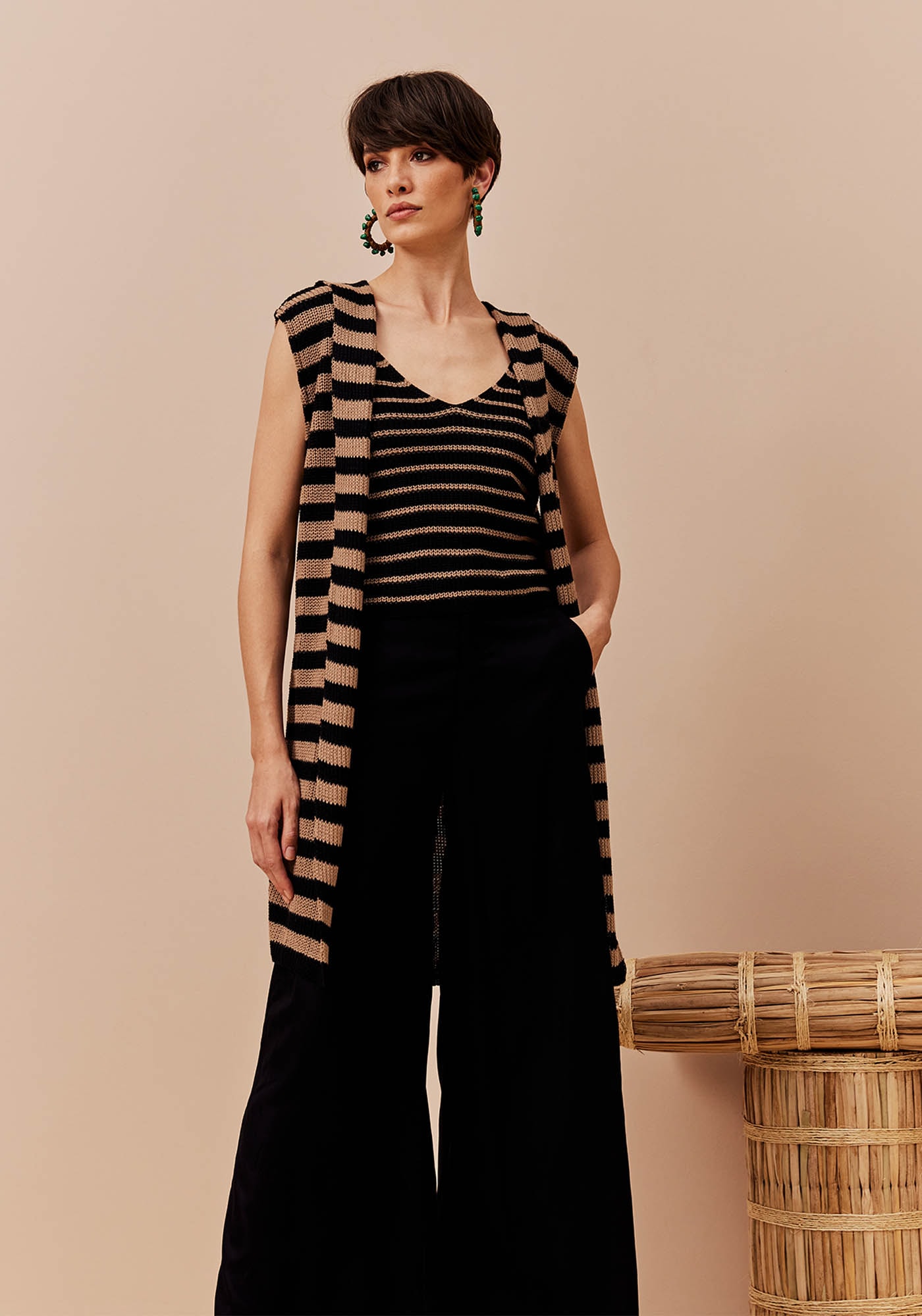 Ocolete é uma opção estilosa de sobreposição. O modelo listrado é um clássicoque ganha uma nova cara no tricot. Com modelagem alongada sem manga, é o complementoperfeito para looks invernais.