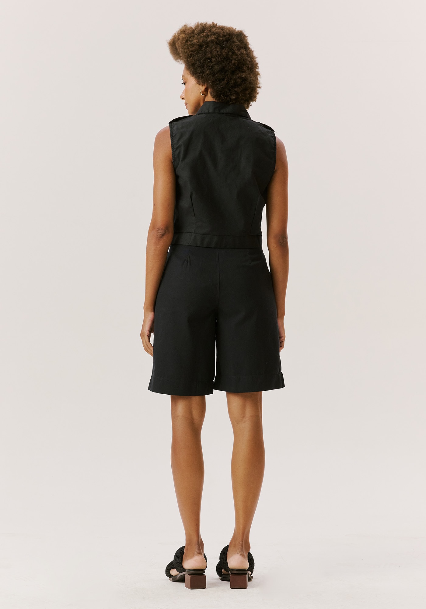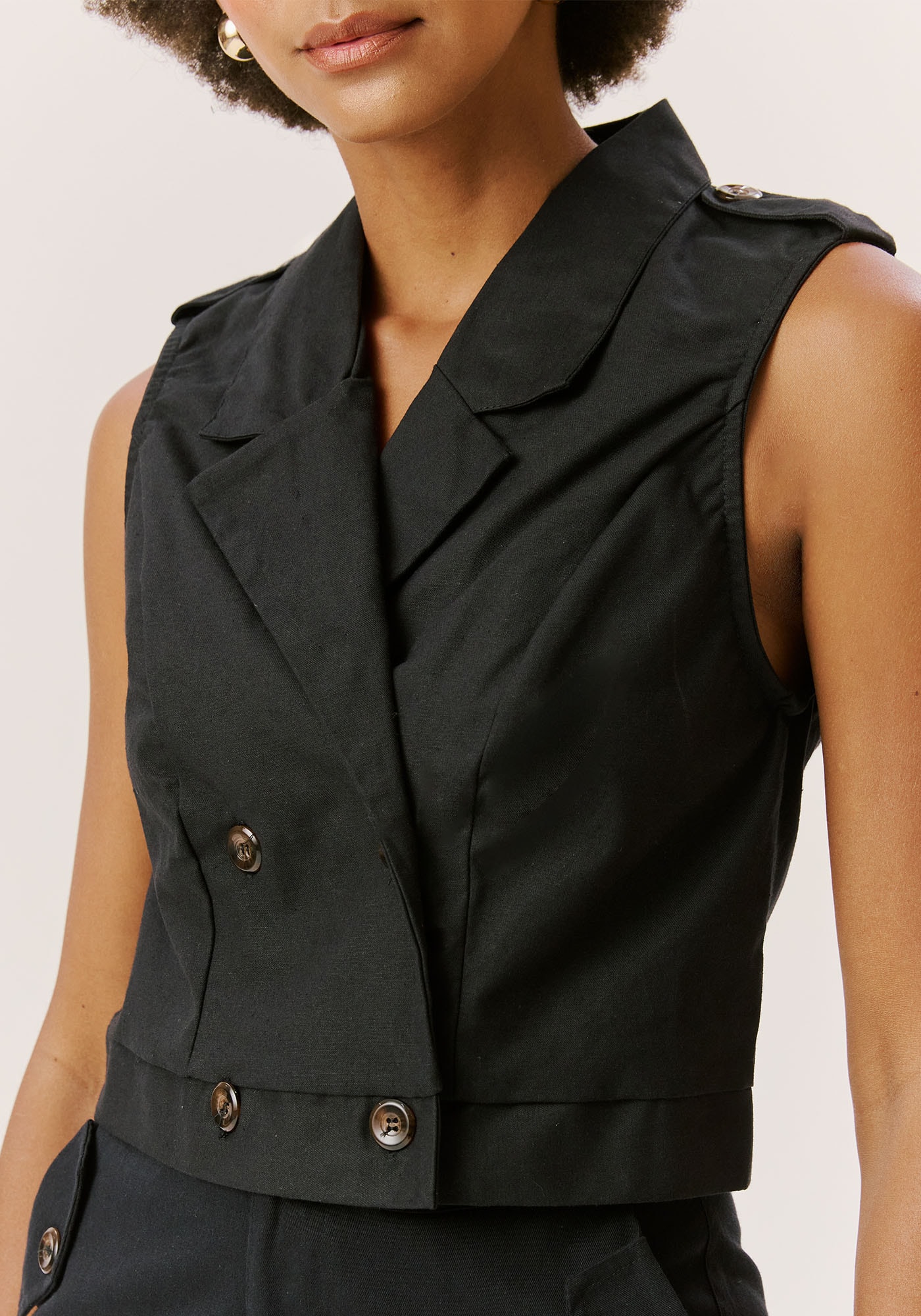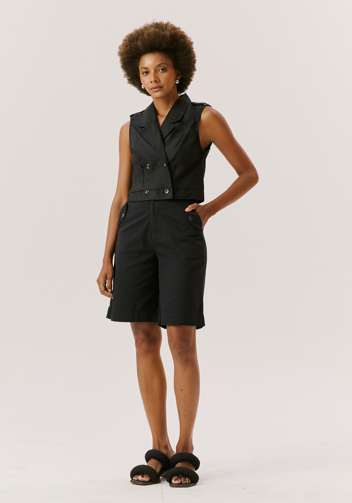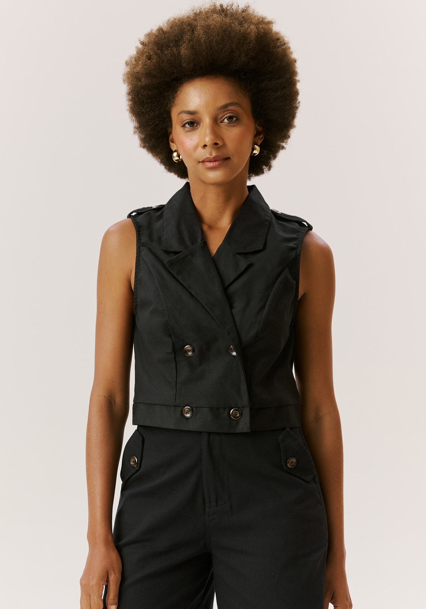 O colete é uma peça modernae arrojada. Confeccionado em tecido 97% algodão 3% elastano, o modelo sem mangapossui comprimento cropped com abotoamento frontal modelo tartaruga. A peçaainda possui o detalhe das alhetas no ombro, adicionando charme ao colete.
