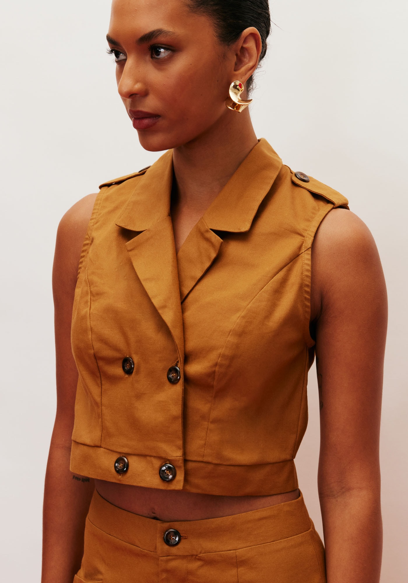 O colete é uma peça modernae arrojada. Confeccionado em tecido 97% algodão 3% elastano, o modelo sem mangapossui comprimento cropped com abotoamento frontal modelo tartaruga. A peçaainda possui o detalhe das alhetas no ombro, adicionando charme ao colete.