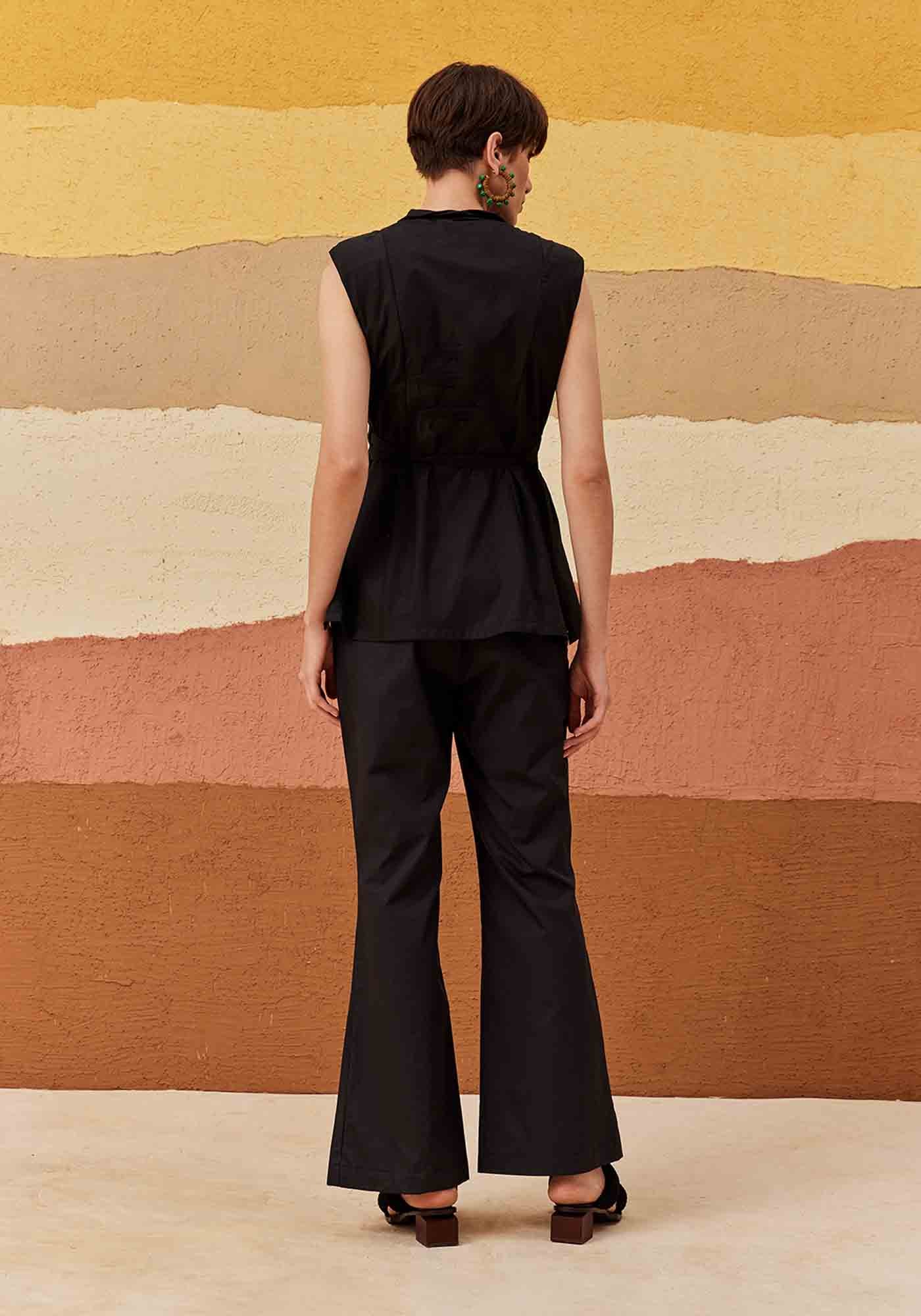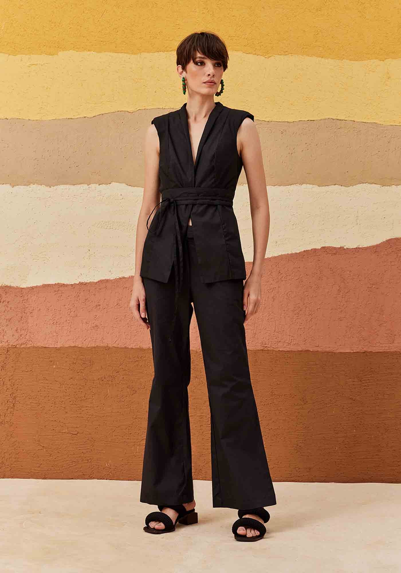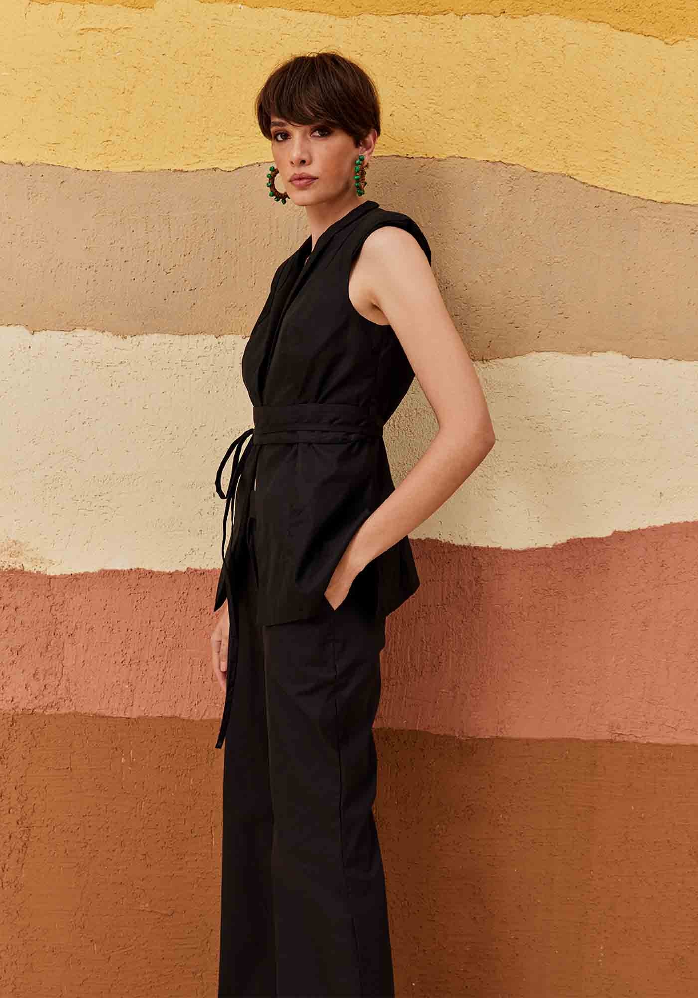 Confeccionado em tecido 100% algodão, o colete é elegante e sofisticado e pode ser usado tanto como terceira peça para complementar o look ou como parte de cima. O modelo ainda possui ombreira e cinto em faixa, deixando a peça ajustada à silhueta.