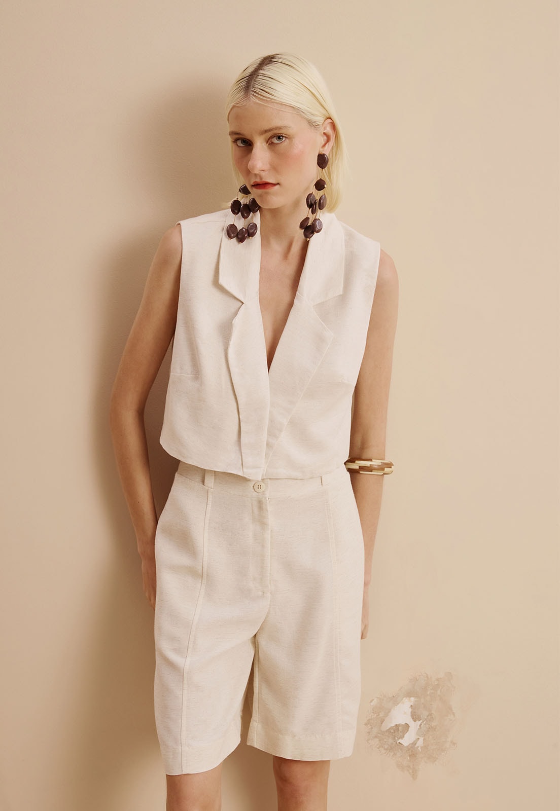 O Colete Cropped CaCay é a escolha ideal para quem busca sofisticação com leveza. Com design minimalista e corte moderno, a peça sem mangas apresenta gola dobrada e fechamento frontal, criando uma silhueta elegante e versátil. Seu comprimento cropped valoriza a cintura e permite composições criativas com saias, calças de alfaiataria ou até mesmo jeans de cintura alta. A textura suave e o caimento leve resultado da combinação de algodão, viscose, modal e linho garantem conforto em qualquer ocasião, do dia a dia ao encontro casual.