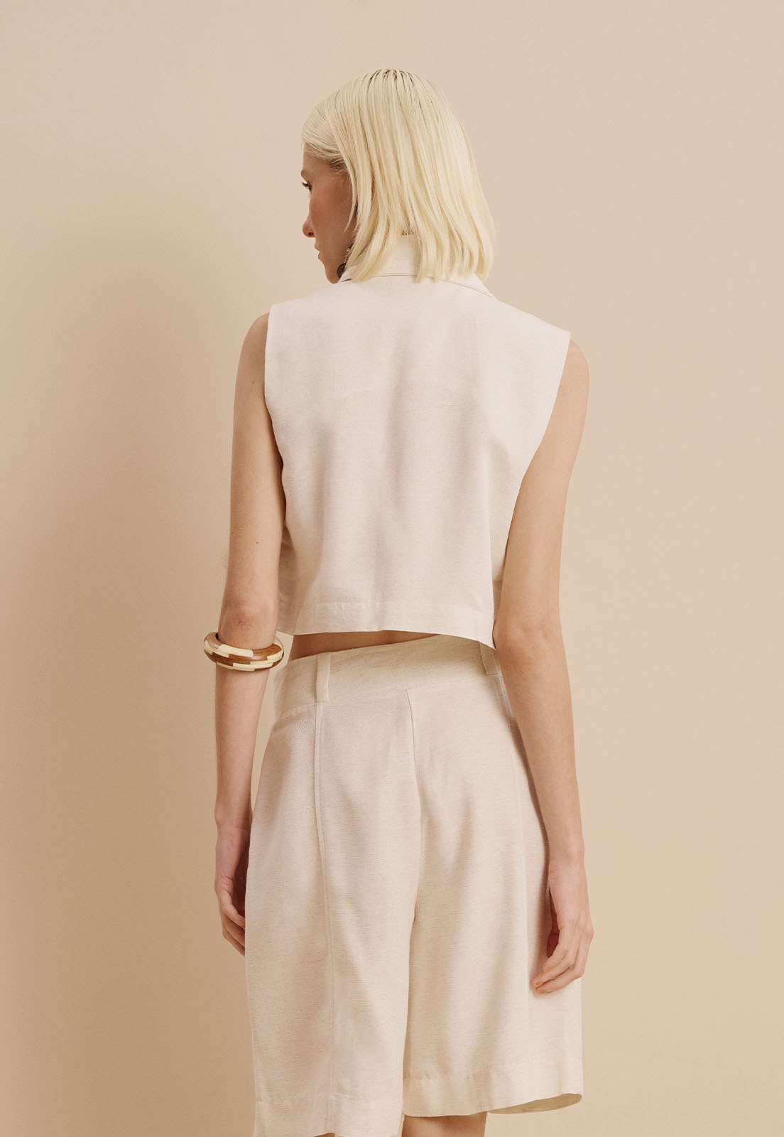 Feito para quem valoriza estilo atemporal e funcionalidade, o Colete Cropped CaCay se adapta bem a diferentes biotipos e climas, oferecendo frescor sem abrir mão da estrutura. Combine com acessórios em metal ou palha para um toque extra de personalidade. A modelo veste tamanho P e tem 1,77m de altura, evidenciando o caimento impecável da peça.