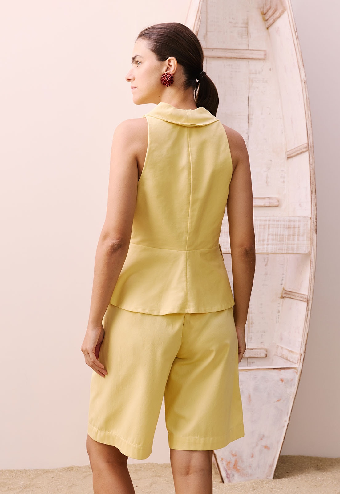 Combine com calças de alfaiataria, saias midi ou bermudas de corte reto para composições modernas e equilibradas. A modelo tem 1,77m e veste tamanho P, evidenciando o ajuste impecável da peça. Ideal para quem valoriza moda consciente e funcional, o Colete Gola Blazer CaCay é aquele item-chave que transforma qualquer look.