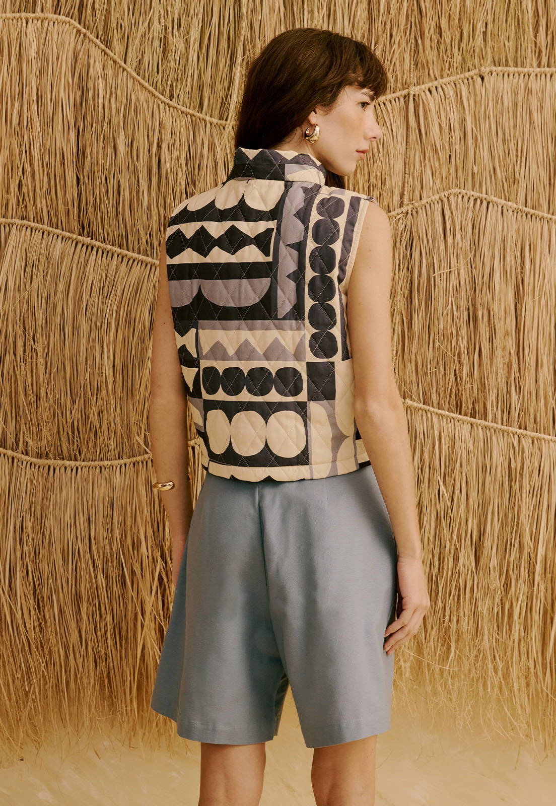 Confeccionado em 100% algodão, o tecido é encorpado e sem elasticidade, garantindo conforto prolongado e toque agradável. O fechamento em zíper traz praticidade, enquanto o design geométrico adiciona sofisticação atemporal. Versátil, pode ser usado em produções casuais, no dia a dia ou até em ambientes de trabalho criativo, sempre com elegância. Combine com acessórios minimalistas, camisas leves ou calças de alfaiataria para criar composições que equilibram estilo e funcionalidade.