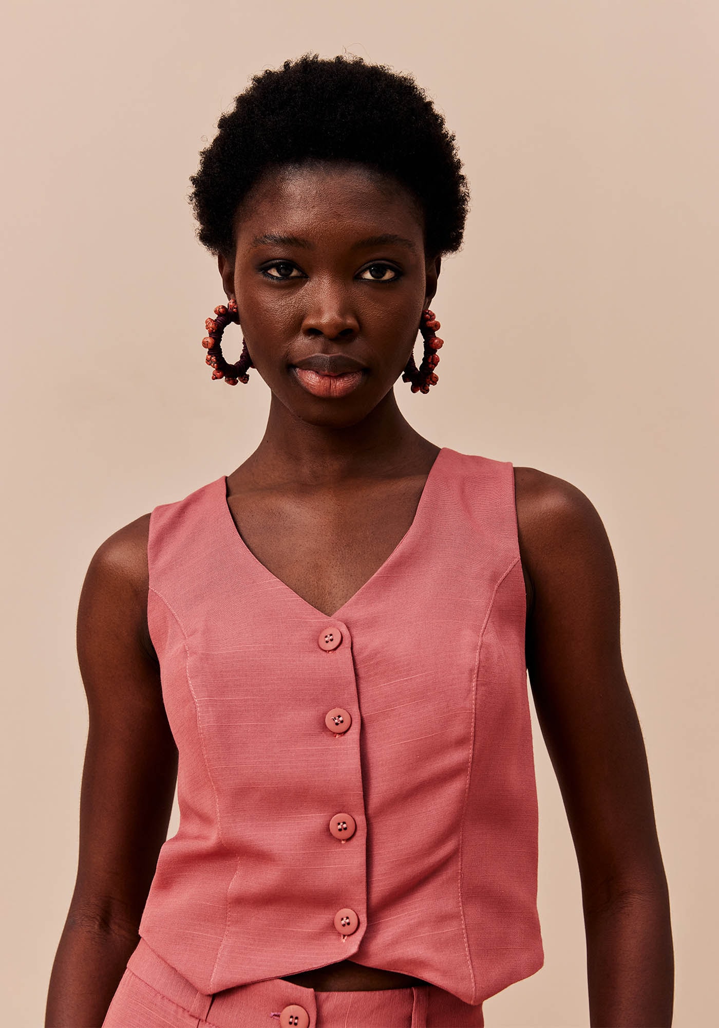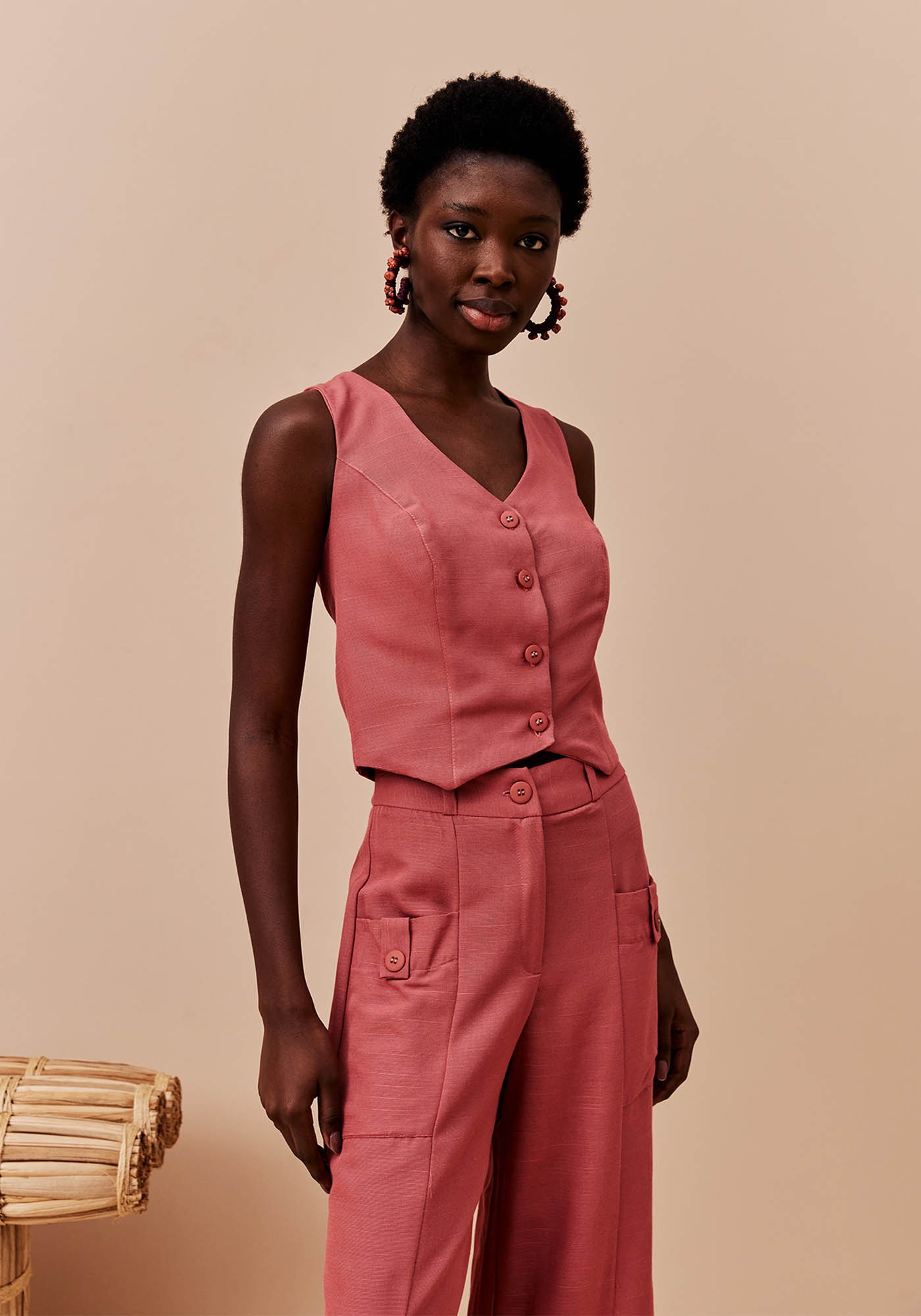 O colete se tornou uma peça modernaque completa o guarda-roupa e o estilo pessoal. Confeccionado em tecido 61% viscose e 35% algodão, pode ser usado como parte de cima ou como sobreposição completando o look. O modelo possui um recorte diferenciado, com abotoamento na parte da frente.