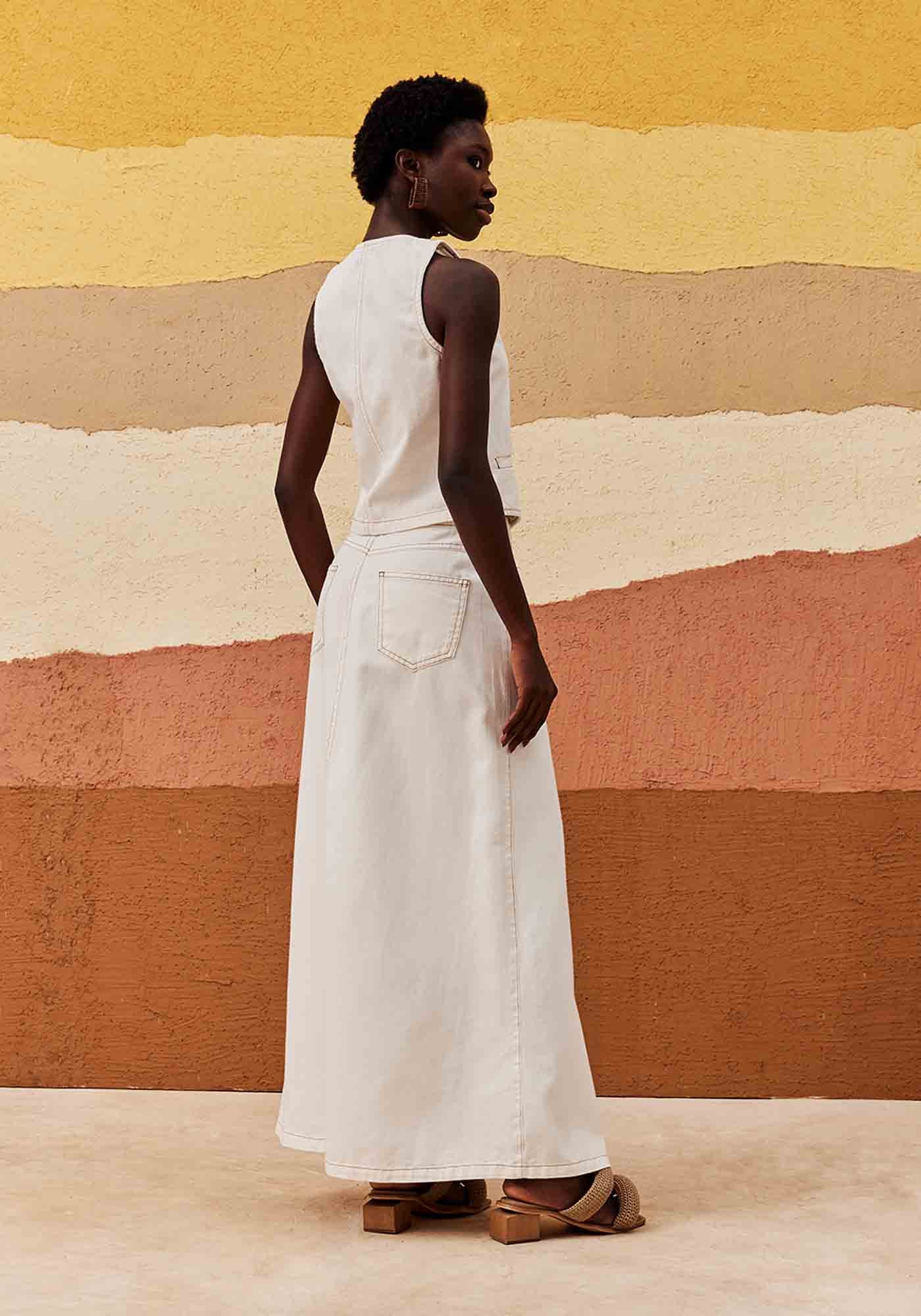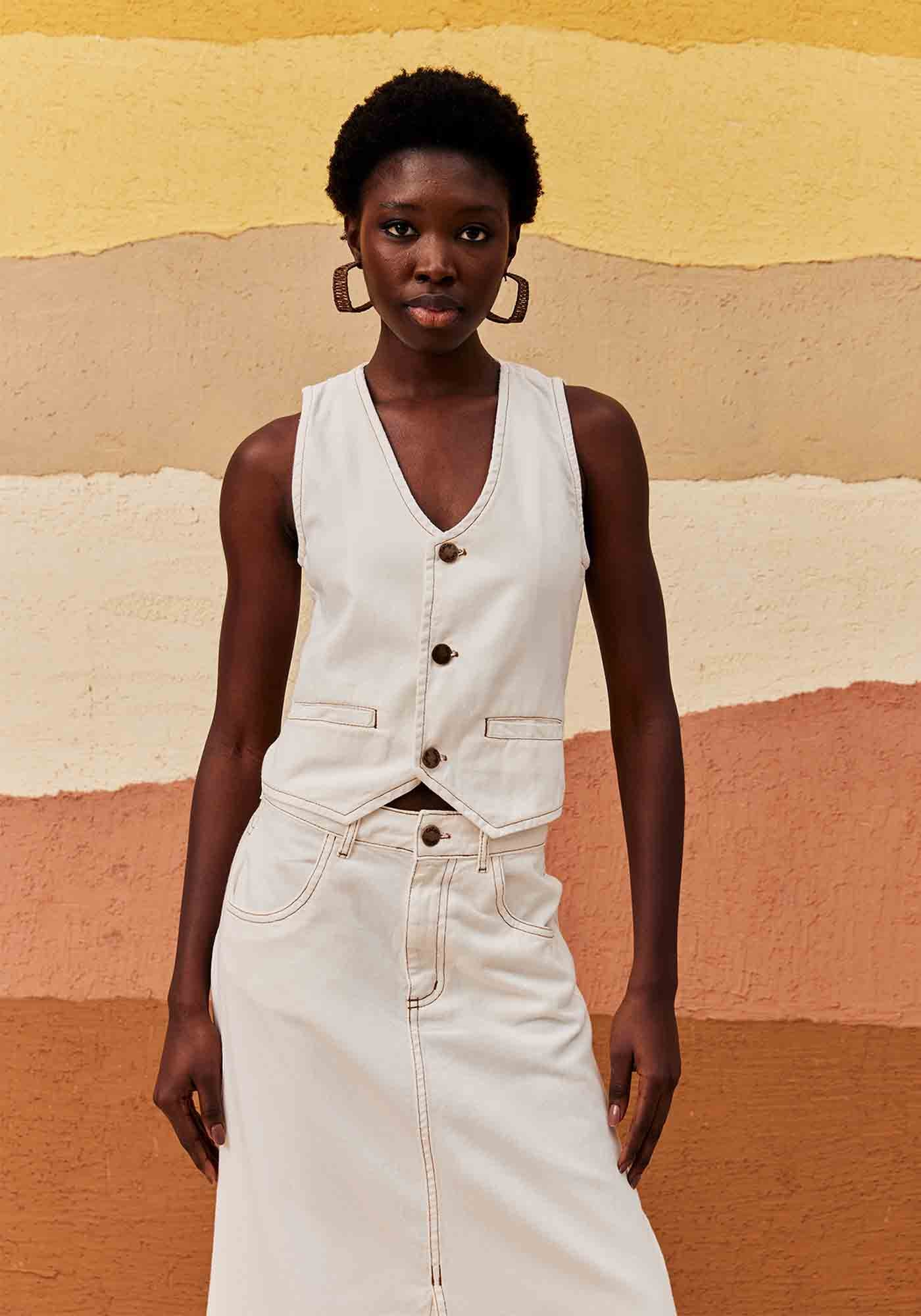 O colete confeccionado em sarja 100% algodão é um modelo estiloso e versátil.O modelo possui fechamento frontal com abotoamento de metal e bolsos em faca. Pode ser usado como uma sobreposição ou parte de cima para completar o look.