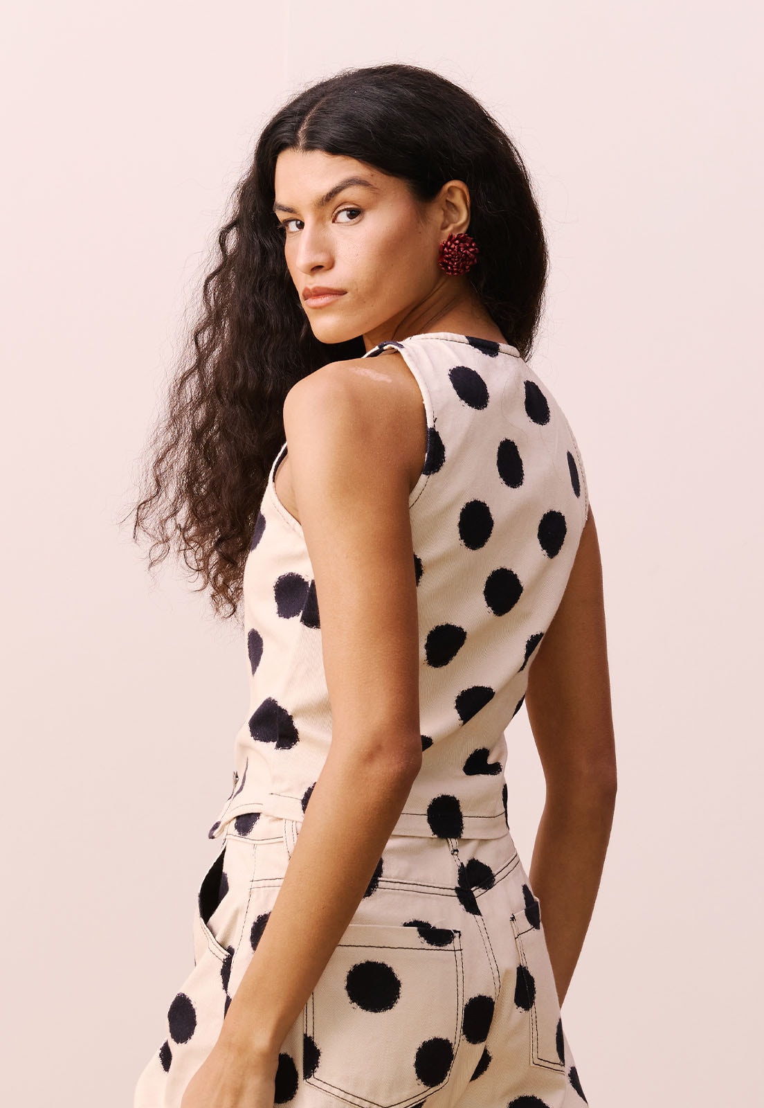 O Colete Sarja Estampado CaCay é uma peça-chave para composições cheias de personalidade. Confeccionado em 100% algodão, seu toque encorpado garante estrutura e conforto, enquanto a modelagem ajustada valoriza a silhueta com elegância. O design sem mangas e o decote em V criam uma proposta moderna e versátil, ideal para sobreposições ou uso solo. A estampa de bolinhas grandes distribui-se de forma uniforme, trazendo um toque gráfico e atemporal ao visual. O fechamento frontal por botões adiciona praticidade e estilo à peça.