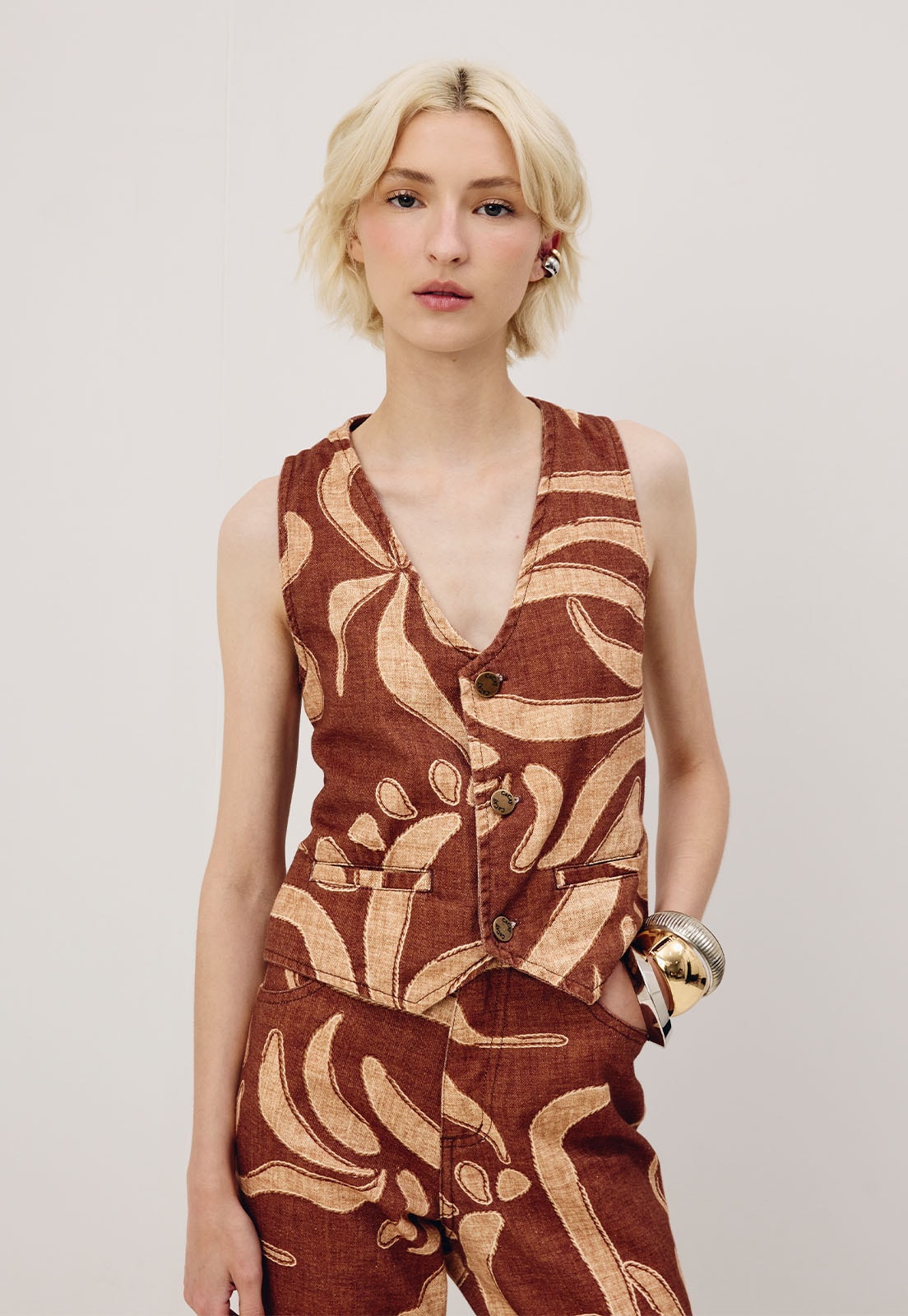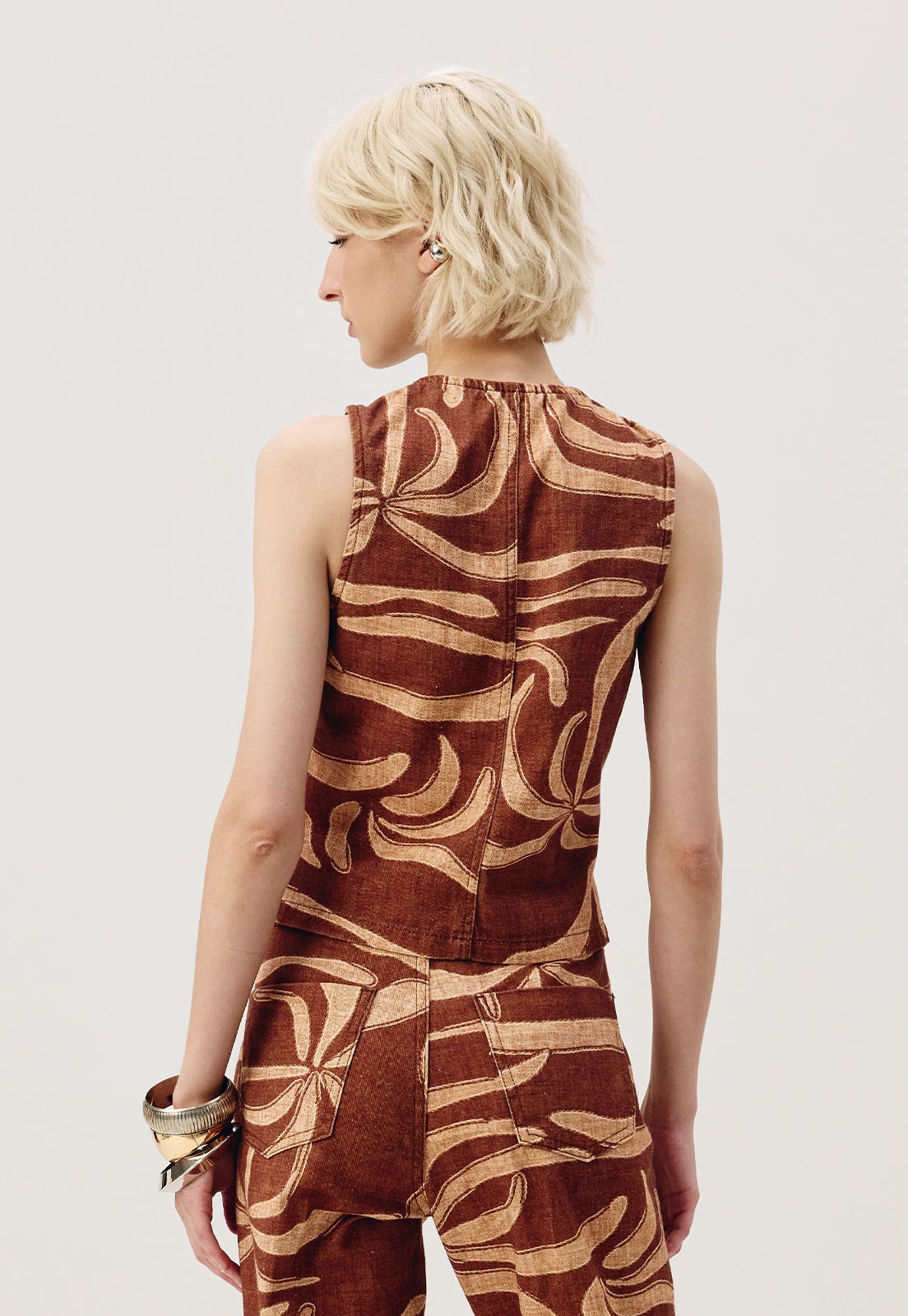 O colete estampado Yucca éconfeccionado em sarja 100% algodão.É um modelomoderno e versátil, que pode ser usado como complemento do look ou parte de cima.