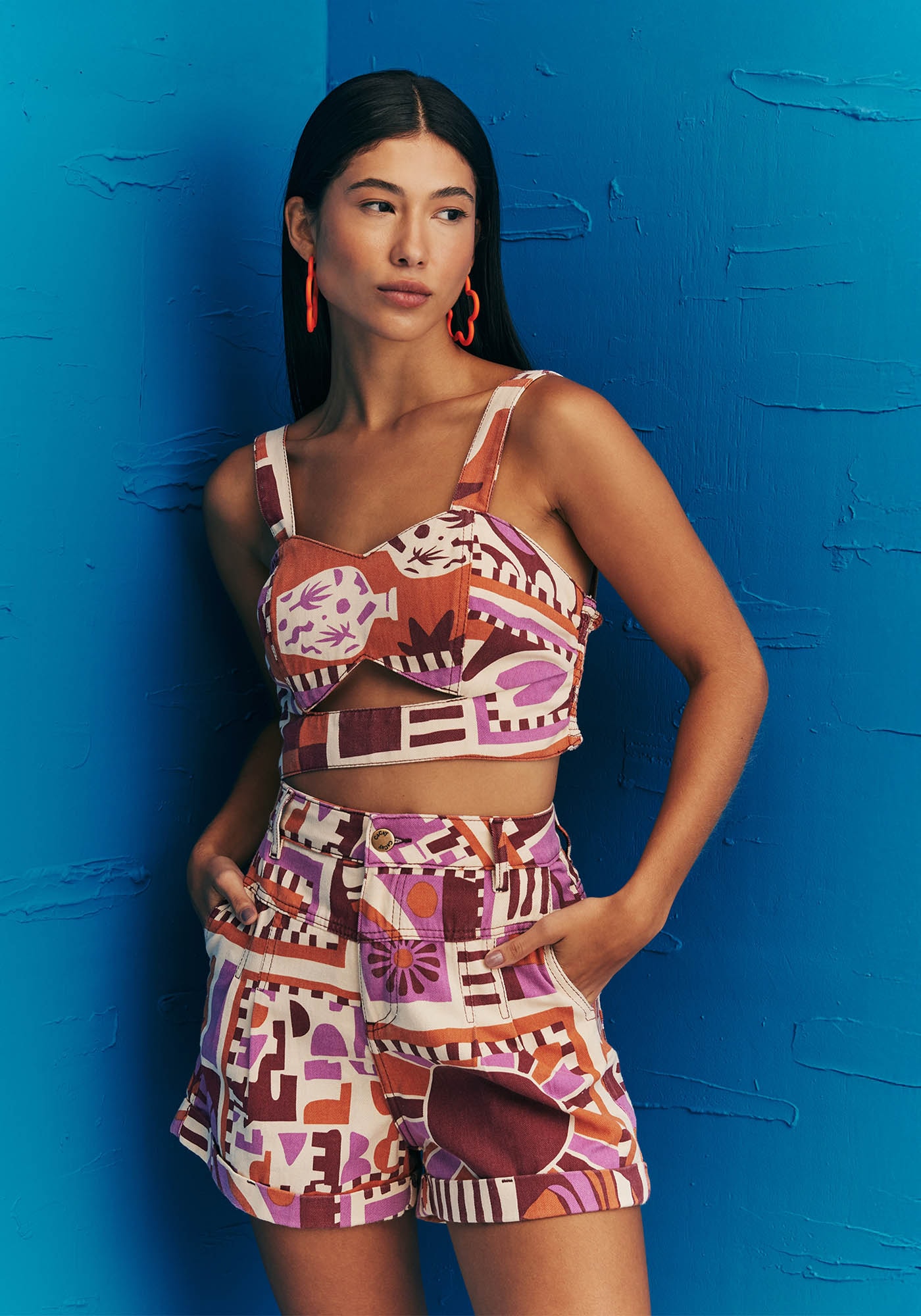 Divertido e estiloso, esse cropped é uma peça-chave para compor looks cheios de personalidade. Apresenta uma modelagem mais ajustada que evidencia a silhueta enquanto o lastex na parte das costas mantém o conforto e praticidade. Seu design é unico e diferenciado com decote coração, alças largas e recorte abaixo do busto. A estampa Vila Hermosa apresenta tons vibrantes perfeitos para o verão. Este modelo é confeccionado em Sarja de composição 100% Algodão.