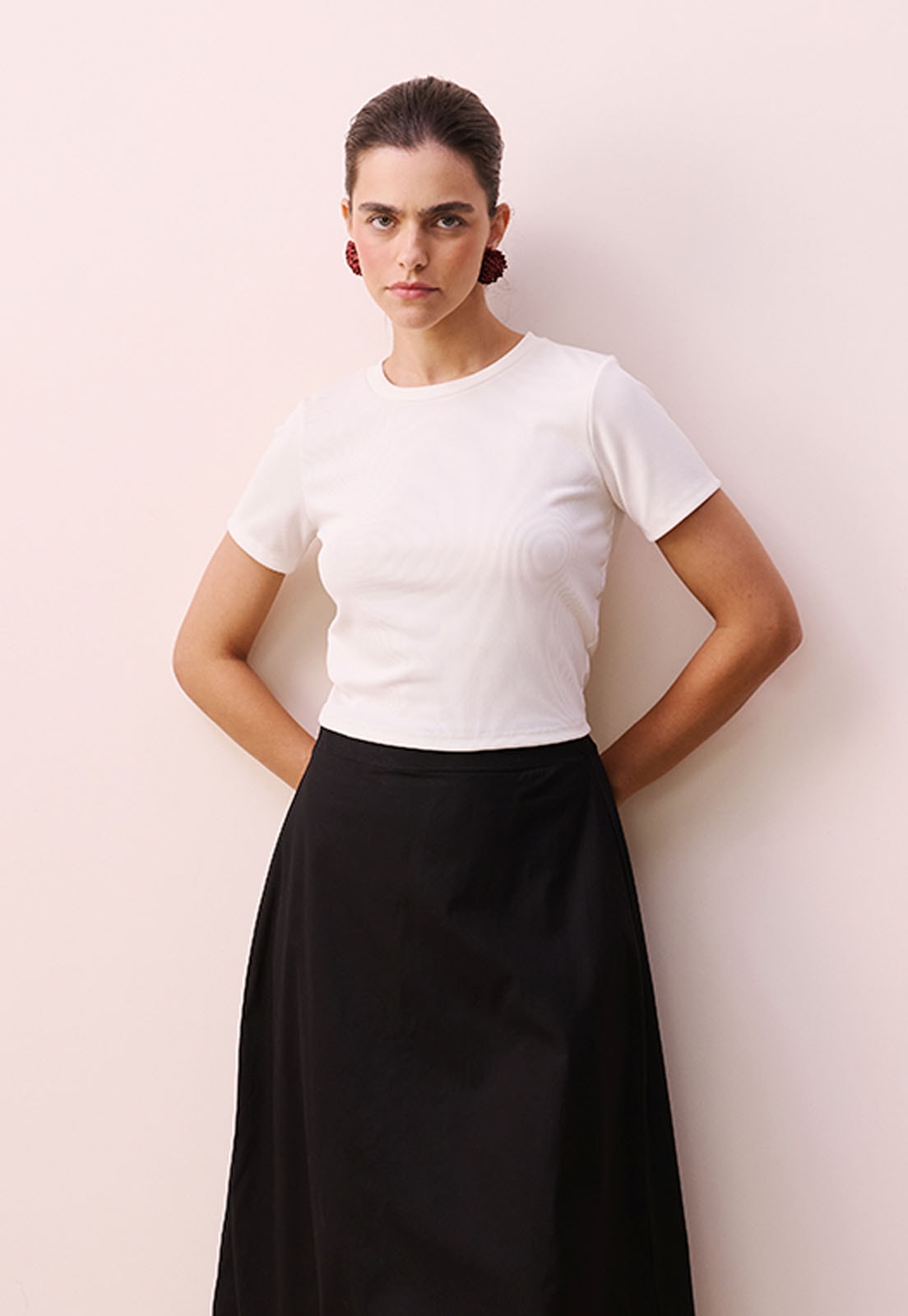 O detalhe da estampa geométrica discreta adiciona personalidade sem sobrecarregar o visual, tornando-o fácil de combinar com saias de alfaiataria, calças wide leg ou até mesmo jeans de cintura alta. Para um toque extra, aposte em acessórios minimalistas ou uma bolsa estruturada. A modelo tem 1,77m e veste tamanho P, evidenciando o ajuste natural da peça ao corpo.