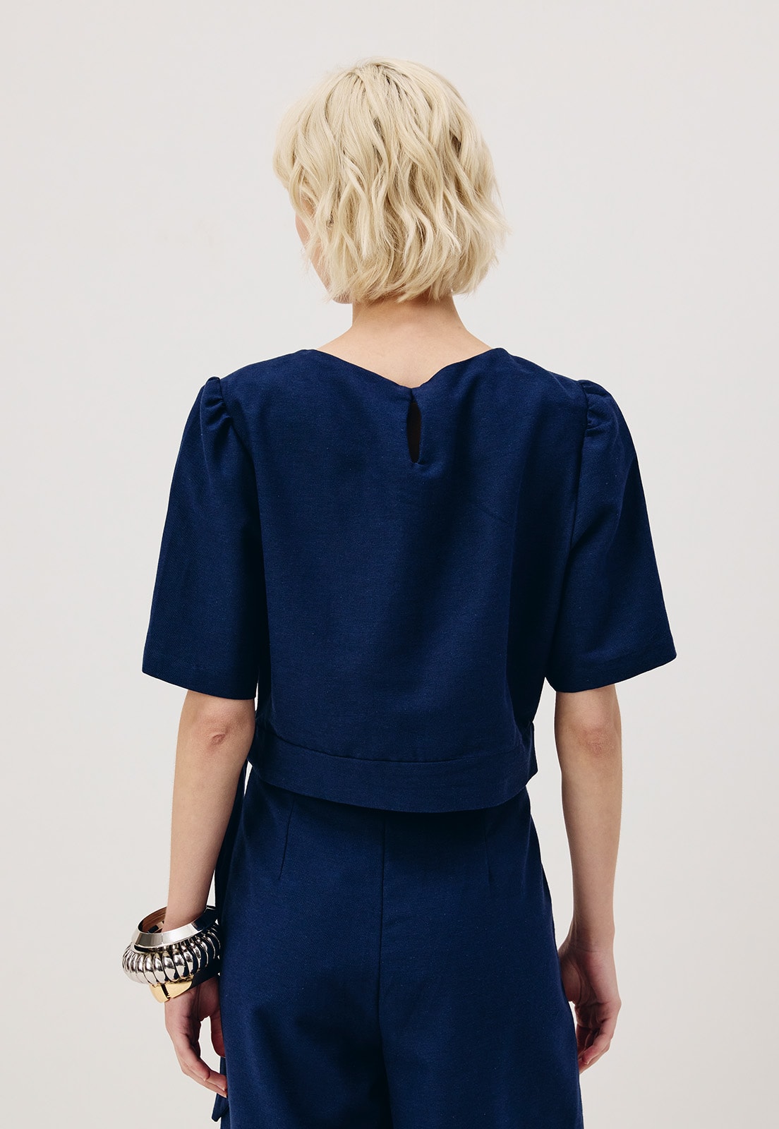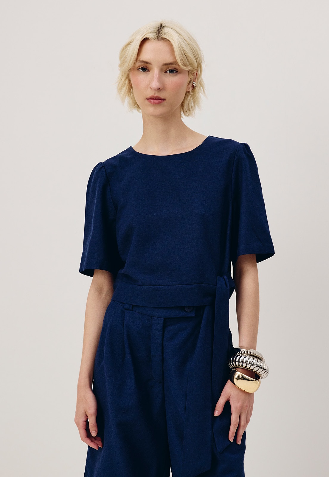 O cropped é confeccionado em tecido 70% algodão e 30% viscose. O modelo alongado é sofisticado e elegante e possui modelagem alongada, com manga bufante e o detalhe chique do nó lateral.