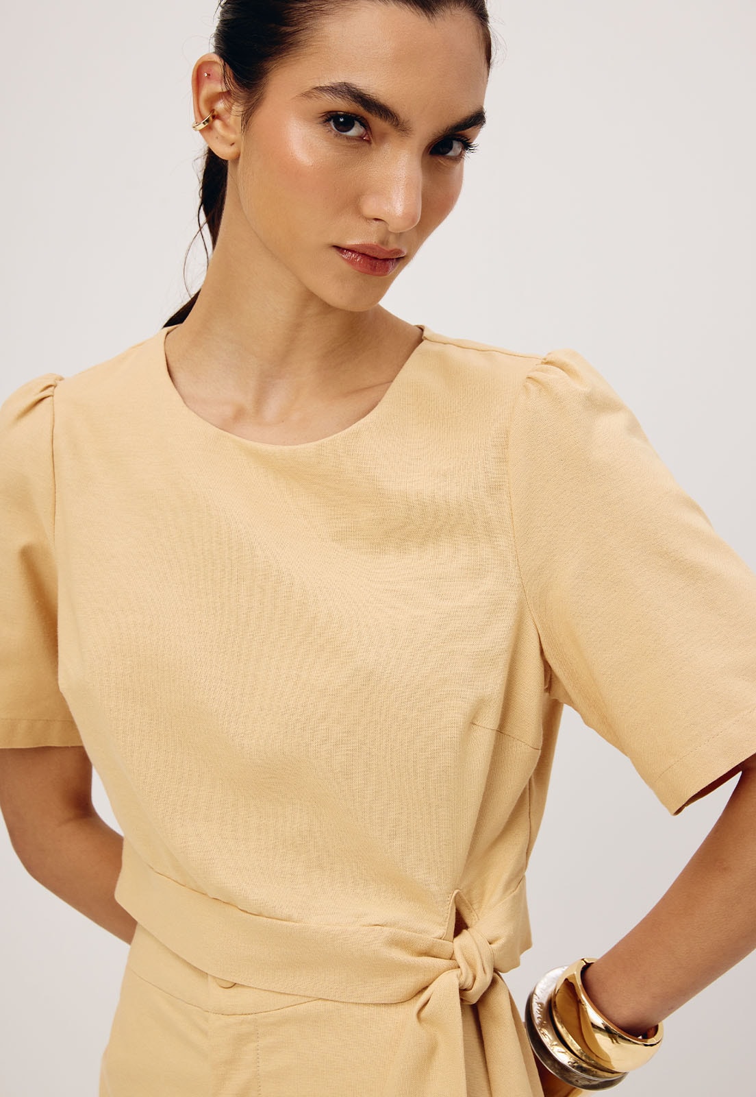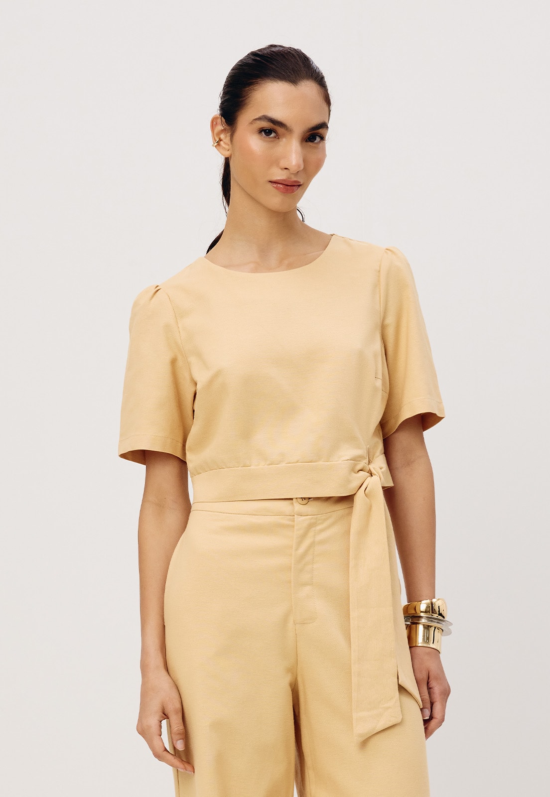 O cropped é confeccionado em tecido 70% algodão e 30% viscose. O modelo alongado é sofisticado e elegante e possui modelagem alongada, com manga bufante e o detalhe chique do nó lateral.
