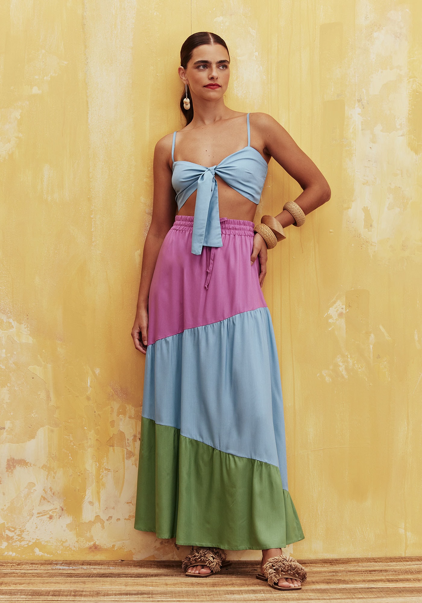 Perfeito para o clima do verão, o croppedconfeccionado em tecido 100% viscose ganha um detalhe especial com amarração emnó na parte da frente.