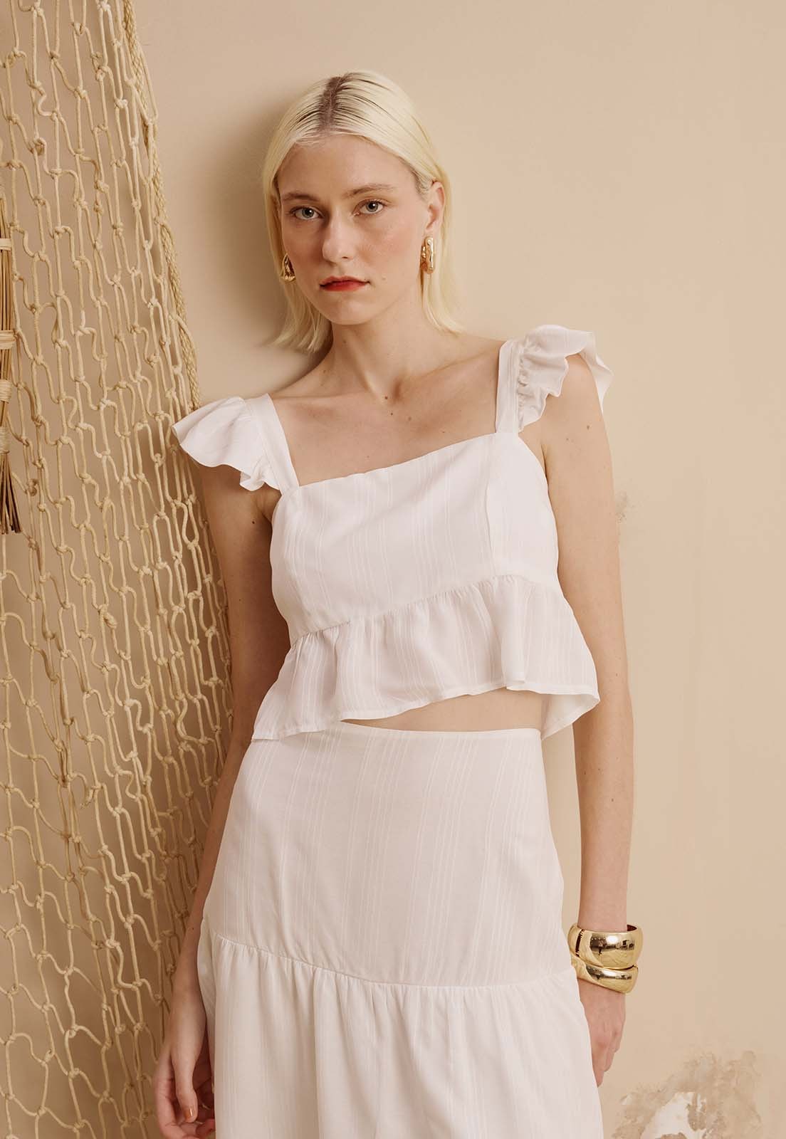 Combine com saias de cintura alta, calças de alfaiataria ou shorts fluidos, e finalize com acessórios dourados ou bolsas de palha para um visual leve e moderno. Seja para um almoço ao ar livre, uma reunião descontraída ou um passeio à beira-mar, este cropped é a tradução do estilo descomplicado.
