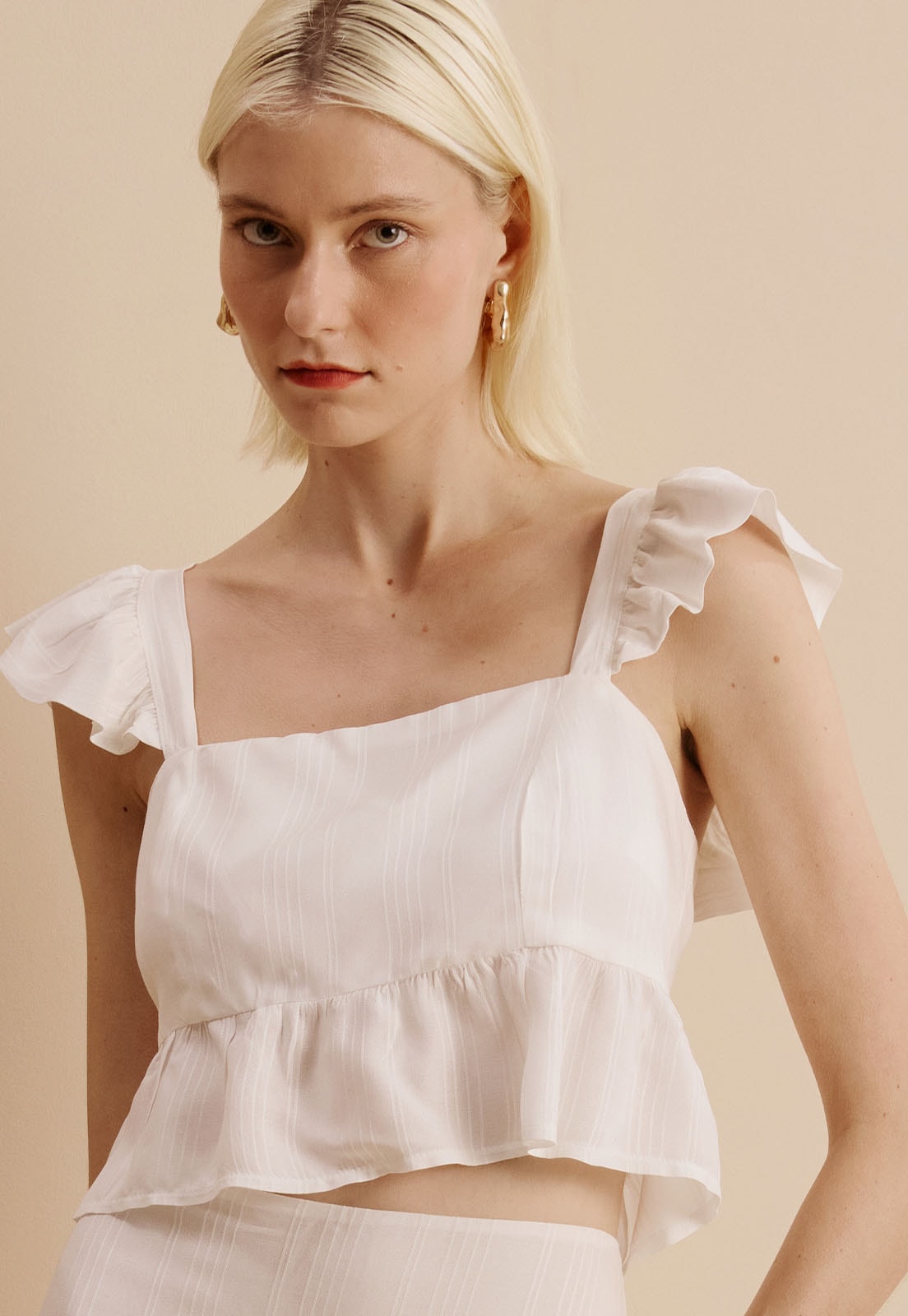 Confeccionado em 100% viscose, o Cropped Babadinhos Liso da CaCay valoriza a silhueta com seu caimento fluido e toque macio, ideal para peles sensíveis e dias quentes. O design com babados delicados e acabamento liso traz um ar romântico e atemporal, perfeito para compor looks casuais ou mais elaborados. A modelagem cropped com decote quadrado e alças estruturadas garante sustentação e liberdade de movimento, enquanto os detalhes em textura vertical adicionam sofisticação sem exageros. A modelo veste tamanho P e tem 1,77m de altura, evidenciando o ajuste elegante da peça em diferentes biotipos.
