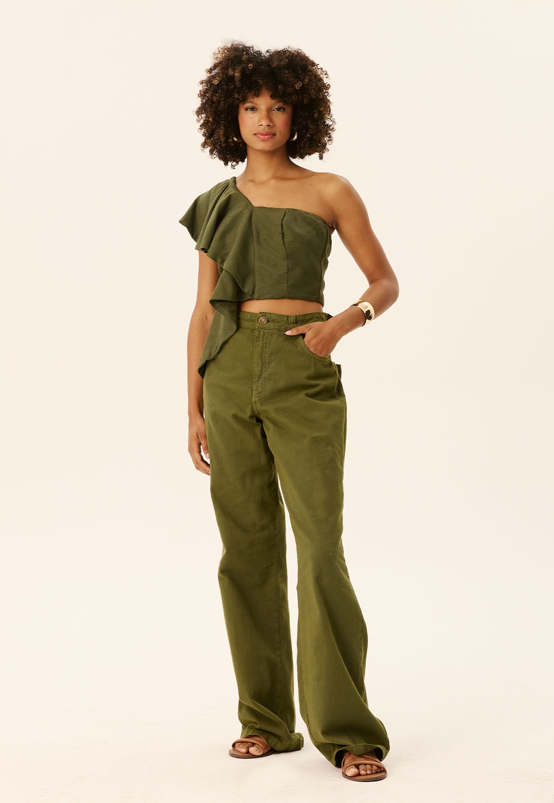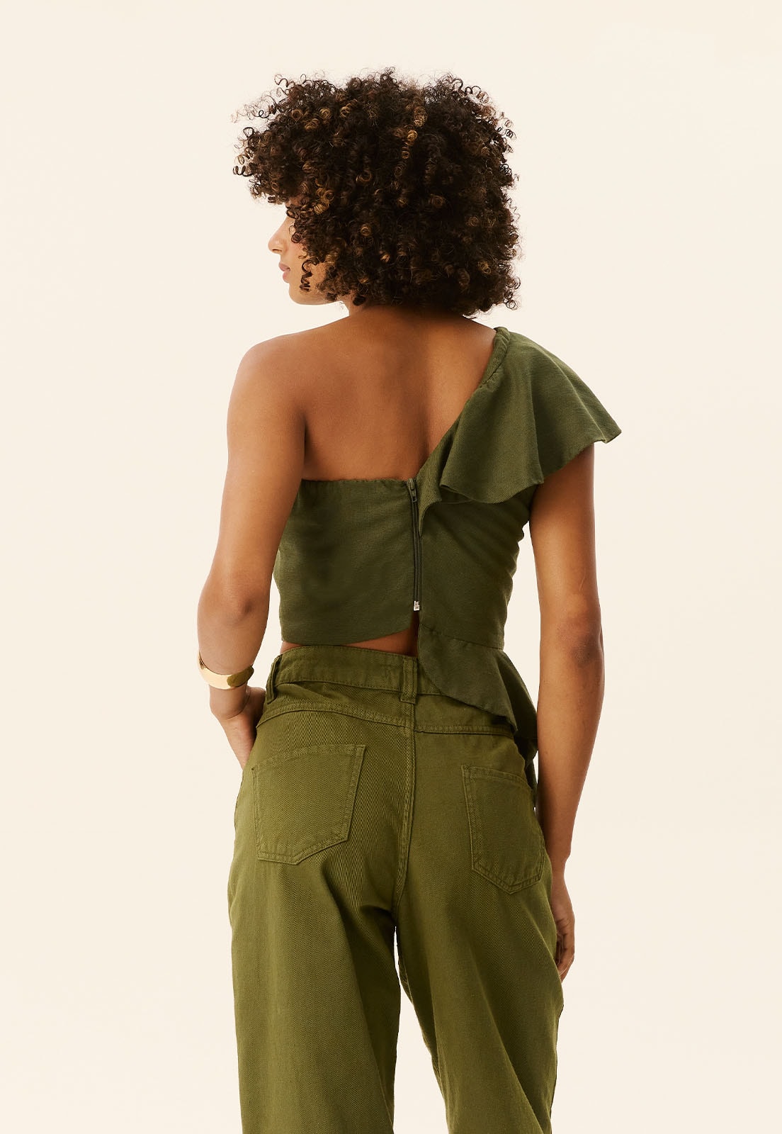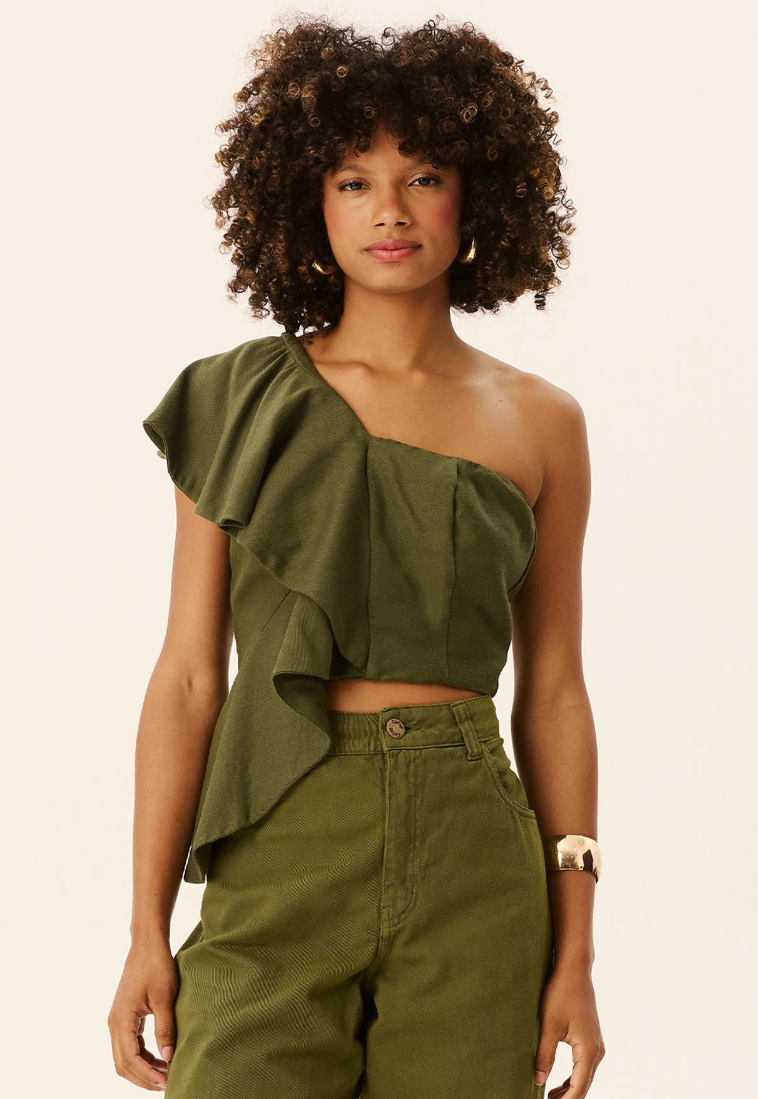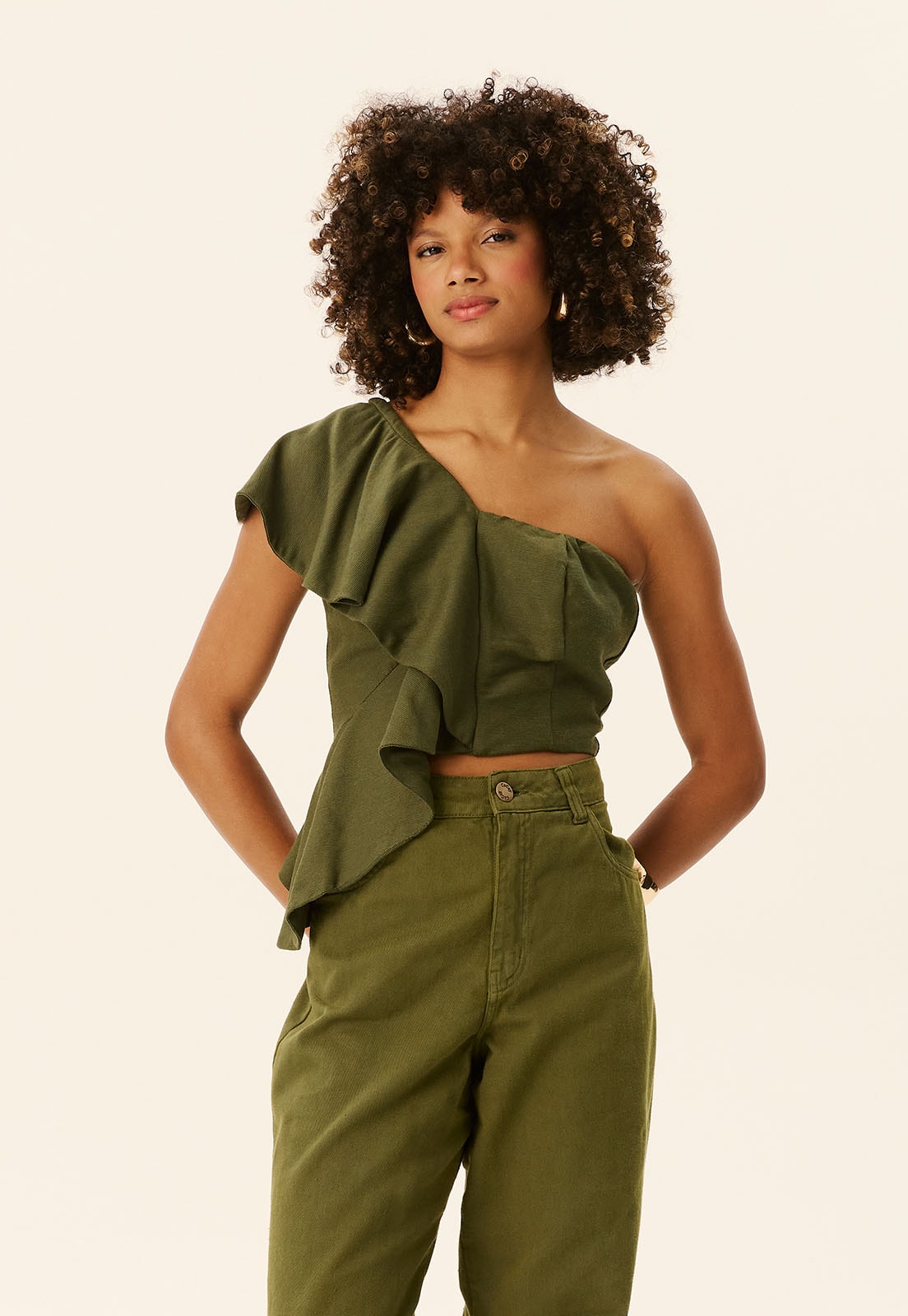 Combine com calças de cintura alta, saias fluidas ou até jeans para um look equilibrado. Aposte em acessórios minimalistas ou maxi brincos para destacar o design assimétrico.