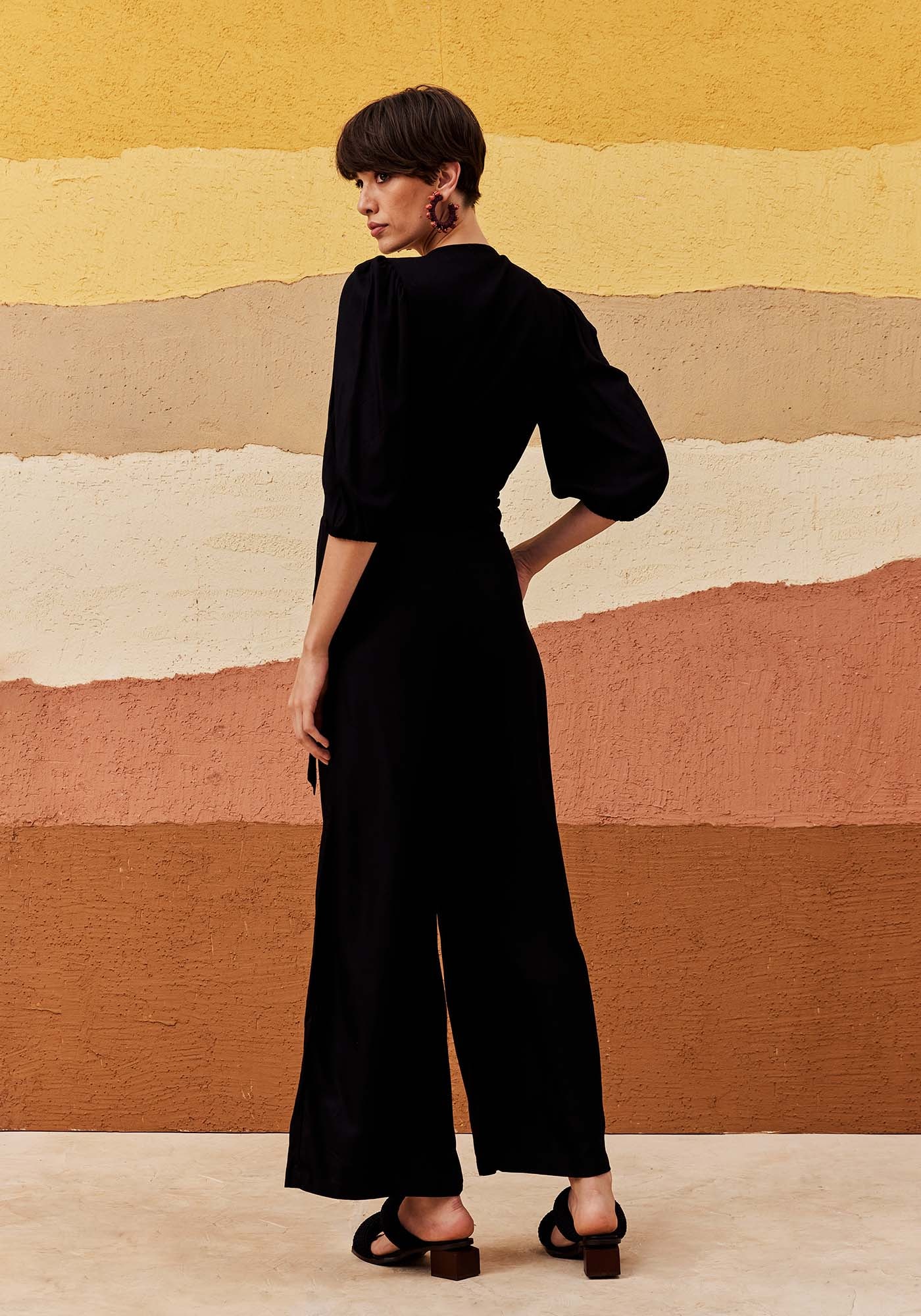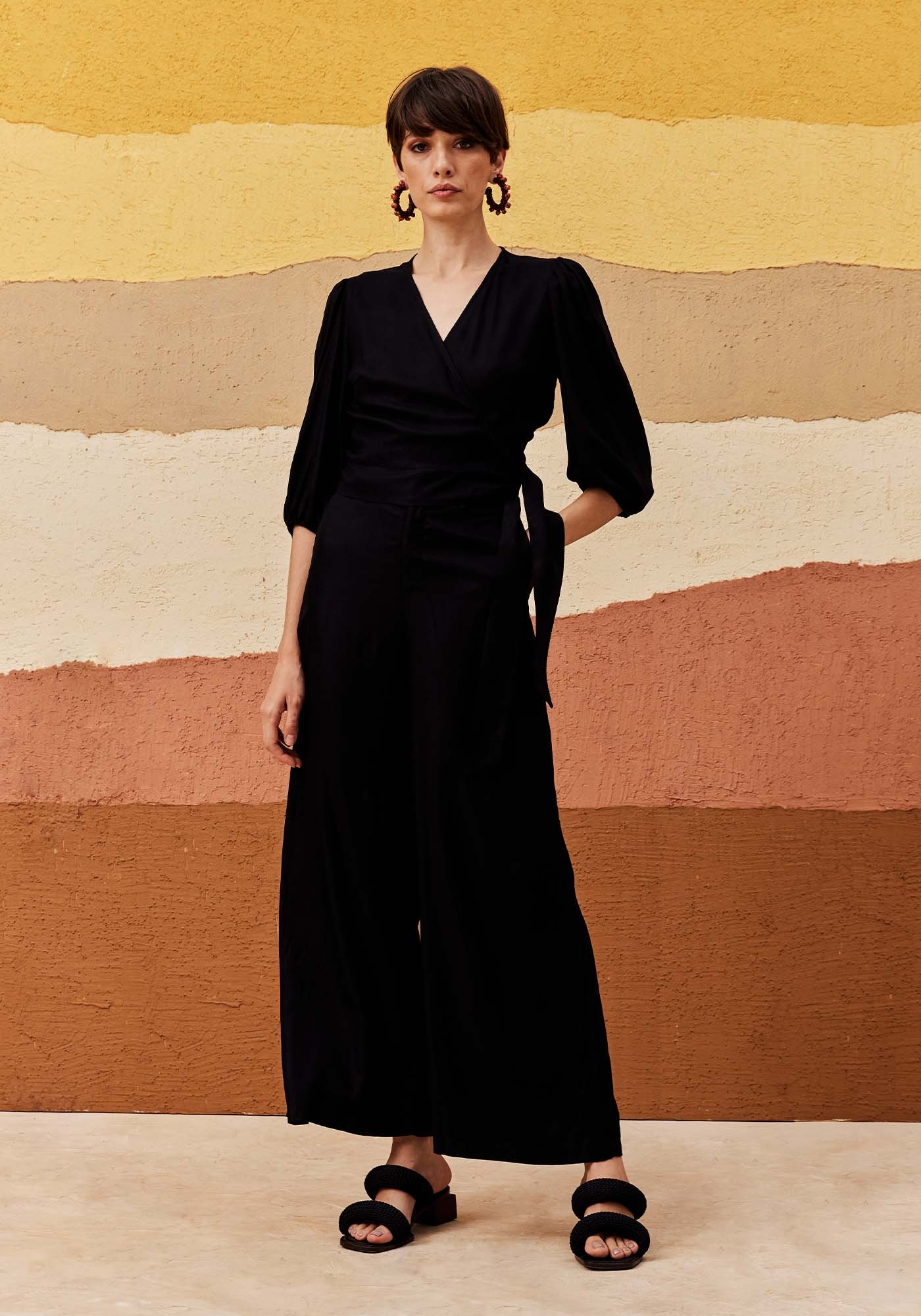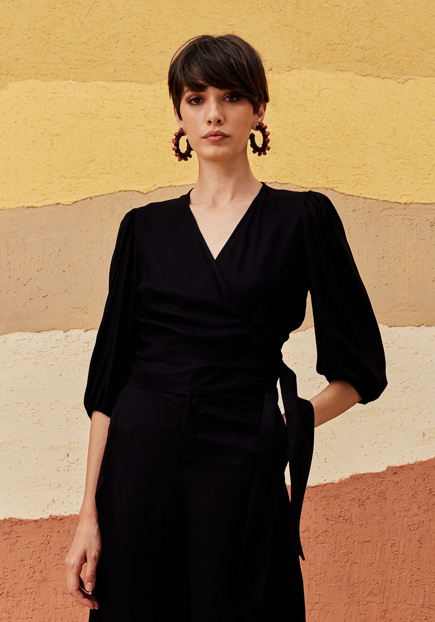 Este Cropped no modelo cachecouer é uma peça versátil e sofisticada. Confeccionado em 100% Viscose, ele apresenta decote em V na parte frontal, amarração na lateral e mangas bufantes no comprimento ¾ que trazem delicadeza para o visual. É ideal para composições modernas e elegantes.