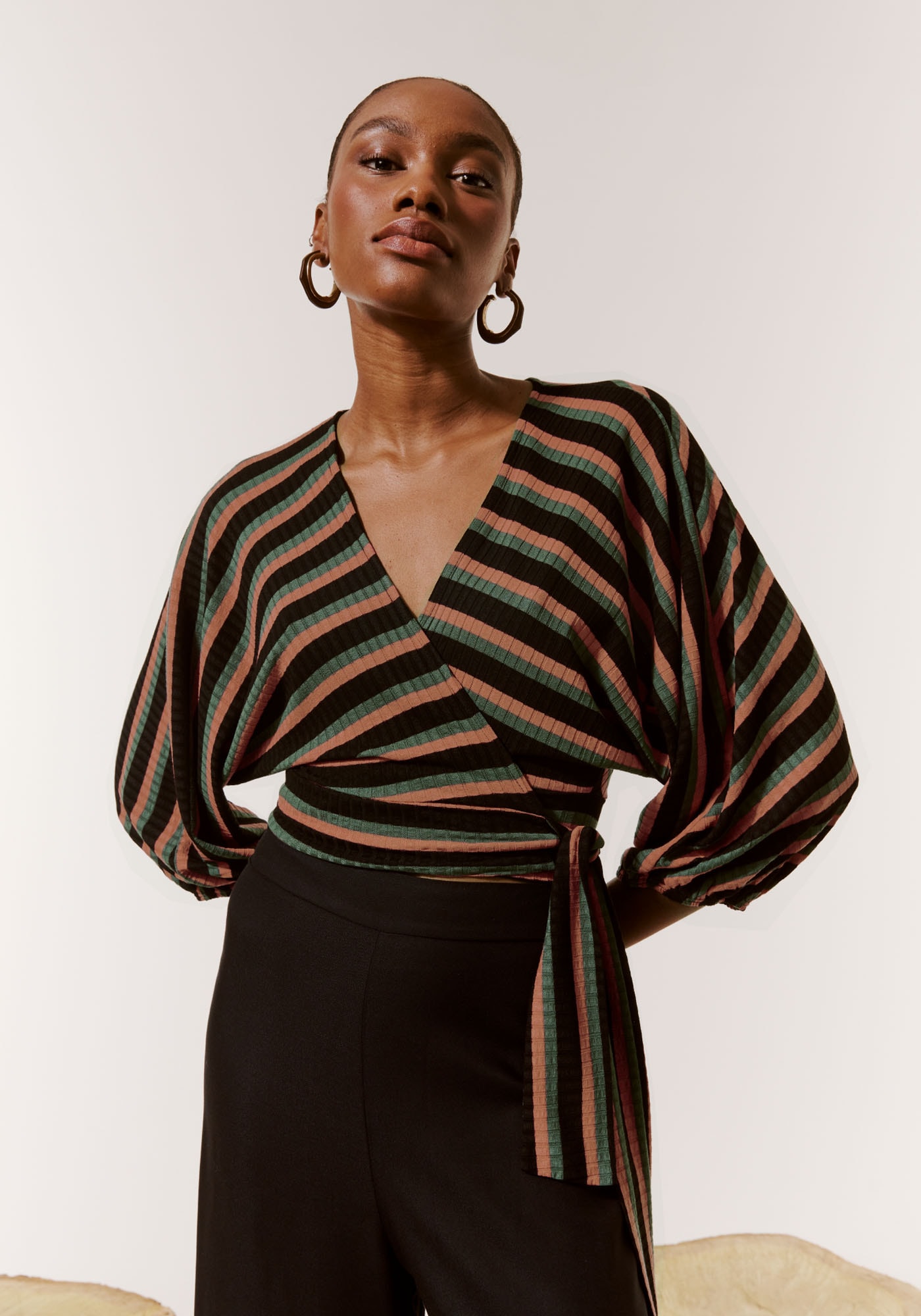 Confeccionado em malha, 95% viscose 5%elastano, a modelagem cruzada possui manga ampla com elástico.
