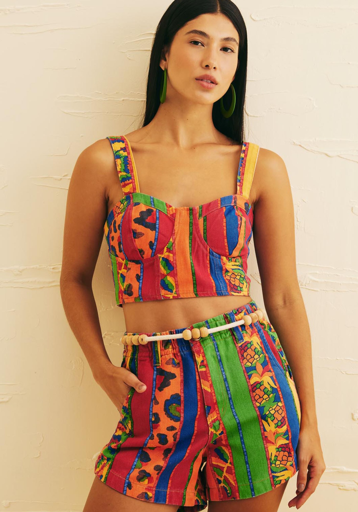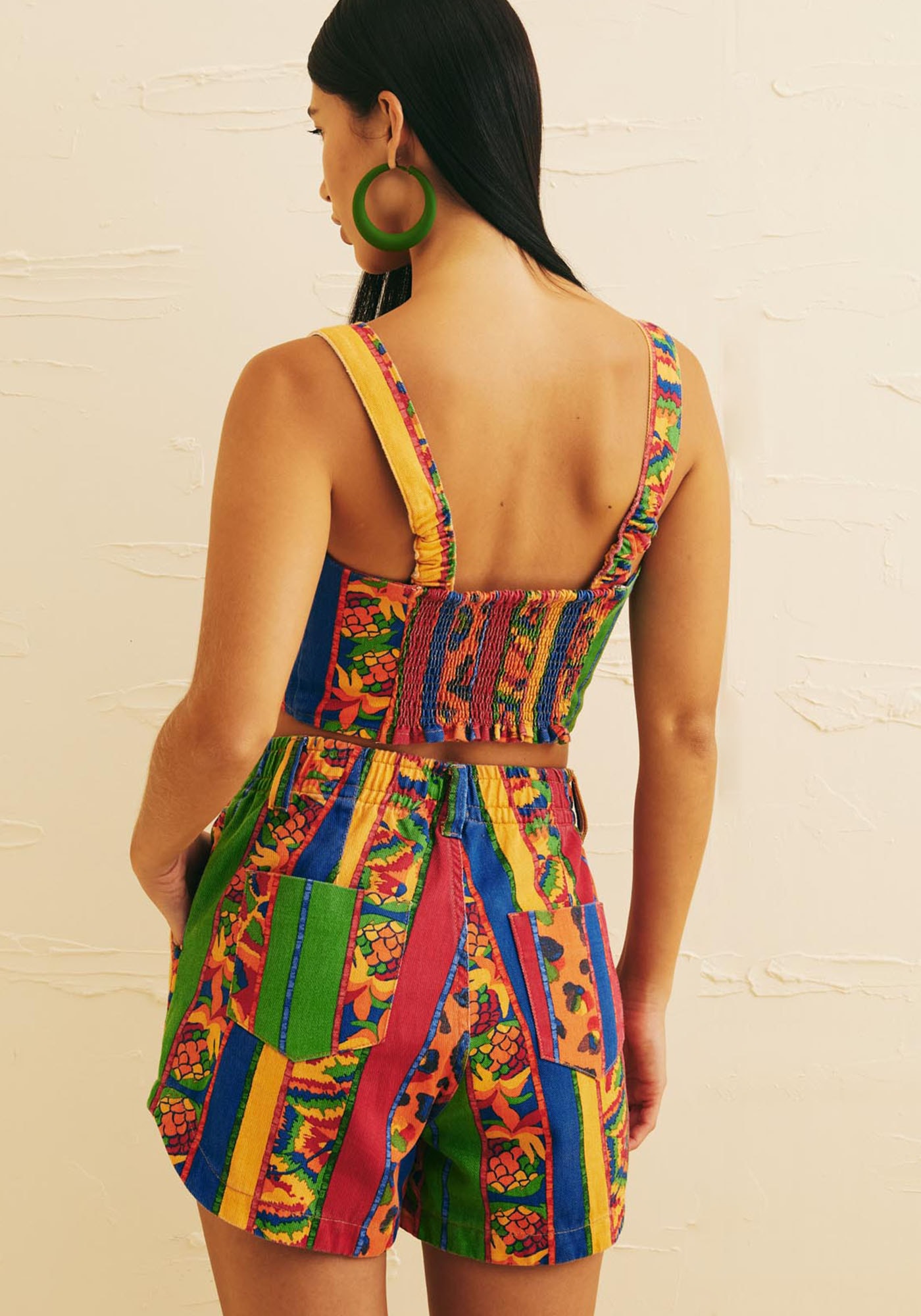 O Cropped Corselet Estampado ésinônimo de estilo e modernidade. Sua estampa Caminito é única e encantadora,com uma combinação de cores vibrantes que é perfeita para o verão. Suamodelagem corselet é ajustada ao corpo valorizando a silhueta enquanto o lastexnas alças e na parte das costas oferecem mais conforto. É confeccionado emSarja de composição 100% Algodão, ele é ideal para compor looks descontraídos edivertidos.
