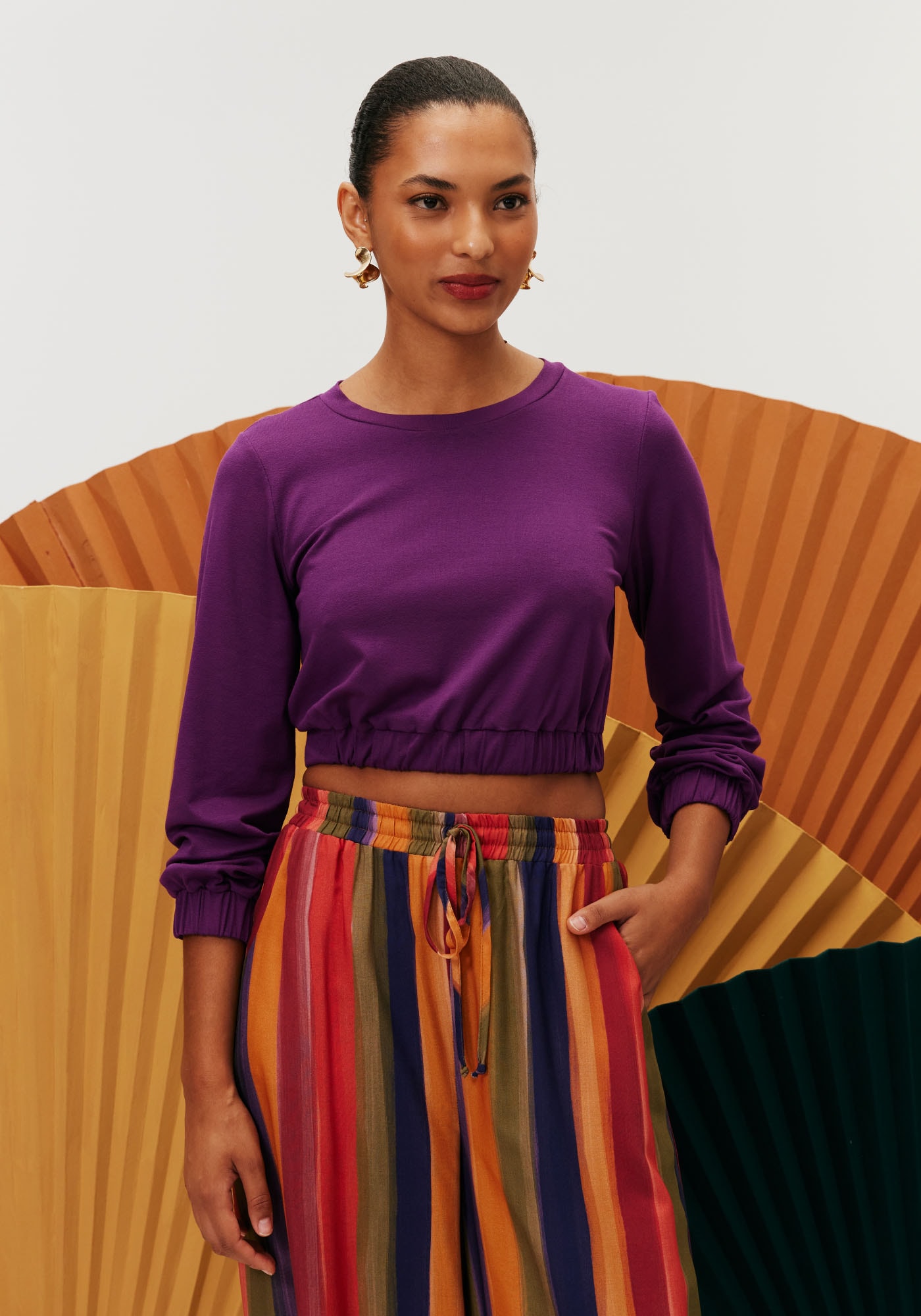 Confortável e versátil,o cropped é confeccionado em malha 96% viscose 4% elastano e possui decotecanoa e manga com elástico.