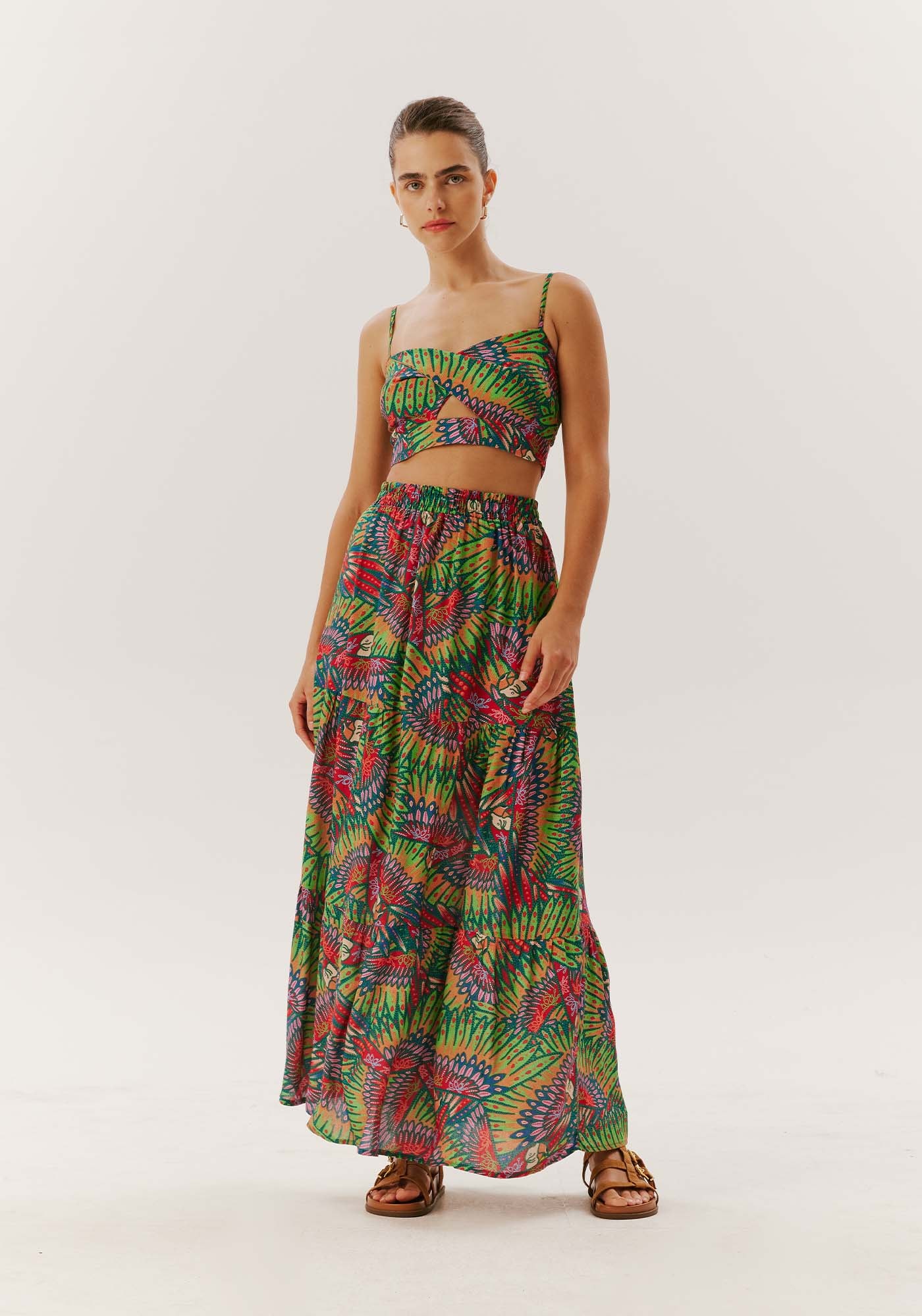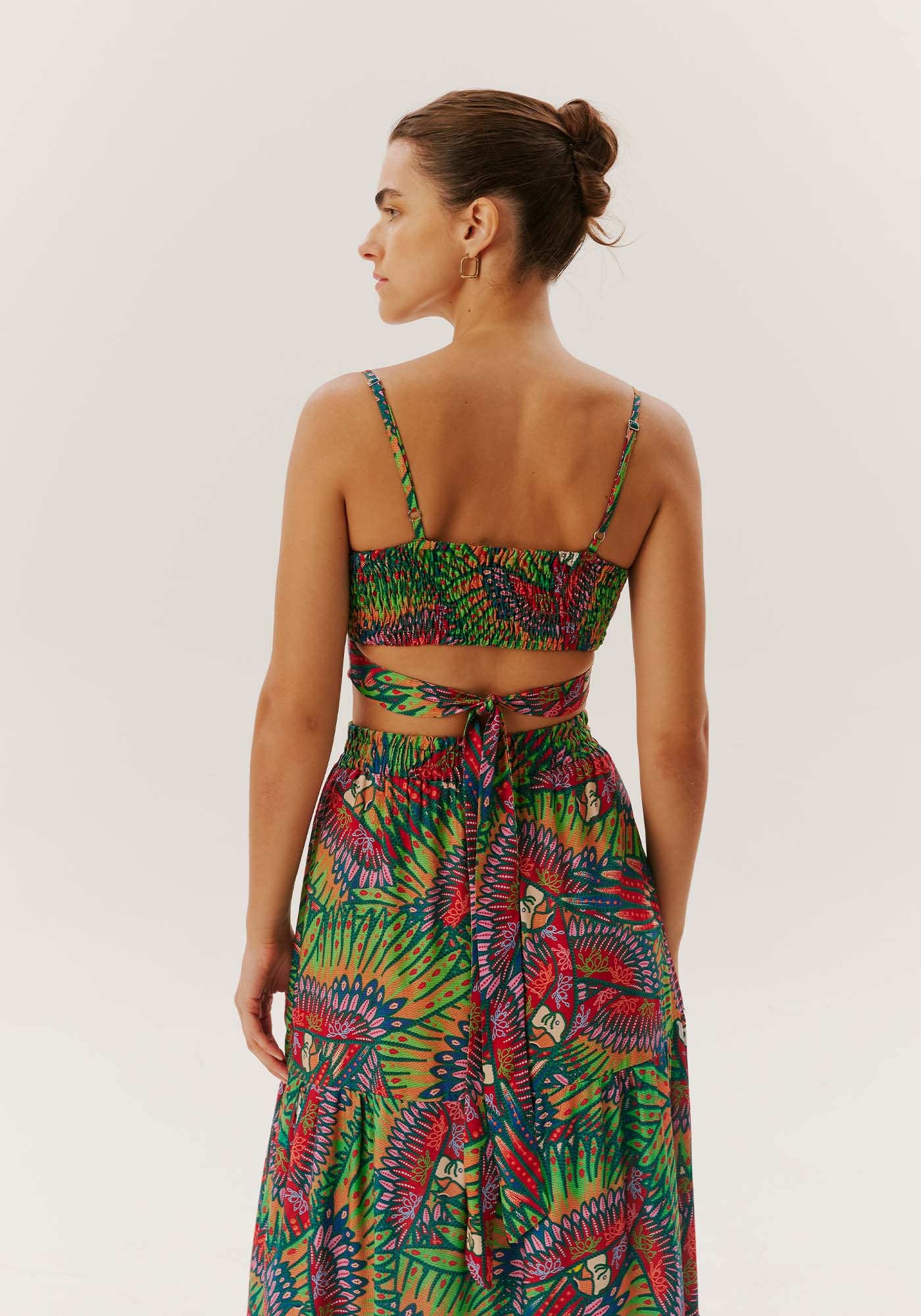 Nosso cropped em 100% viscose, alçasfinas, laço nas costas e estampa de araras vermelhas. Uma celebração da culturabrasileira, este top traz alegria e sol em cada detalhe. O tecido leve emviscose torna-o perfeito para os dias quentes. Elegância e frescor se encontramneste cropped que é puro charme tropical.