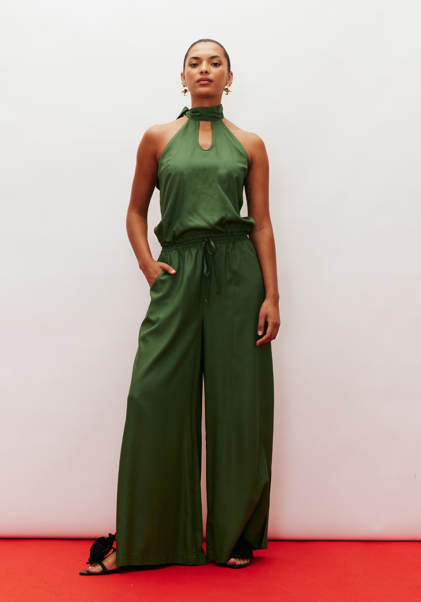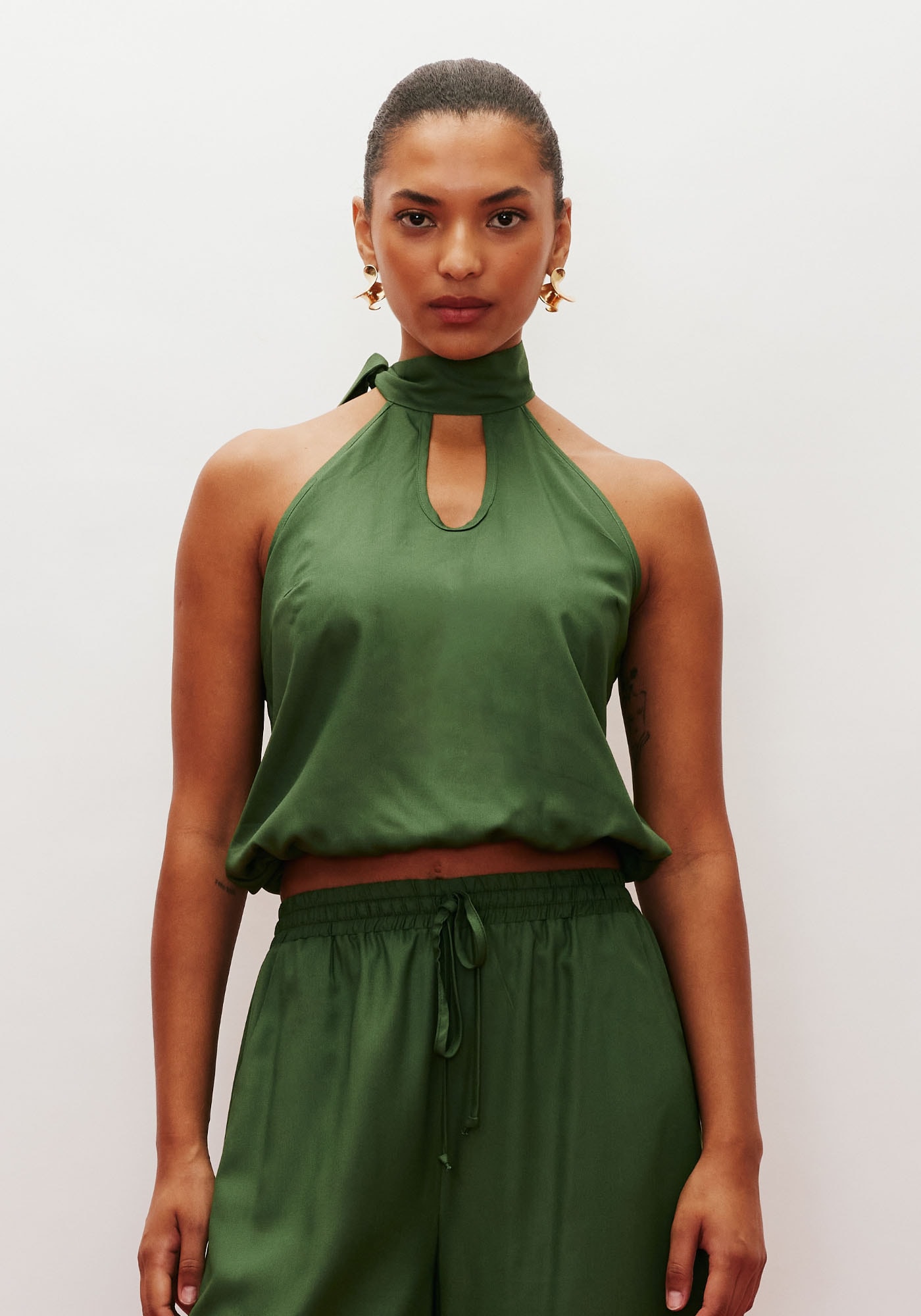 Sofisticado, o cropped confeccionadoem tecido 100% viscose possui gola alta com amarração no pescoço, dando umtoque de elegância para a peça. O lastex na cintura proporciona mais conforto eadaptabilidade ao corpo.