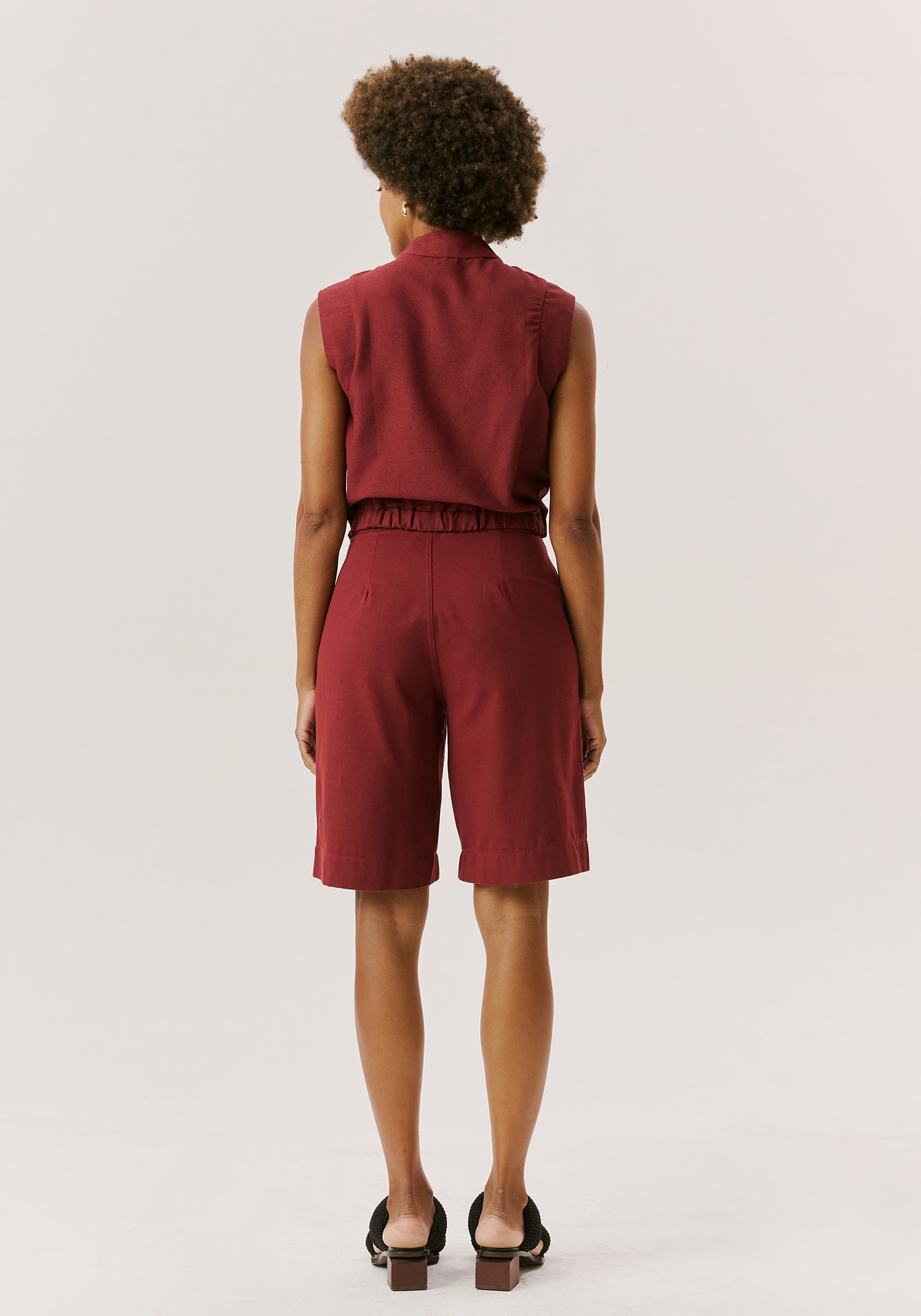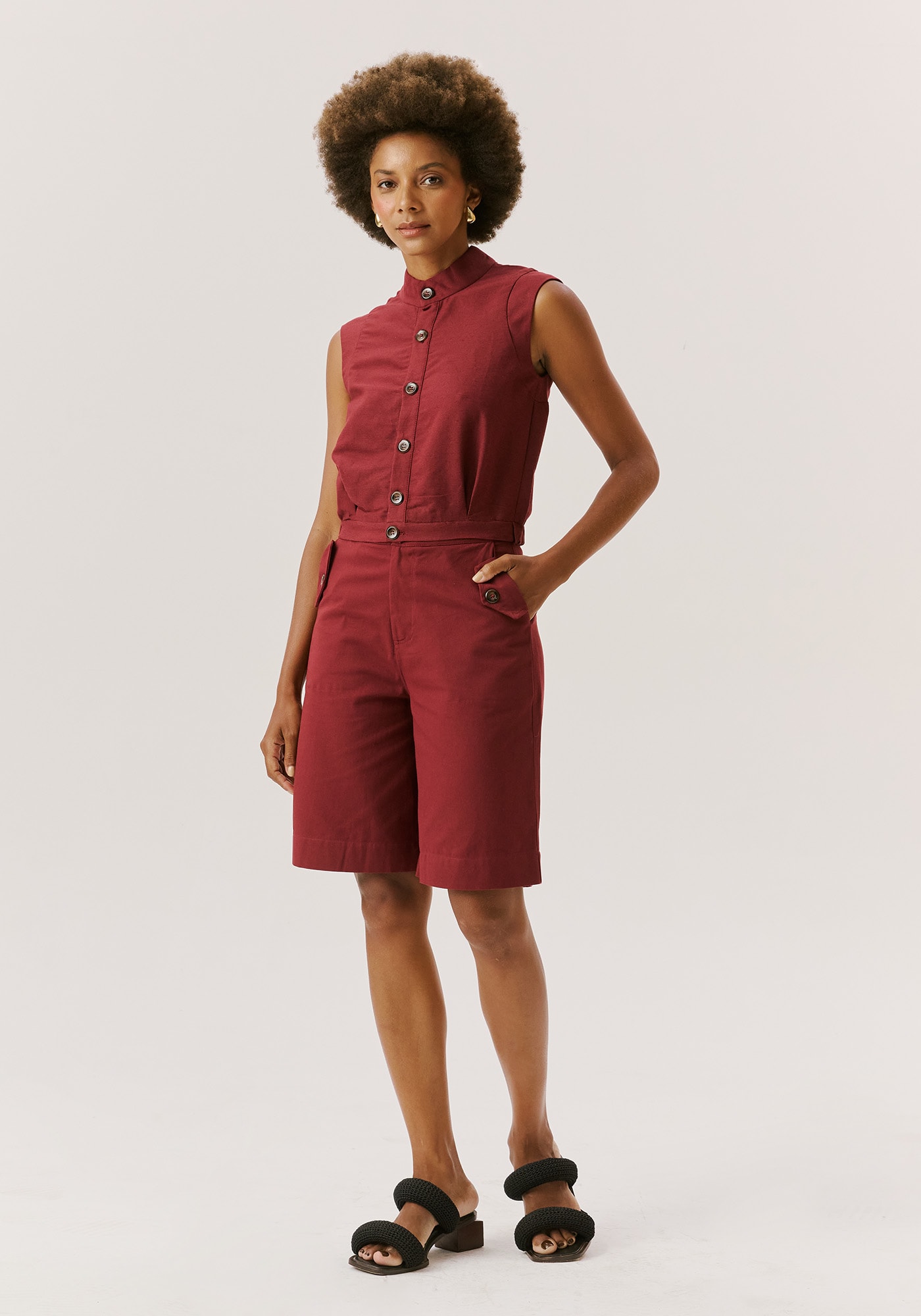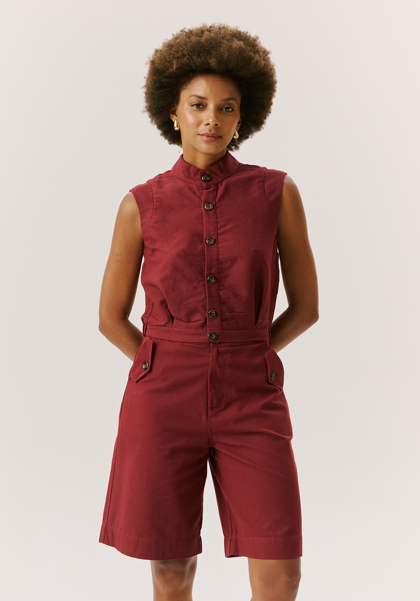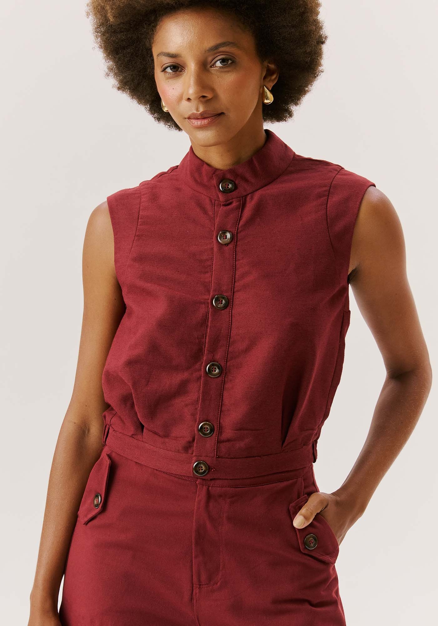 Confeccionado em tecido 42%algodão 38% viscose 14% modal e 6% linho, o cropped é um modelo sem manga, comfechamento frontal em botão. Possui uma golinha alta e elástico na parte detrás.