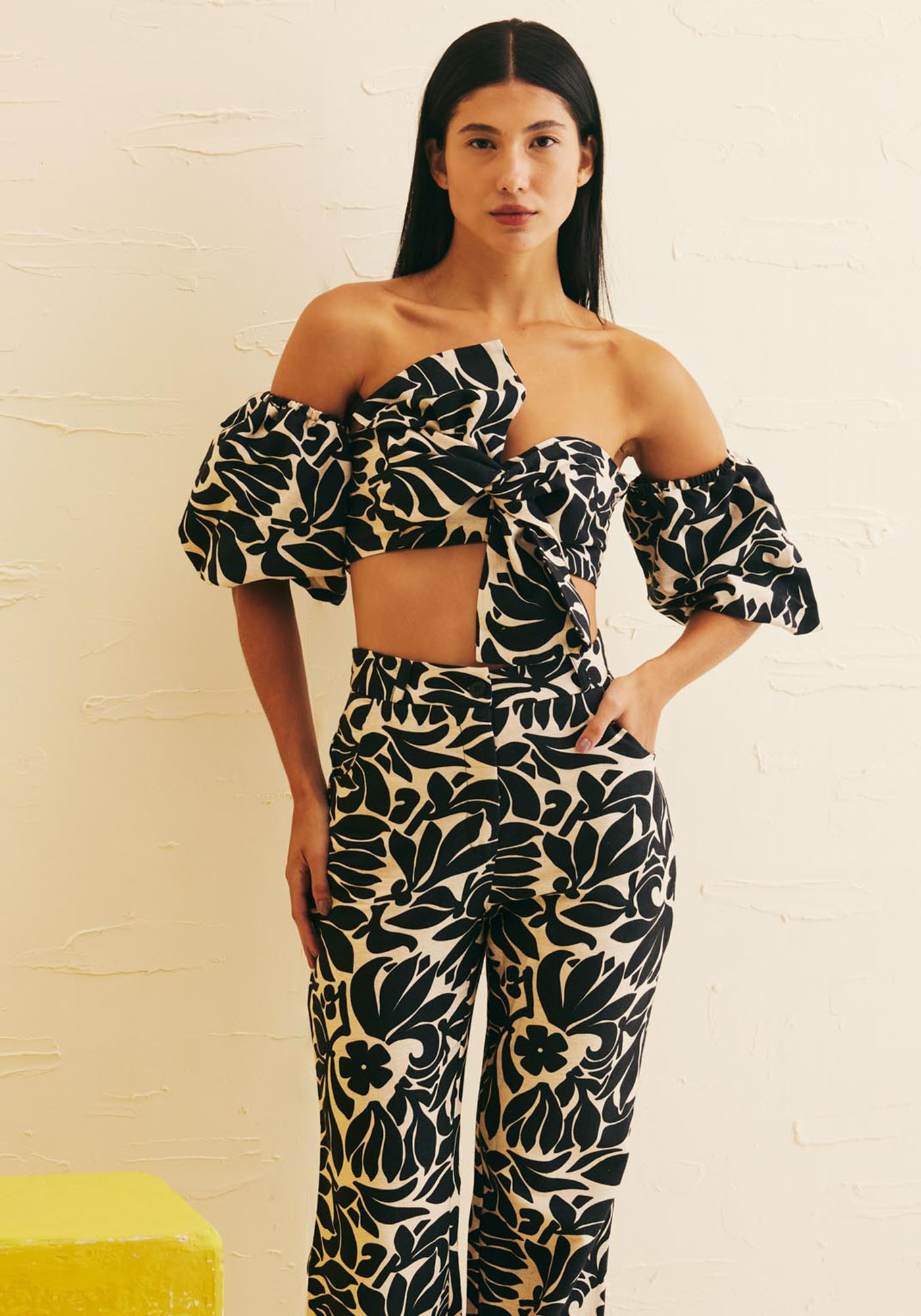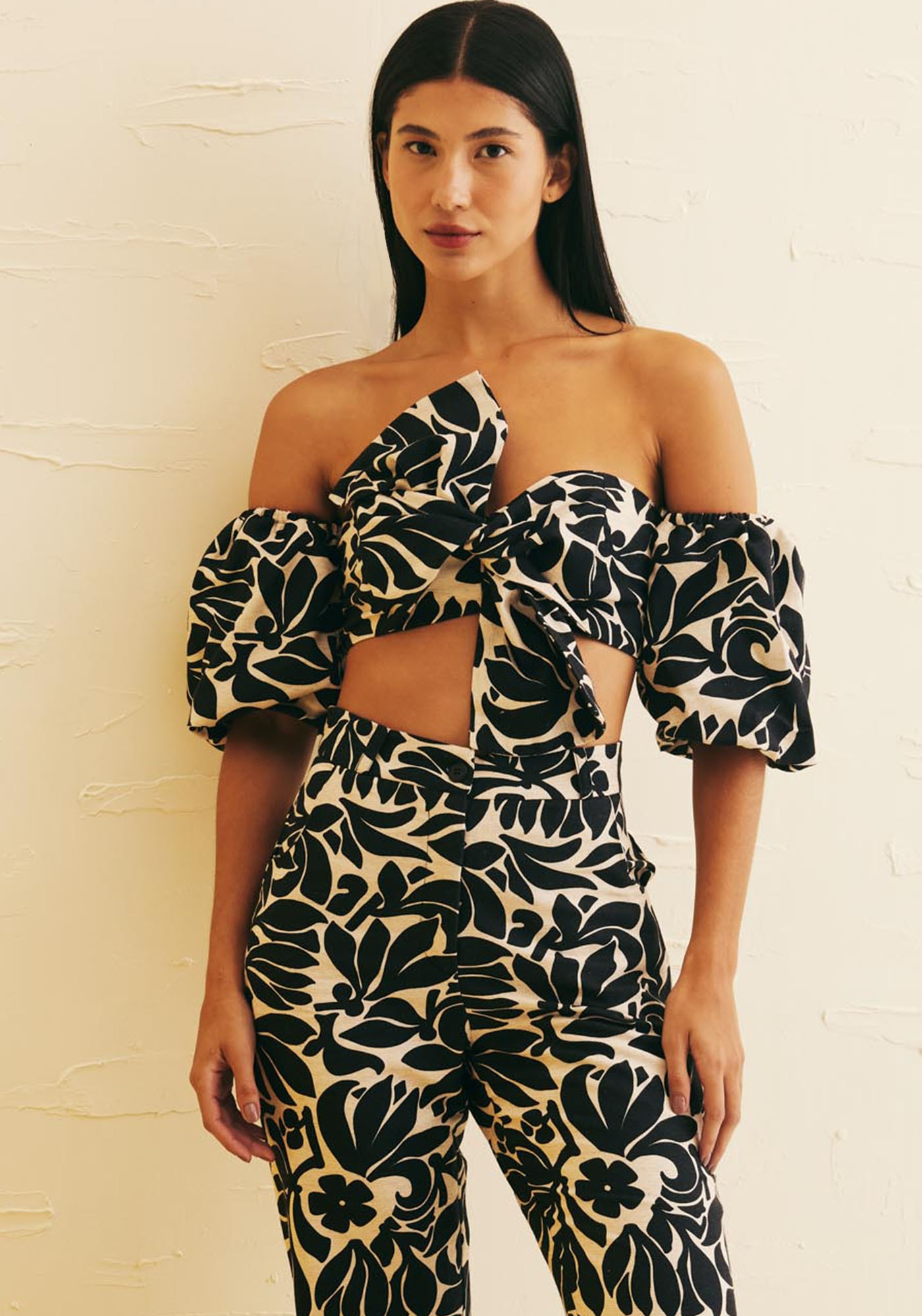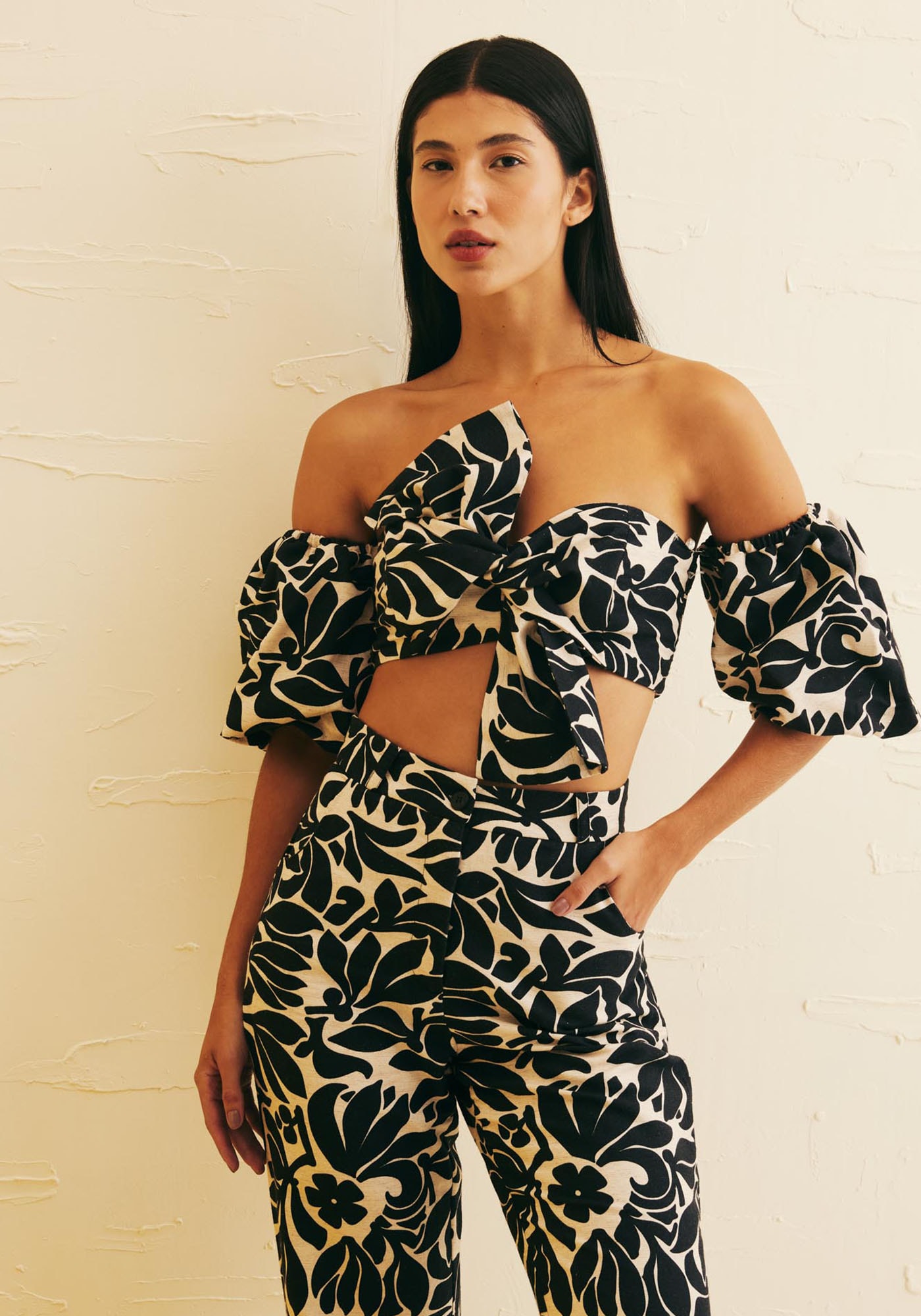 Confeccionadoem tecido 42% algodão 38% viscose 14% modal e 6% linho, o cropped tomara quecaia é uma peça exuberante. O modelo possui manga balonê, que pode ser destacadaa partir de um botão interno. O laço na frente realça ainda mais a peça, dandoum toque elegantíssimo. O lastex nas costas favorece a vestibilidade e a adaptaçãoao corpo.