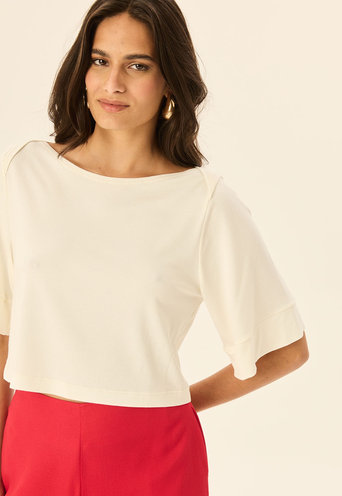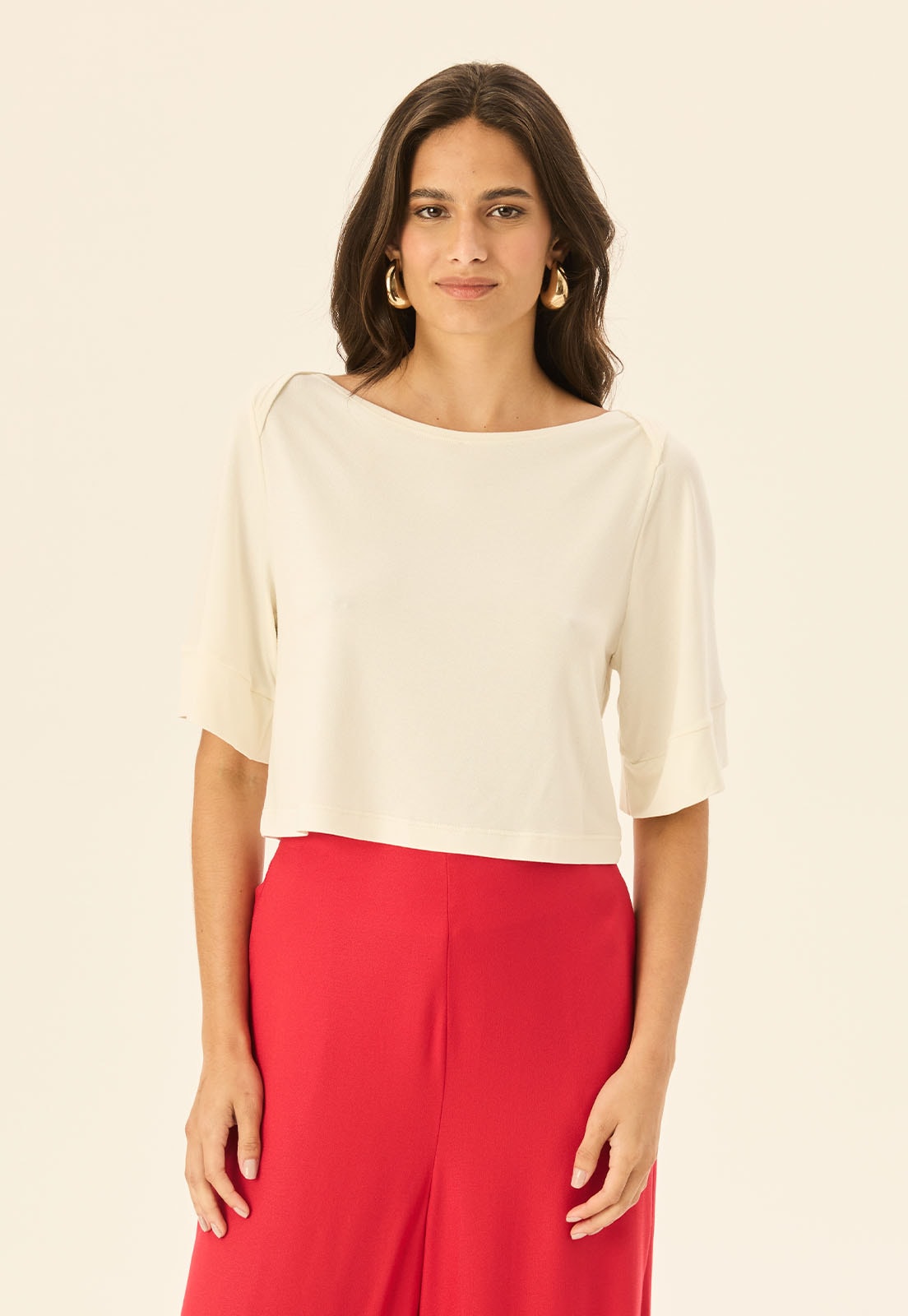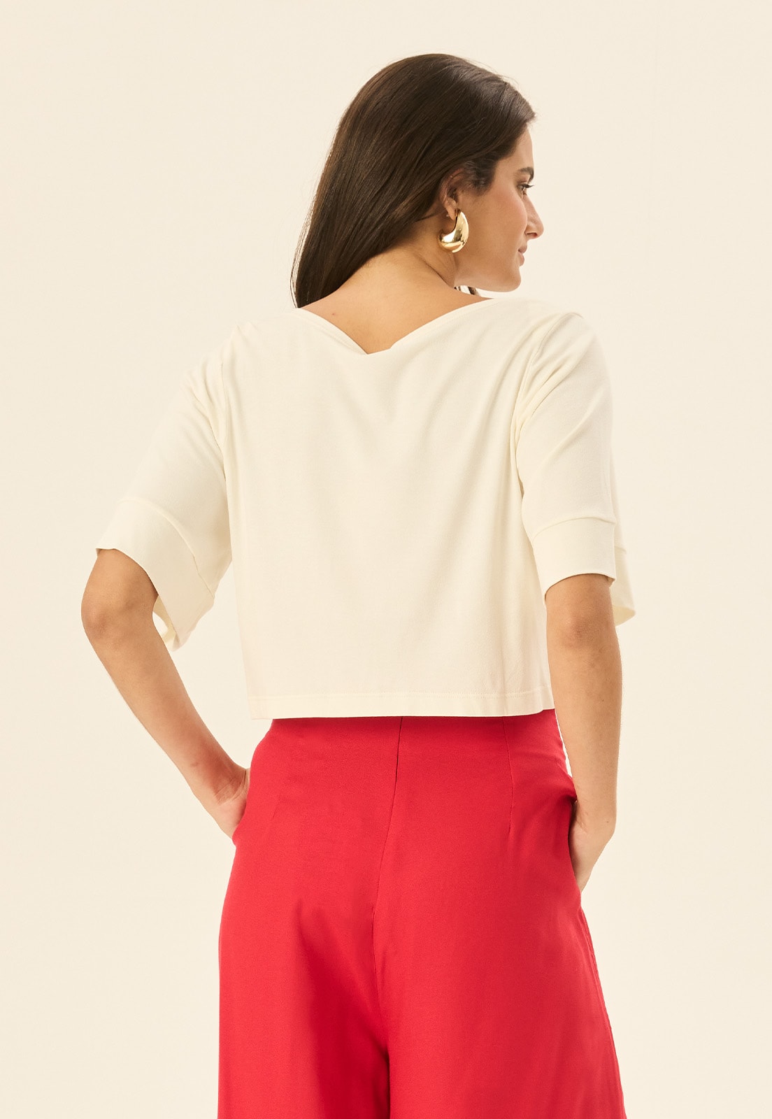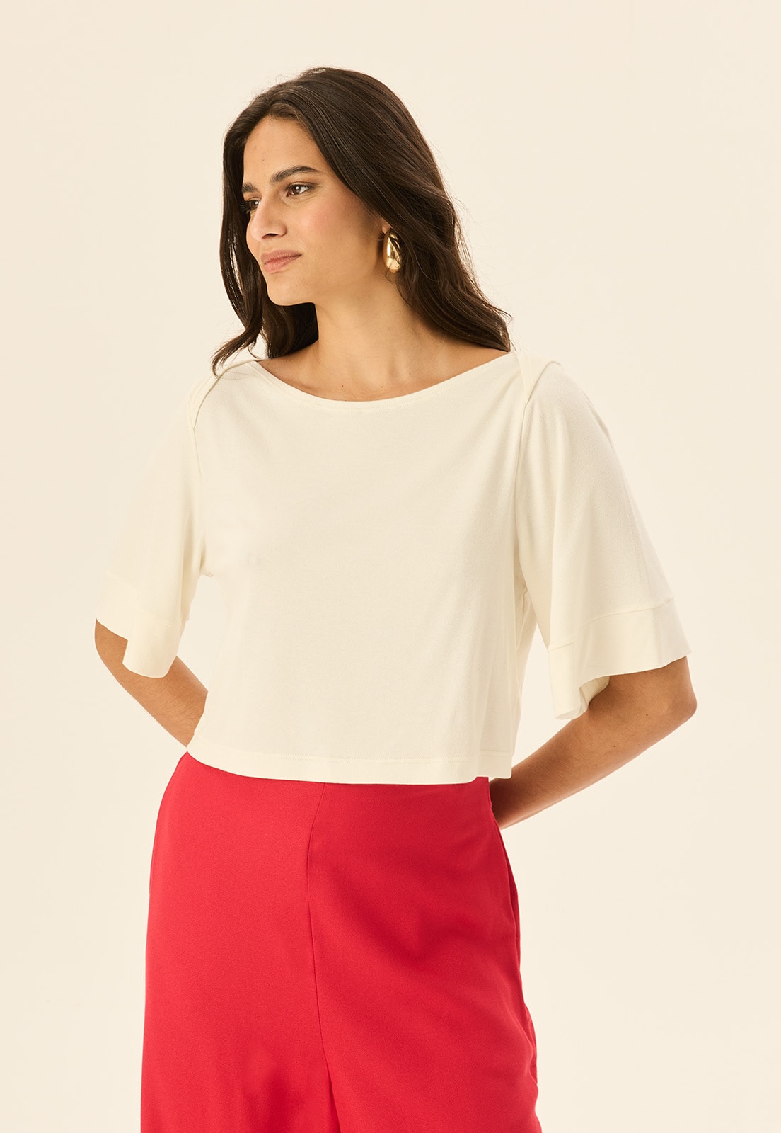 O Cropped Manga Ampla CaCay é a escolha ideal para quem busca elegância com leveza. Com modelagem reta e comprimento que valoriza a silhueta, ele traz mangas amplas até o cotovelo com punhos dobrados, criando um visual contemporâneo e sofisticado. Confeccionado em malha macia com 96% viscose e 4% elastano, oferece caimento fluido e toque suave, garantindo conforto absoluto em qualquer ocasião do casual ao urbano chic.