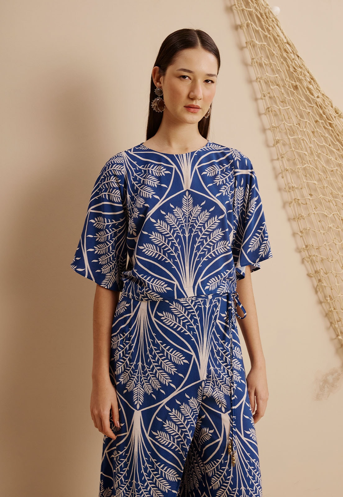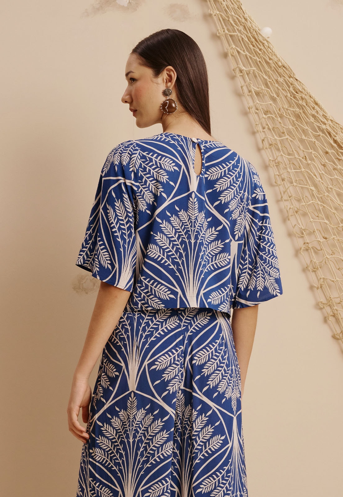 O Cropped Manga Ampla Estampado Miriti da CaCay é a escolha ideal para quem busca leveza e estilo em uma única peça. Confeccionado em 100% viscose, seu toque é suave e o caimento fluido valoriza diferentes silhuetas com conforto e elegância. As mangas amplas conferem movimento e sofisticação, enquanto a estampa com elementos geométricos inspirados na natureza adiciona um charme atemporal. O detalhe de abertura na parte superior das costas complementa o design com delicadeza e personalidade.
