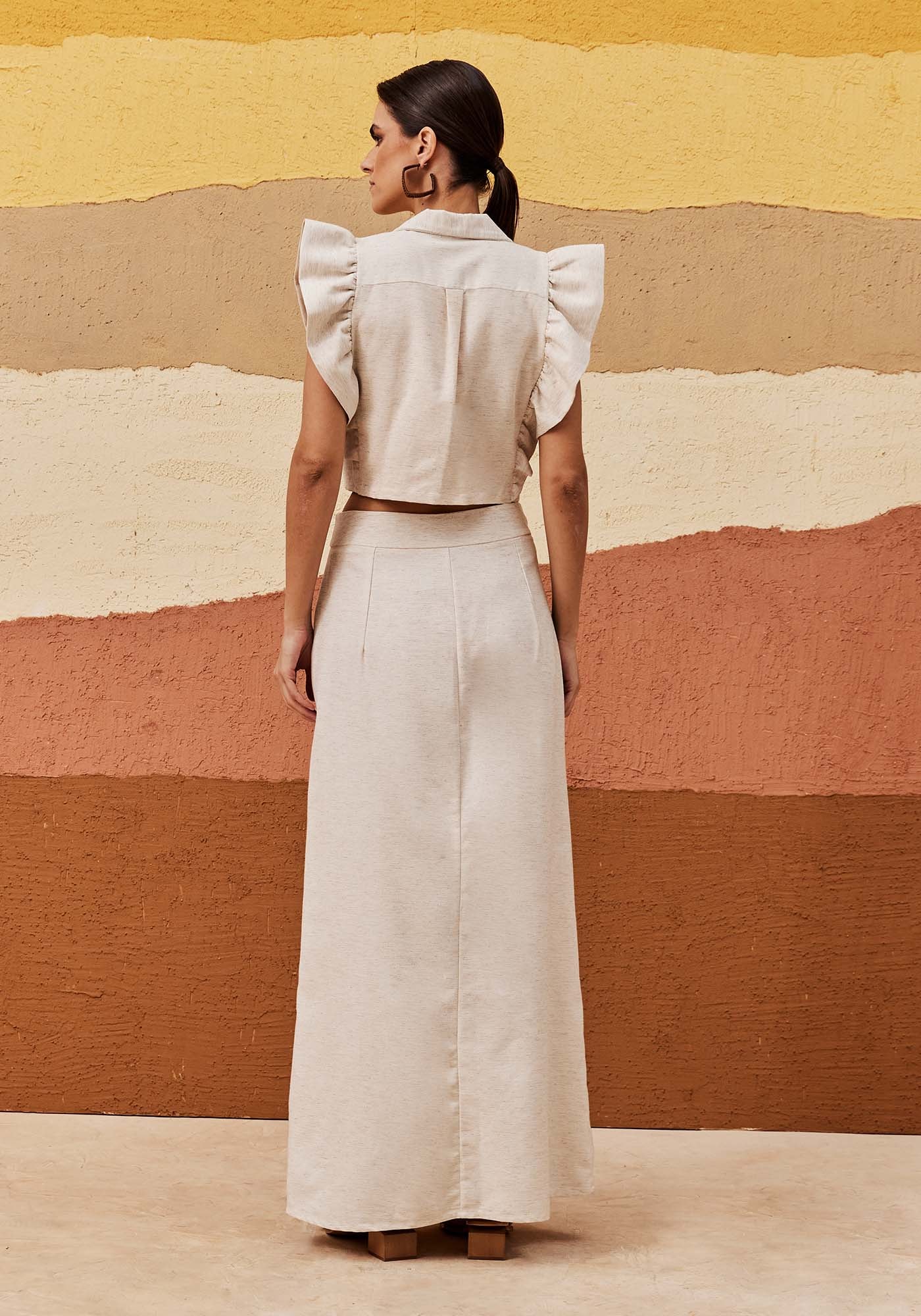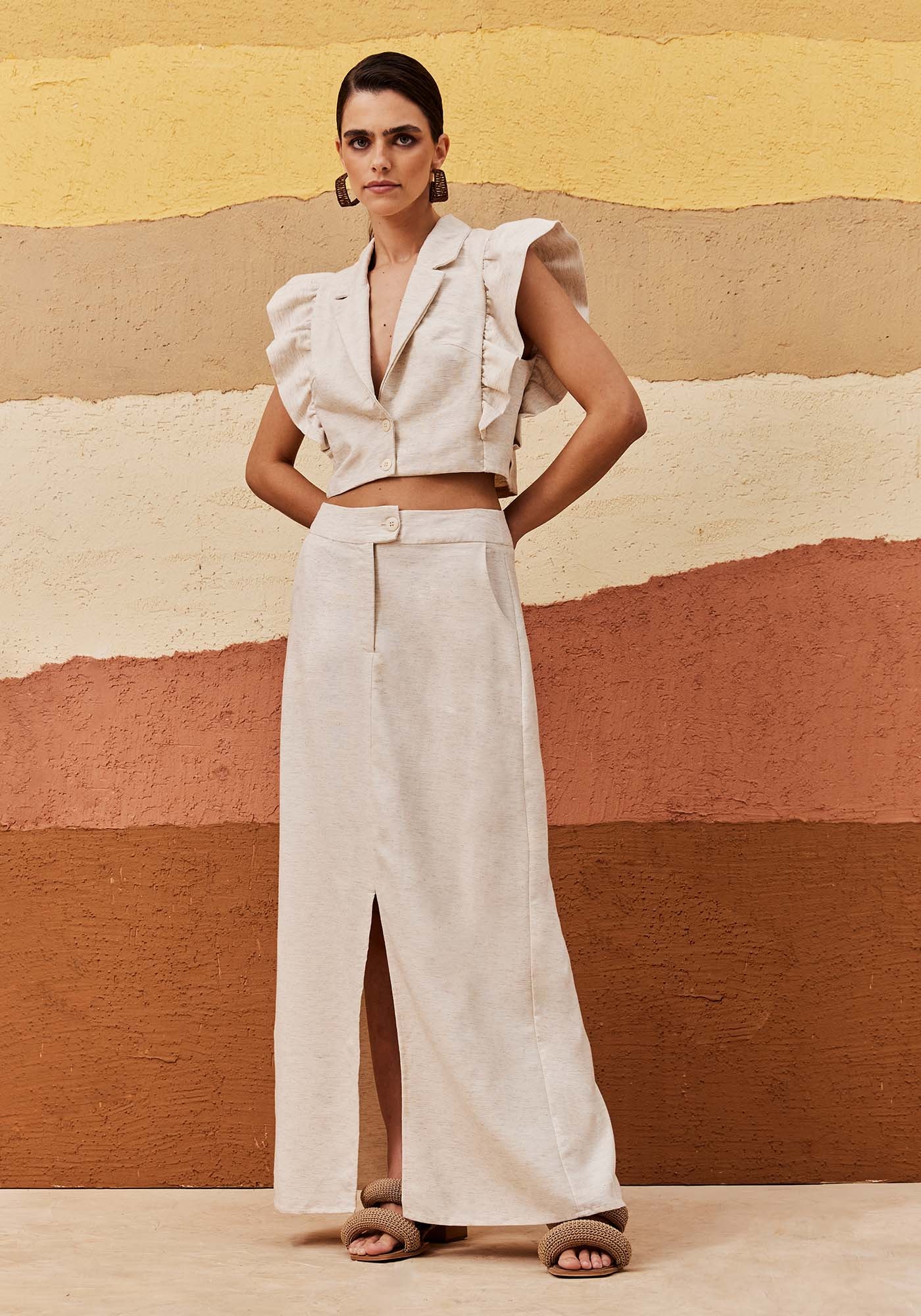 O Blazer Cropped é uma peça elegante e moderna, perfeita para compor looks sofisticados. Com gola clássica e abotoamento frontal, o destaque fica por conta das mangas com detalhes em babado, que trazem um toque de feminilidade e movimento. A composição do tecido combina 42% Algodão, 38% Viscose, 15% Modal e 6% Linho, garantindo conforto e caimento impecável. Ideal para quem busca peças versáteis e cheias de personalidade.