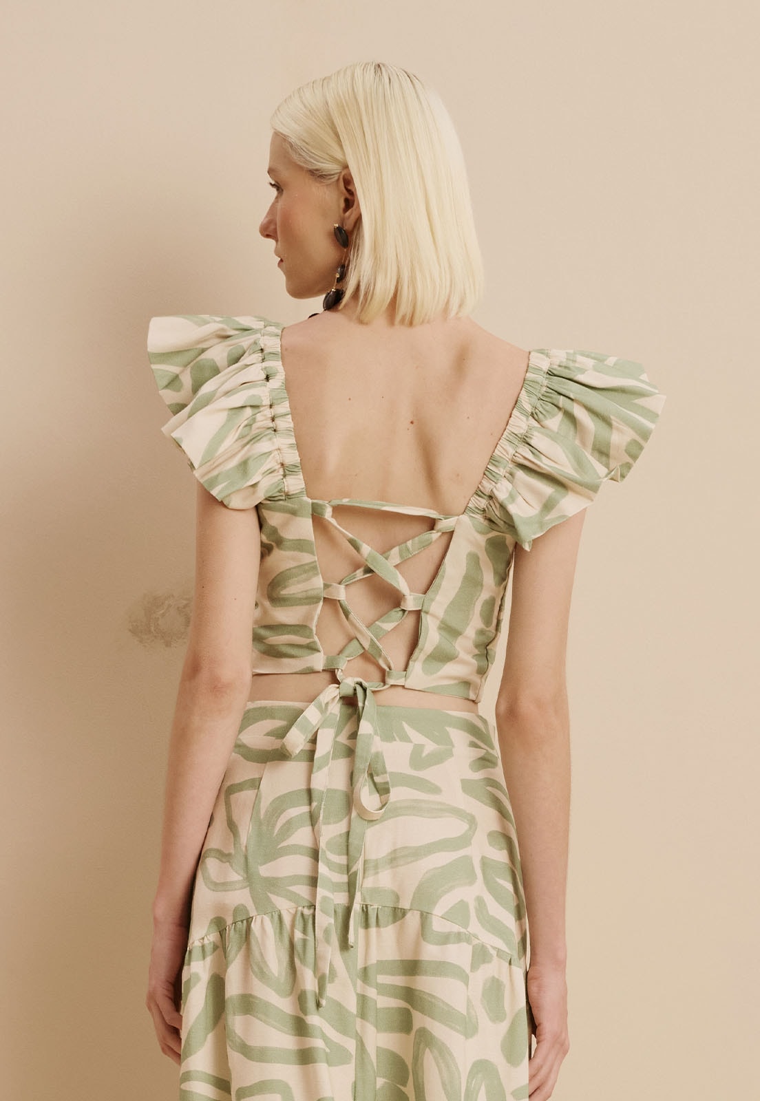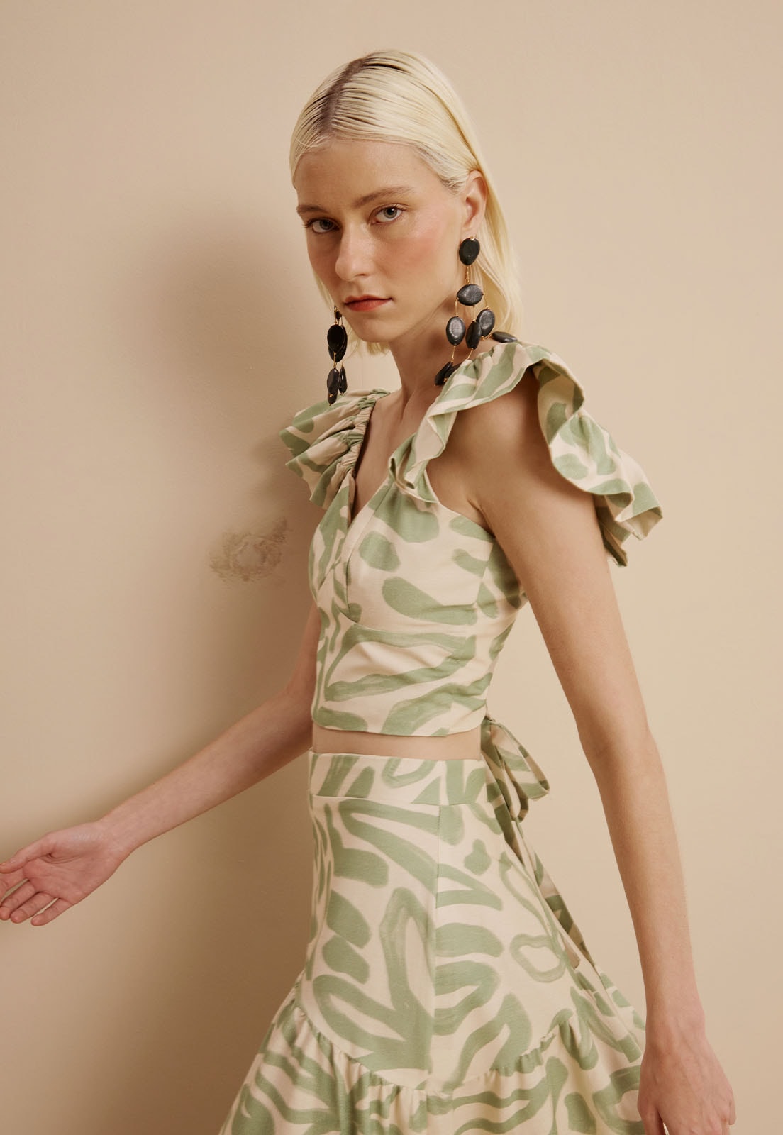 O Cropped Manga Babado Estampado Jari CaCay é a peça perfeita para quem busca leveza e estilo com um toque sofisticado. Confeccionado em tecido de alta qualidade (70% algodão e 30% viscose), oferece caimento confortável e respirável, ideal para dias quentes ou produções elegantes em ambientes descontraídos. As mangas com babados adicionam movimento e charme, enquanto a estampa orgânica traz personalidade sem exageros. O detalhe das amarrações nas costas garante ajuste sob medida e valoriza a silhueta com delicadeza.