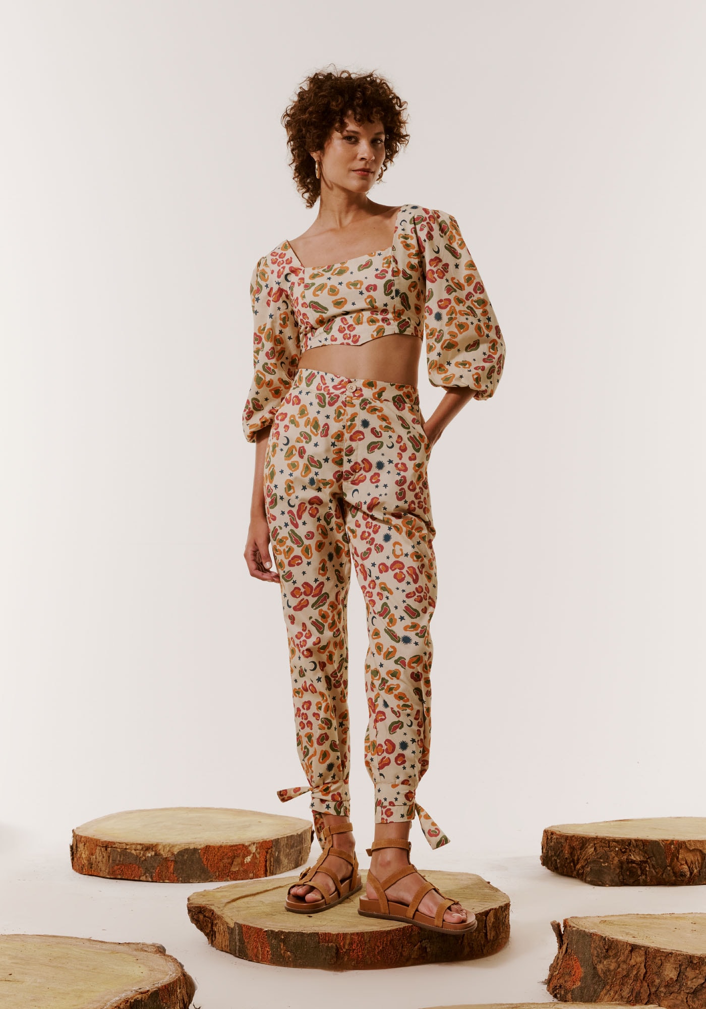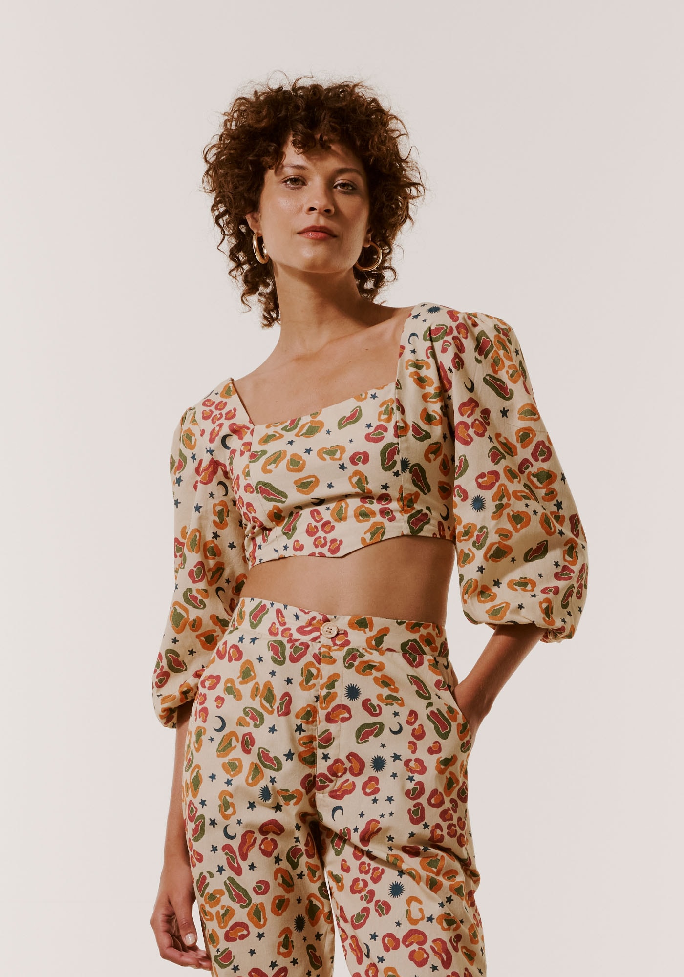 Confeccionadoem 100% algodão, o Cropped com Manga Bufante Estampado Onça Pintada possui odecote quadrado e manga ¾ bufante, dando um toque romântico à peça.