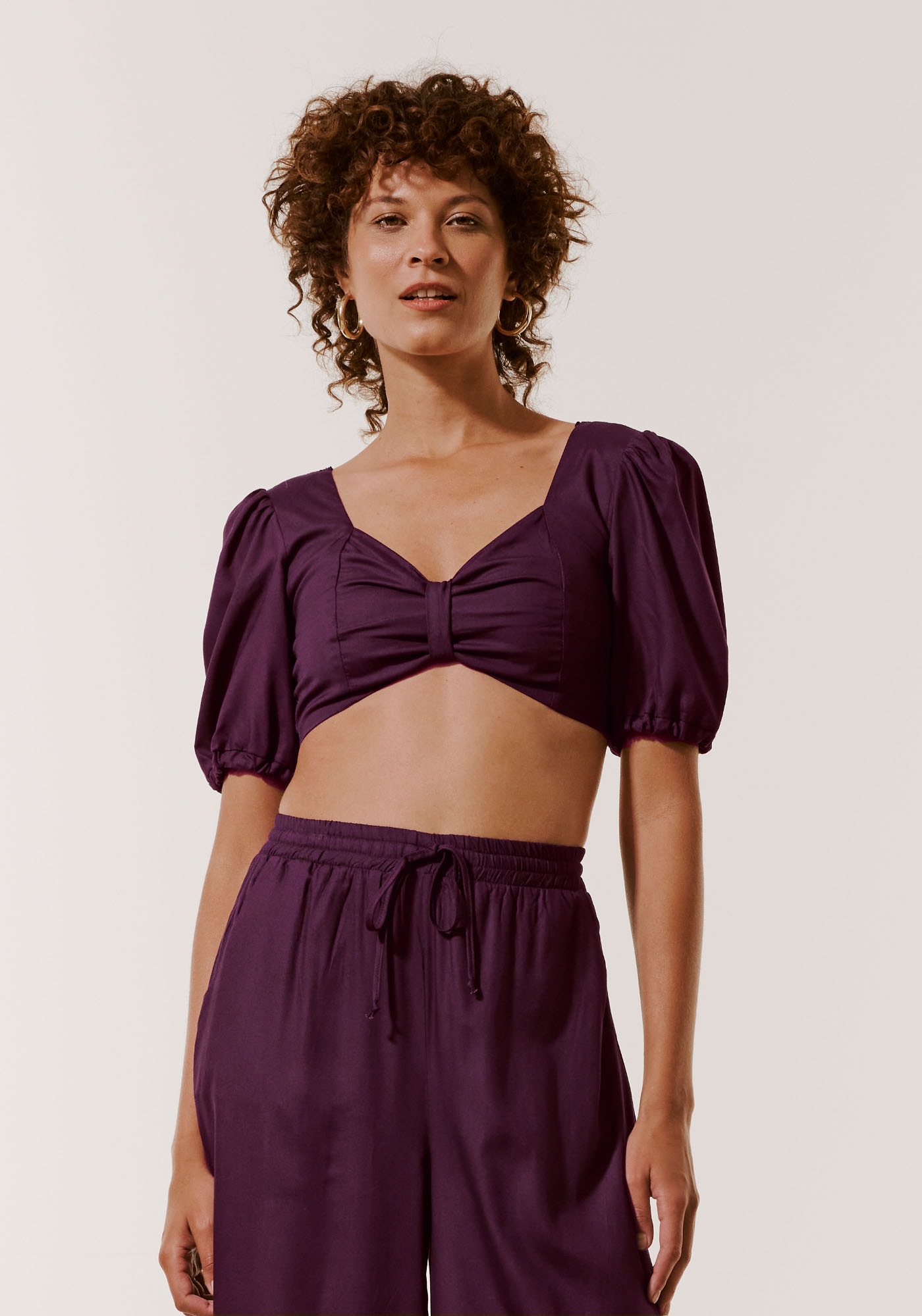 Confeccionado em tecido 100% viscose, o cropped possui manga curta bufante e um decote diferenciado, ajustado no busto, que valoriza a silhueta.