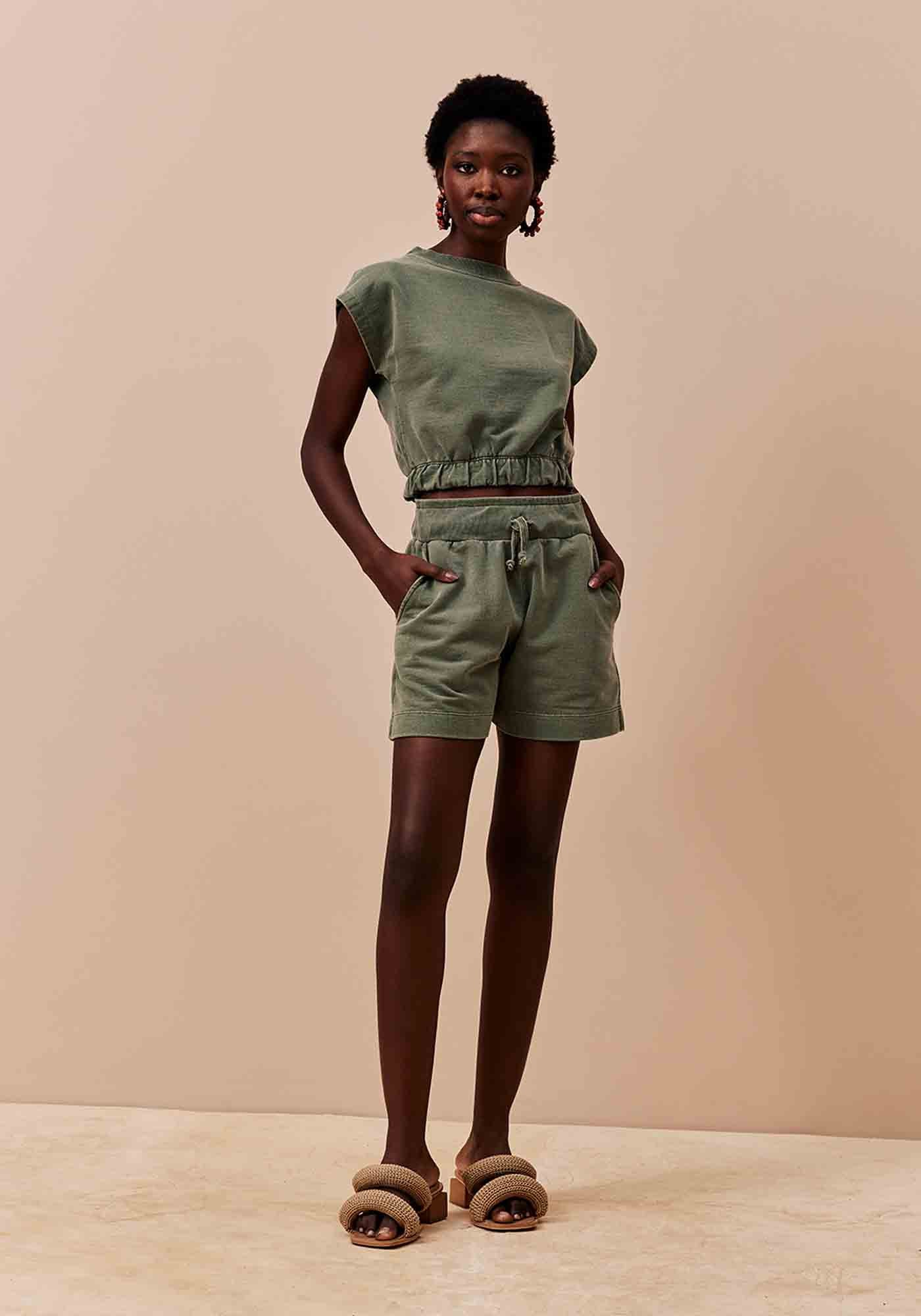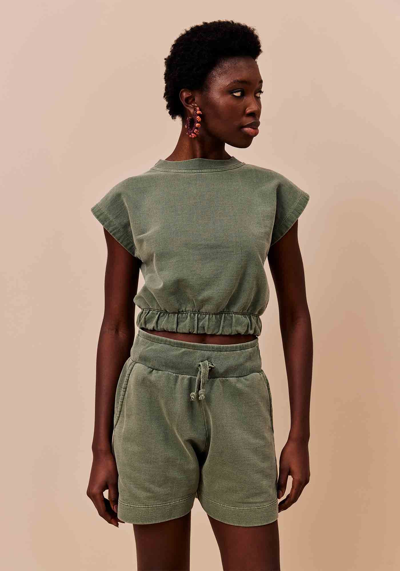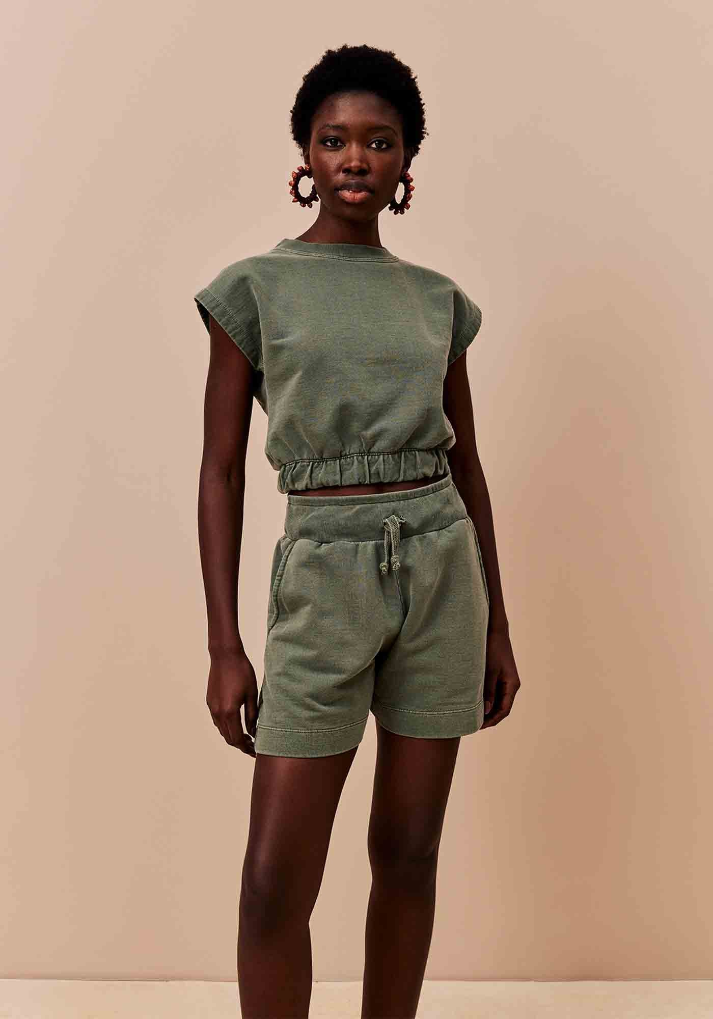 Confeccionado em malha, o cropped estonado é uma peça básica e confortável. O modelo possui manga japonesa e elástico na barra, sendo uma peça estilosa e versátil.