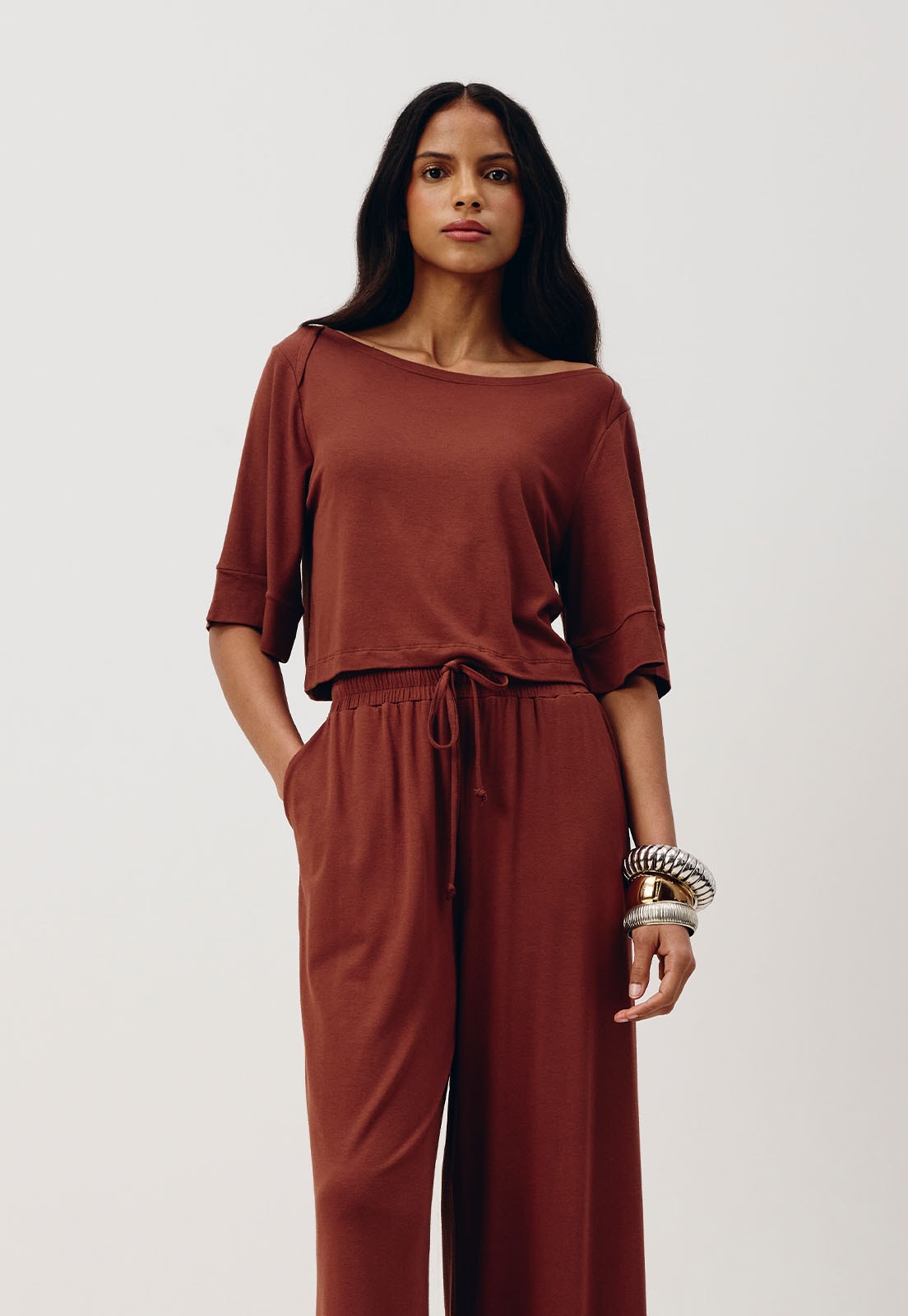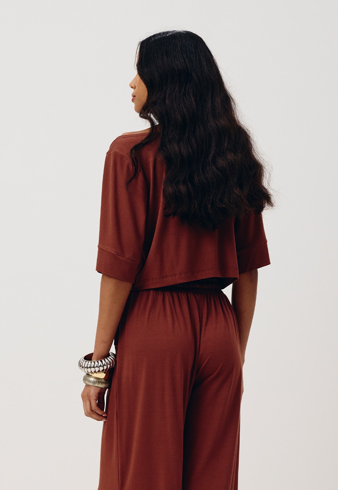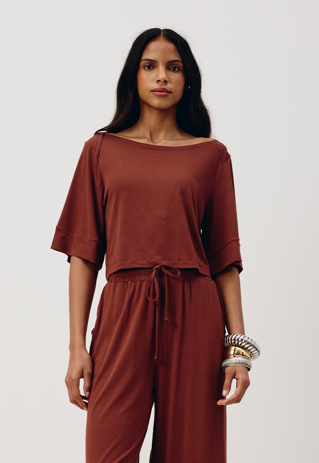 O cropped liso é confeccionado em tecido 96% viscose e 4% elastano. O modelo versátil possui manga ¾ estilo kimono e um o shape amplo. É um modelo confortável e versátil, que pode ser combinado com diversas peças da coleção.