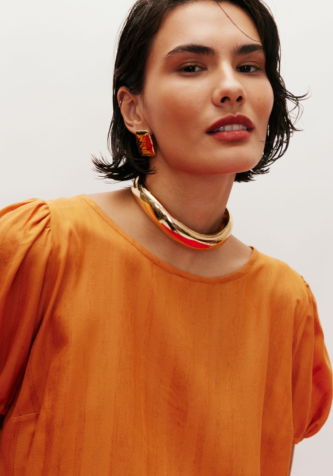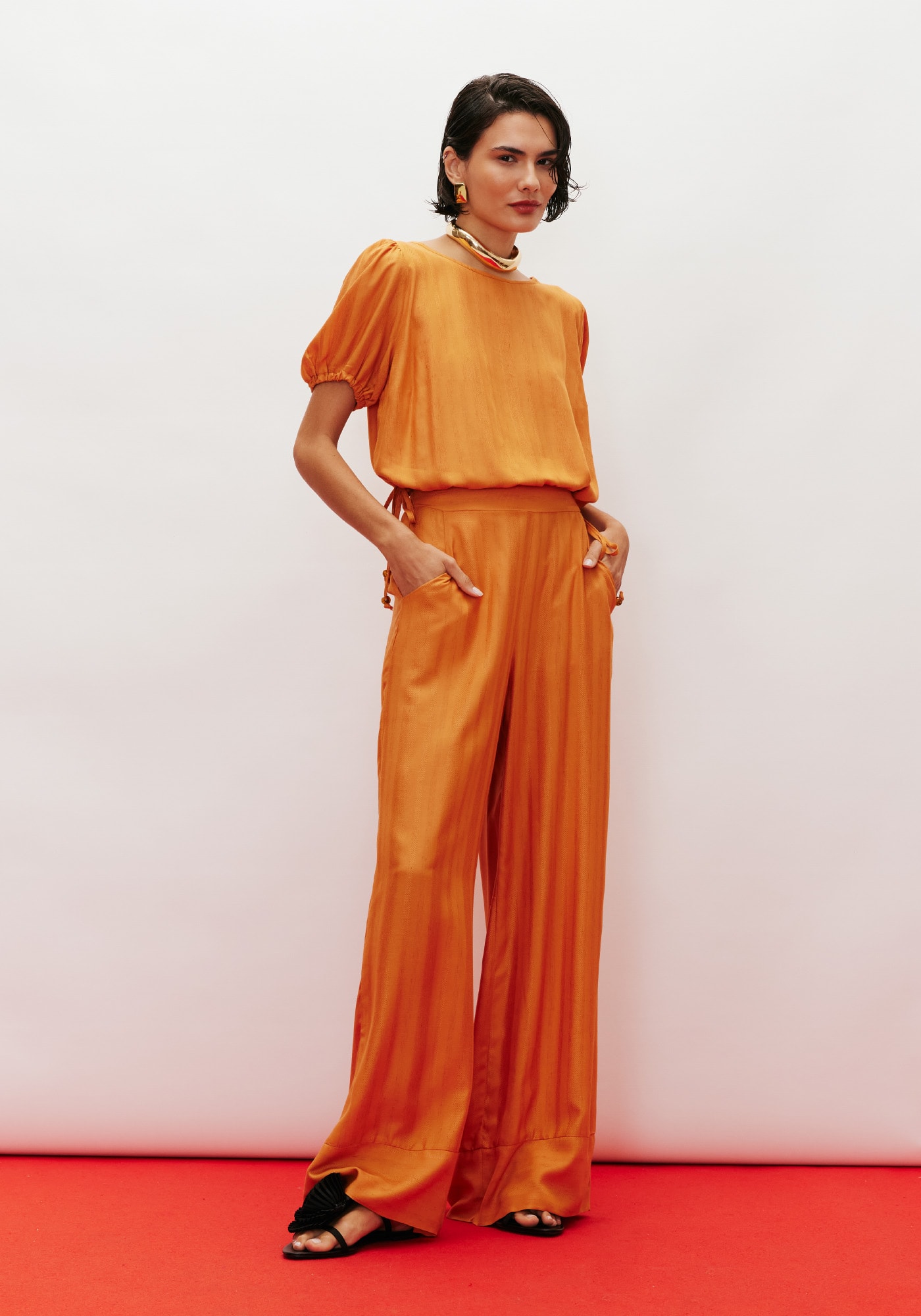 Modelo sofisticado e versátil,o cropped é confeccionado em tecido 97% viscose 3% linho. A peça é finalizadacom amarração em túnel com rolotê e as mangas bufantes com elástico. O croppedainda possui um decote redondo e detalhe do fechamento com botão na parte detrás para dar maior segurança.