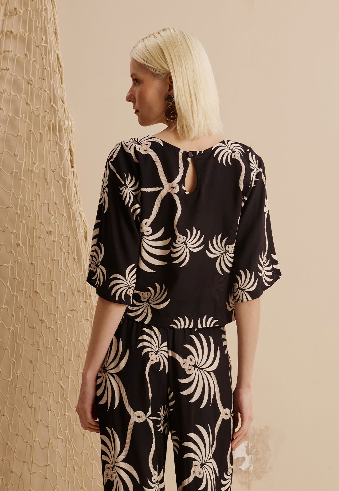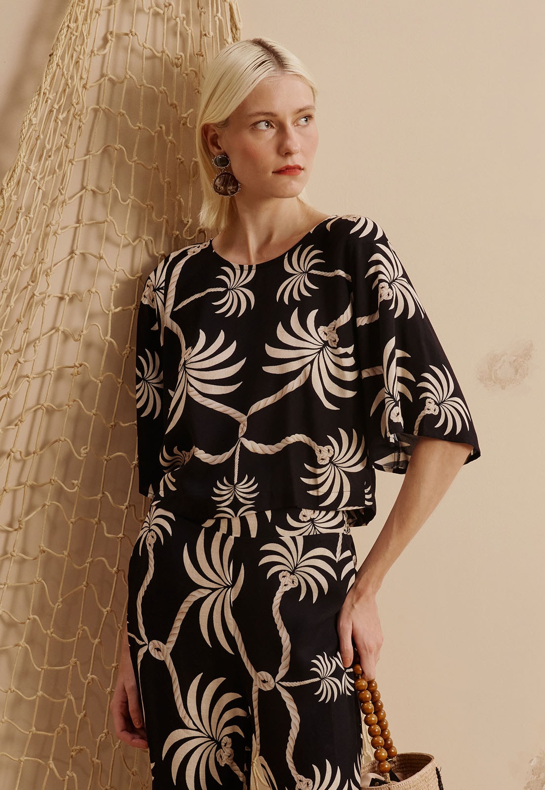 O Cropped Mangas Amplas Estampado Carnaúba da CaCay é a escolha perfeita para quem busca leveza e sofisticação em uma peça única. Com design fluido e mangas amplas que valorizam o movimento, ele traz uma estampa inspirada em formas orgânicas e simétricas, criando um visual marcante sem exageros. O recorte discreto nas costas adiciona um toque de charme e delicadeza, enquanto a composição 100% viscose garante frescor e conforto ao vestir, ideal para dias quentes e ocasiões que pedem estilo com liberdade.
