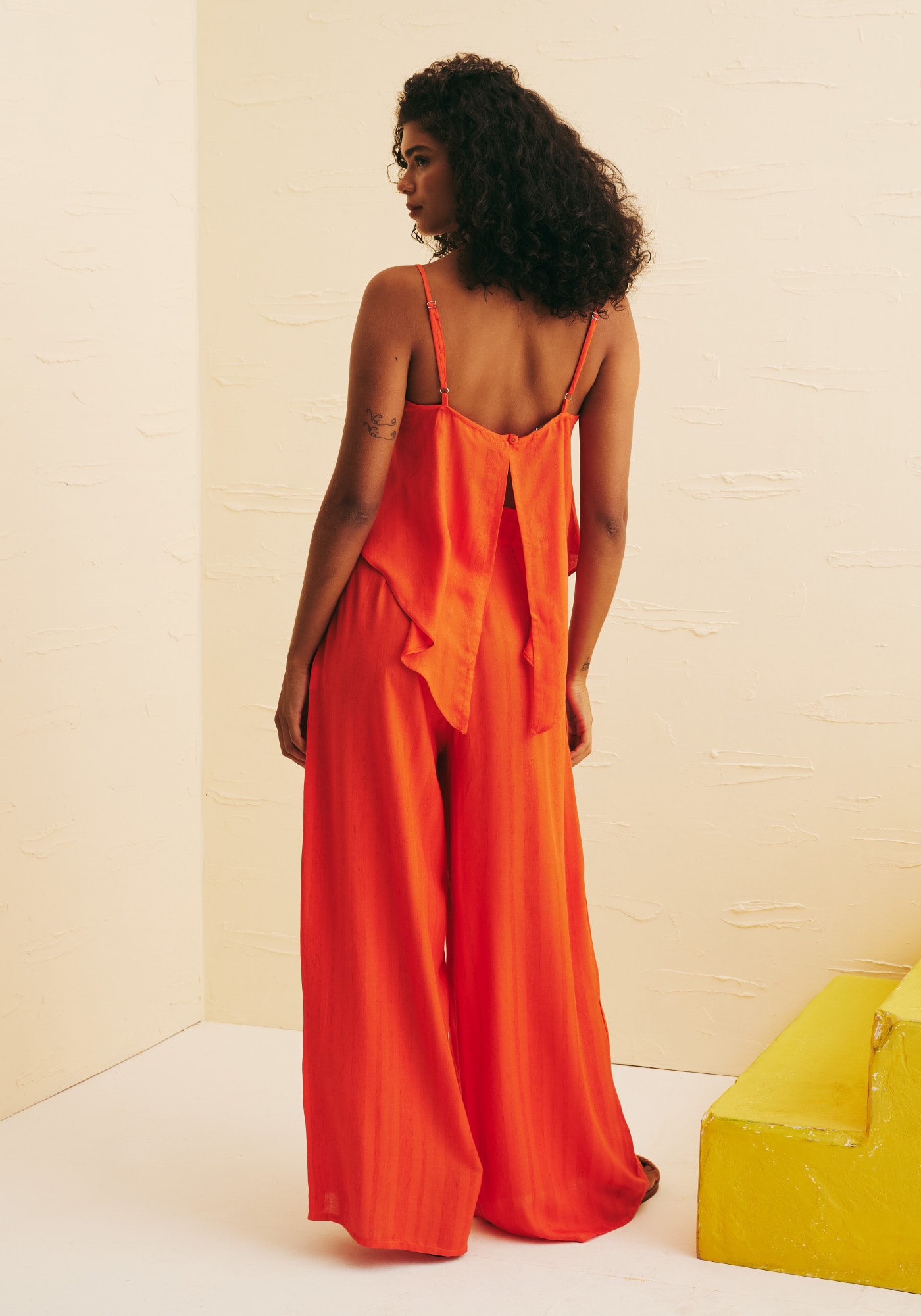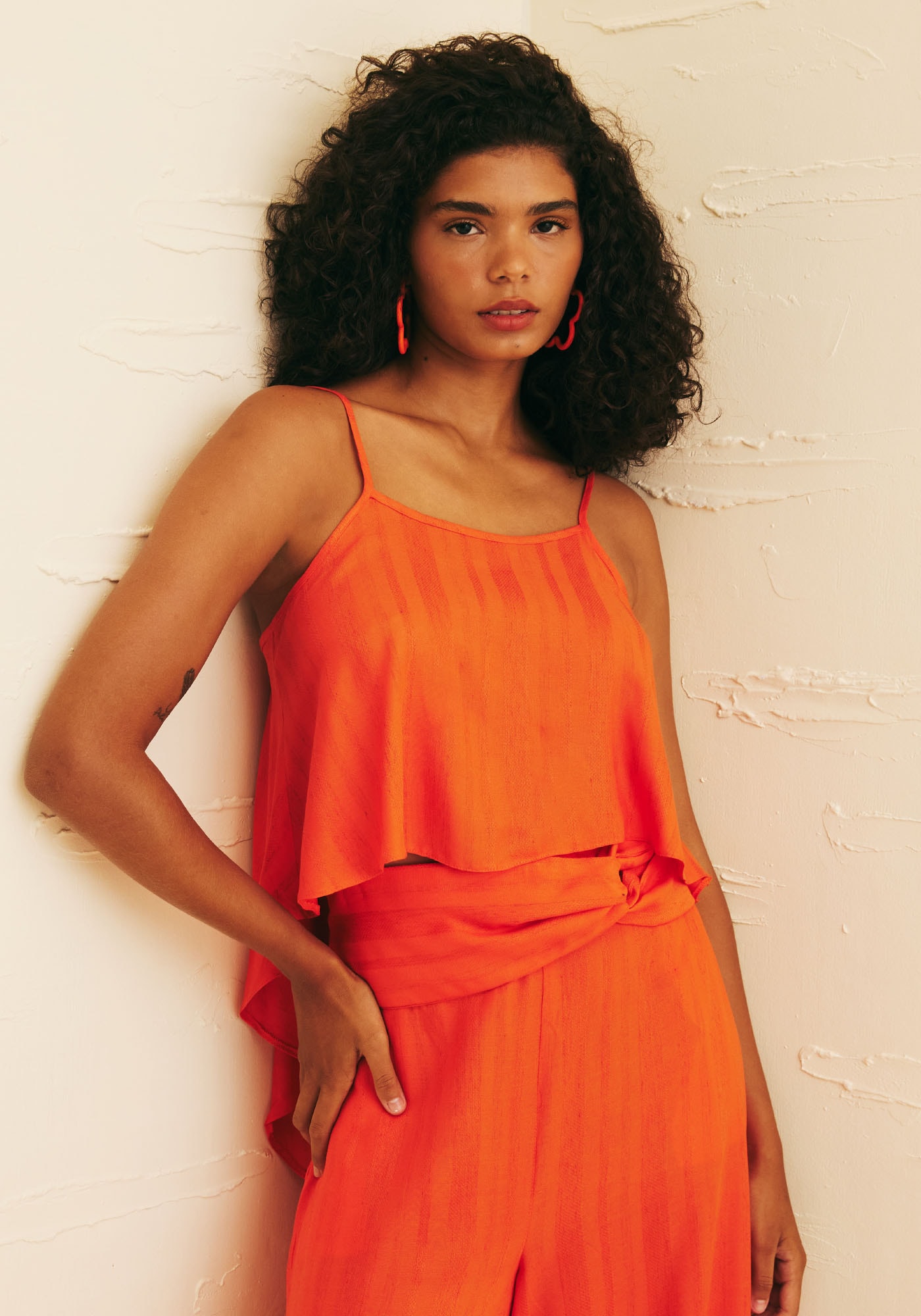 Confeccionado em tecido 97% viscose e 3% linho,o cropped é uma peça super versátil e prática, que combina com diferenteslooks. O modelo possui alças finas com regulador e shape soltinho. A parte de trásé aberta nas costas e conta com o abotoamento nas costas.