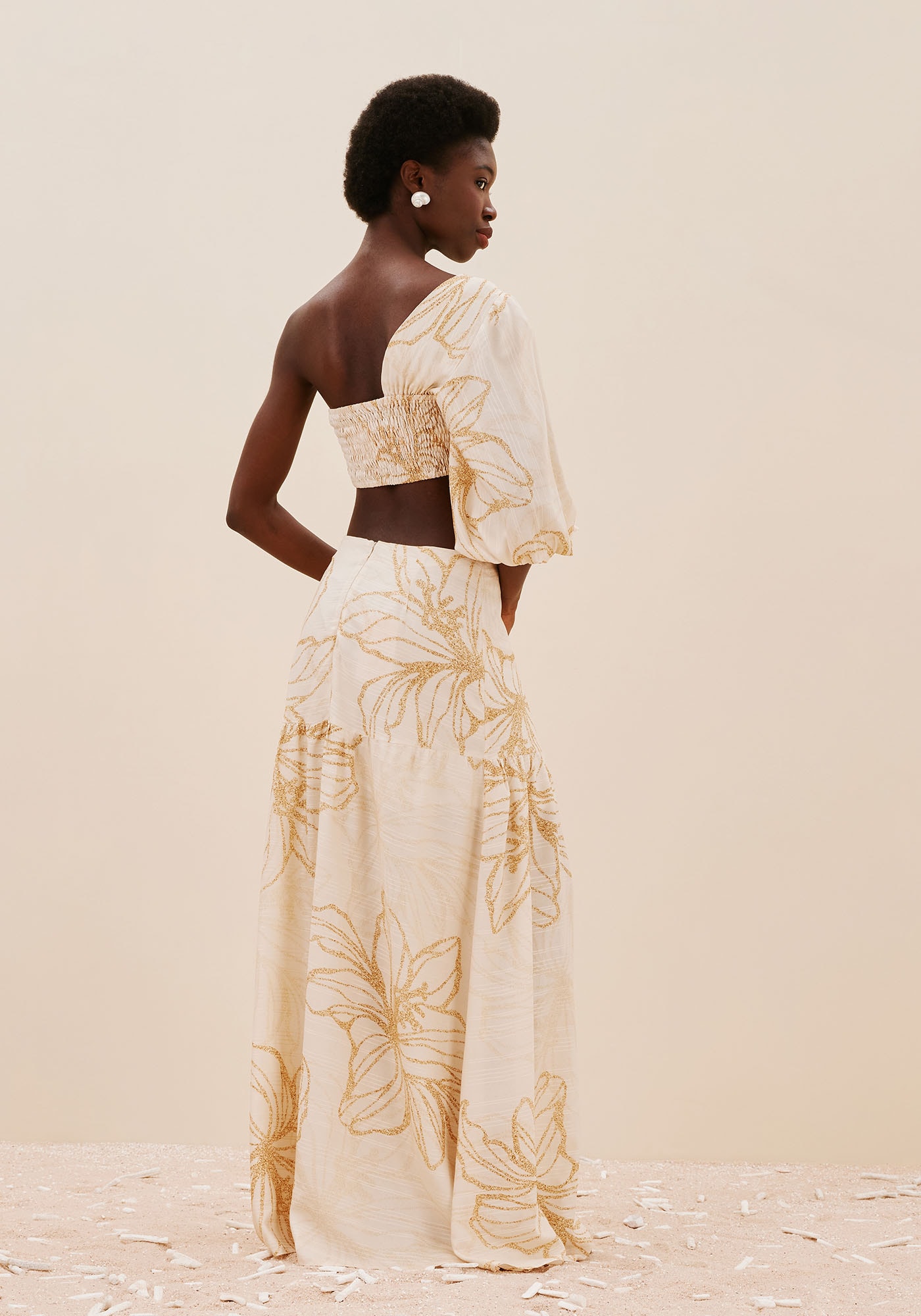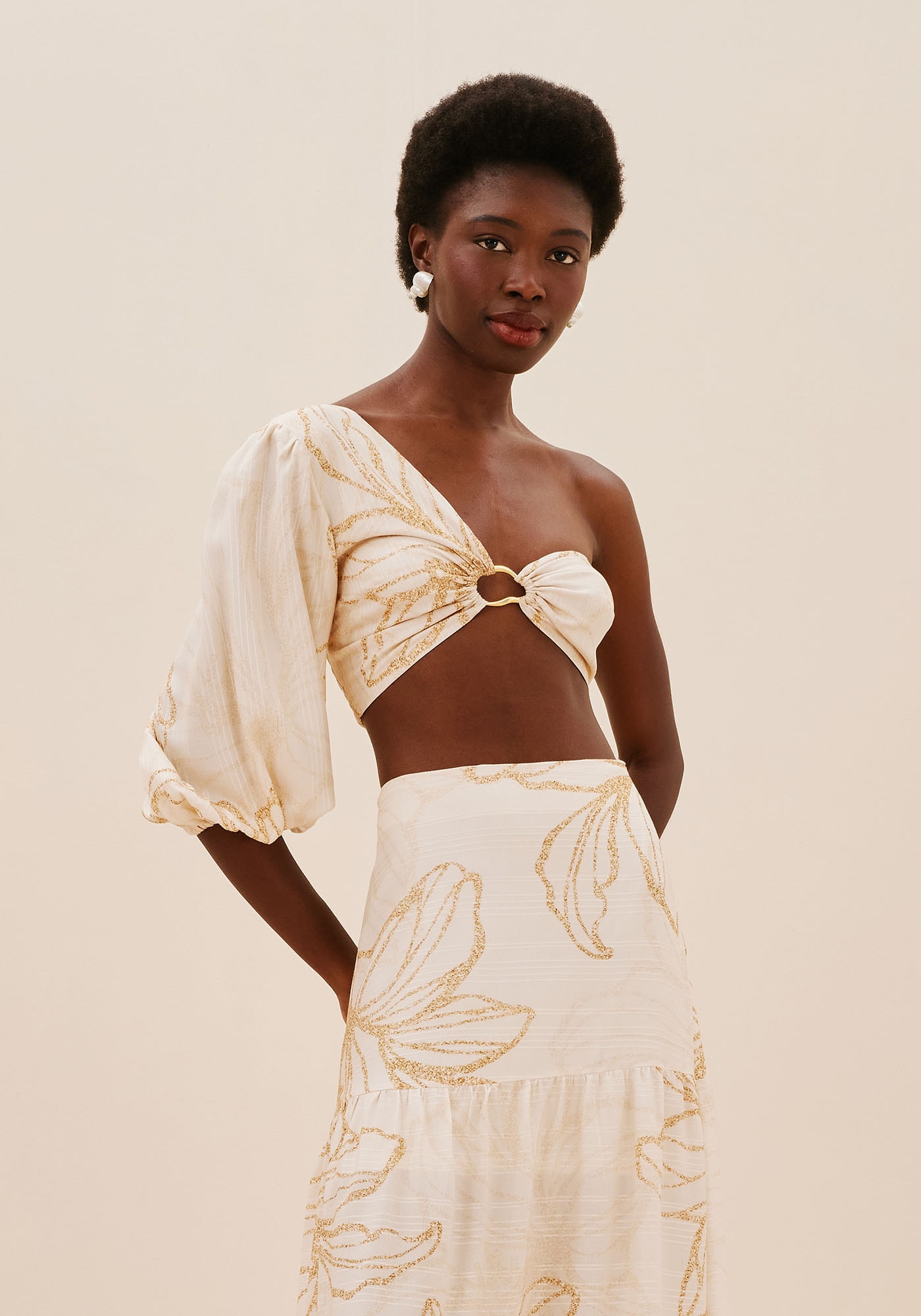 Aposte em um visual moderno echeio de estilo com este Cropped Um Ombro Só. Possui uma manga bufante edetalhe em argola frontal que tornam a peça única, enquanto o lastex na partedas costas garante conforto e um caimento ideal. Sua composição é de 100%Viscose.