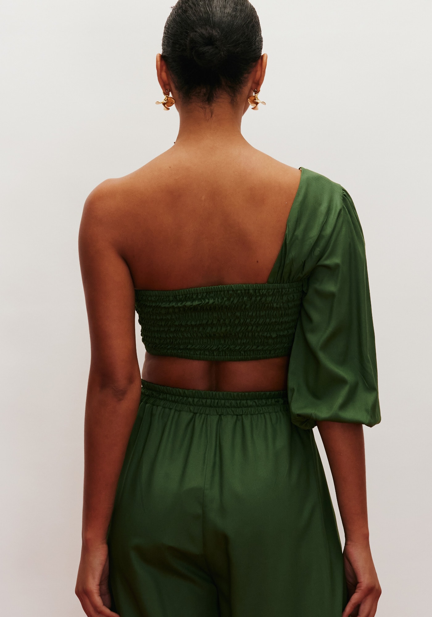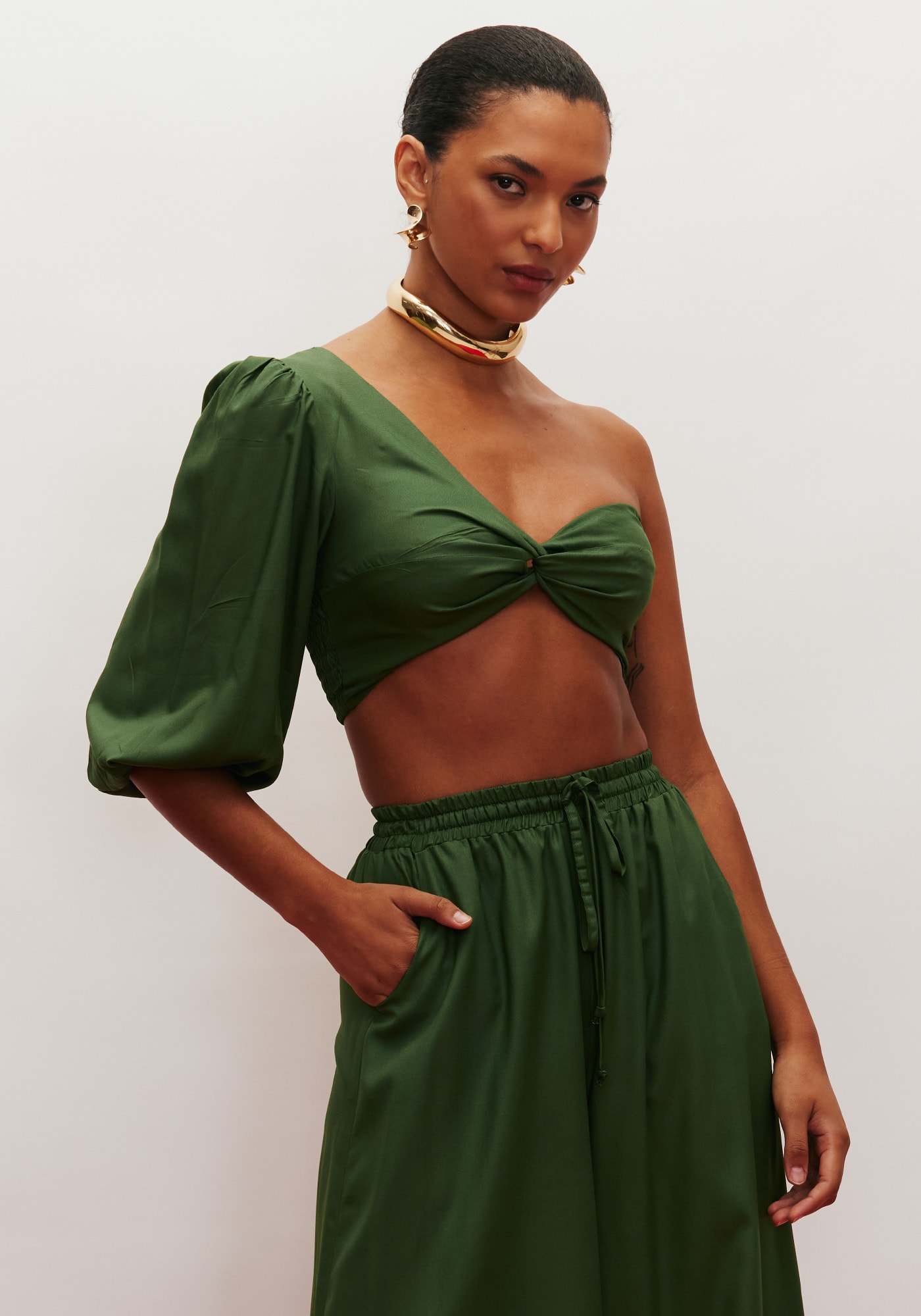 Confeccionado em tecido 100%viscose, o cropped é um modelo sexy e fashion. A peça de um ombro só é mais ajustadano corpo e possui o formato do busto. O lastex nas costas facilita avestibilidade.
