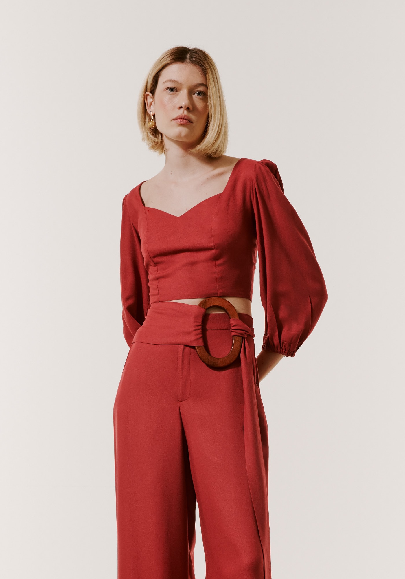 Confeccionado em tecido 100% viscose, o cropped possui manga ¾ bufante comelástico, que pode ser facilmente ajustada. O decote coração valoriza o busto e a silhueta.