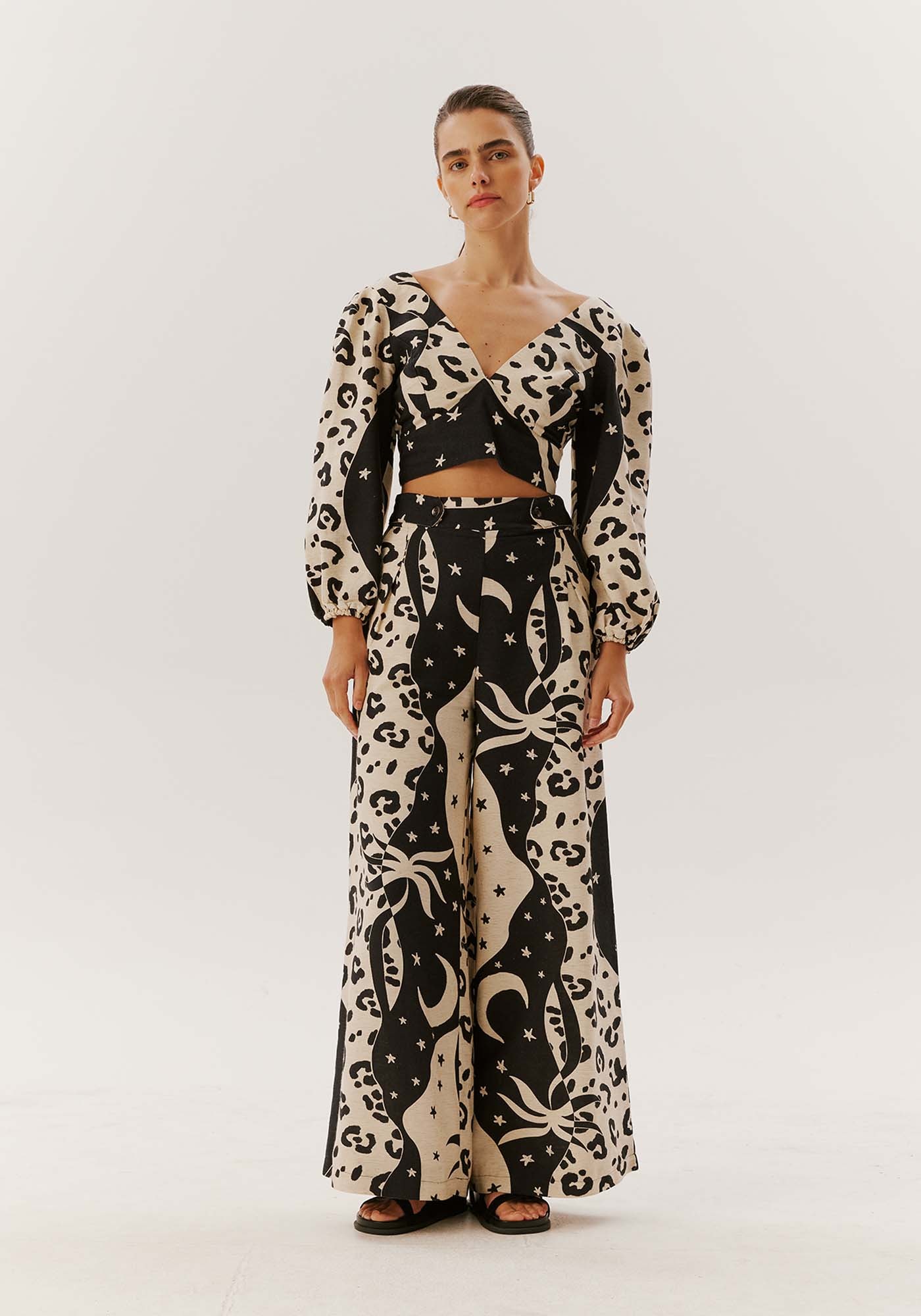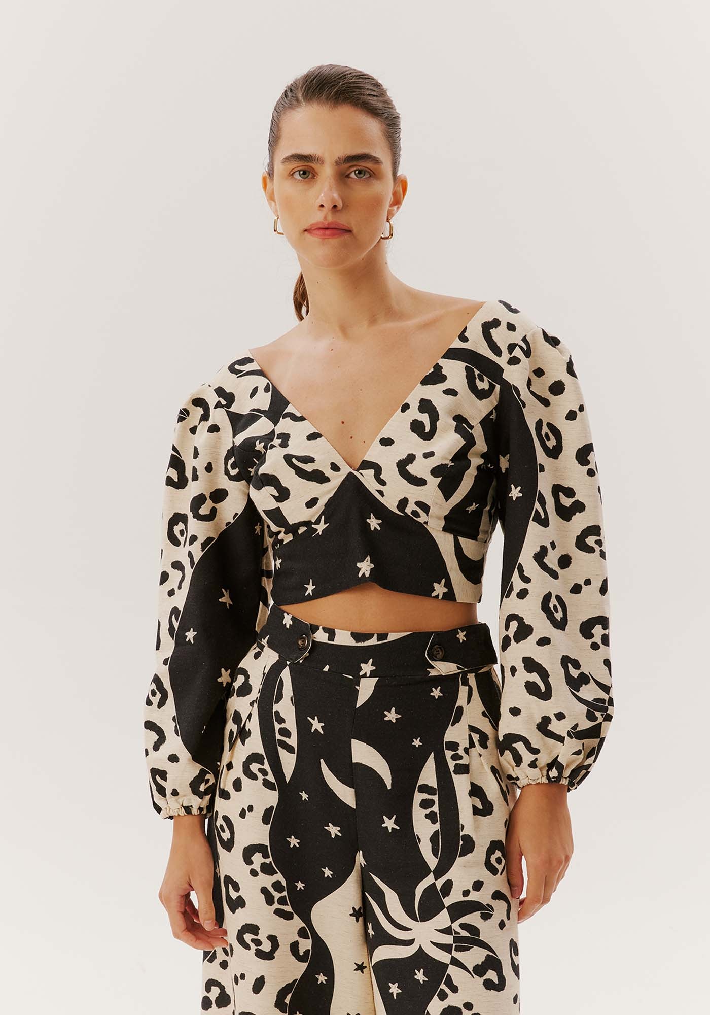 Encantador e singular, este croppedé confeccionado em tecido misto, 42% algodão 38% viscose 14% modal 6% linho eharmoniza elegância e audácia. Suas mangas amplas oferecem conforto, enquanto odecote V acrescenta um toque distinto à peça, tornando-a verdadeiramenteespecial.