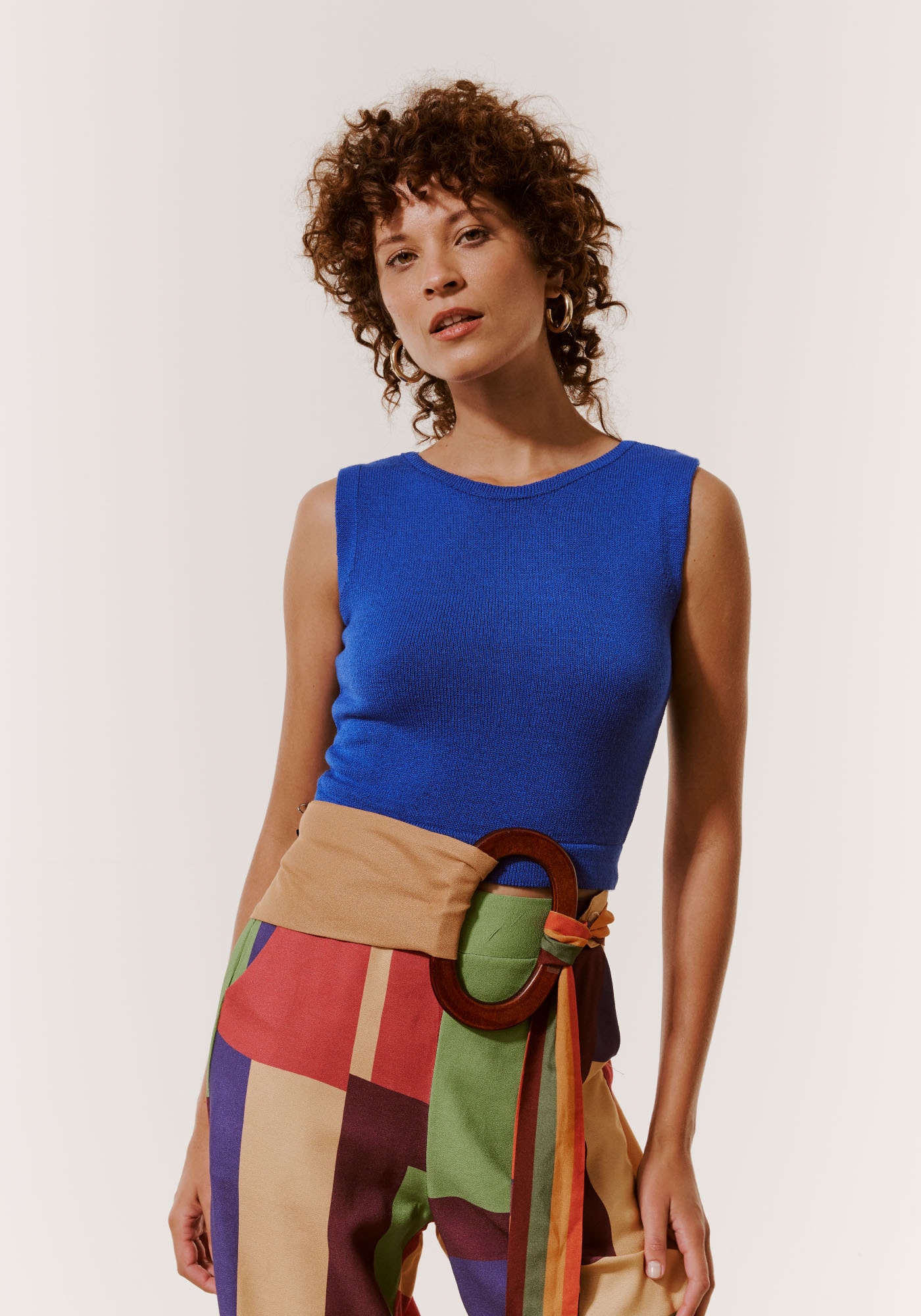 Confeccionado em tricot, o cropped possuidecote alto arredondado. É modelo regata, ajustado ao corpo e sem manga.